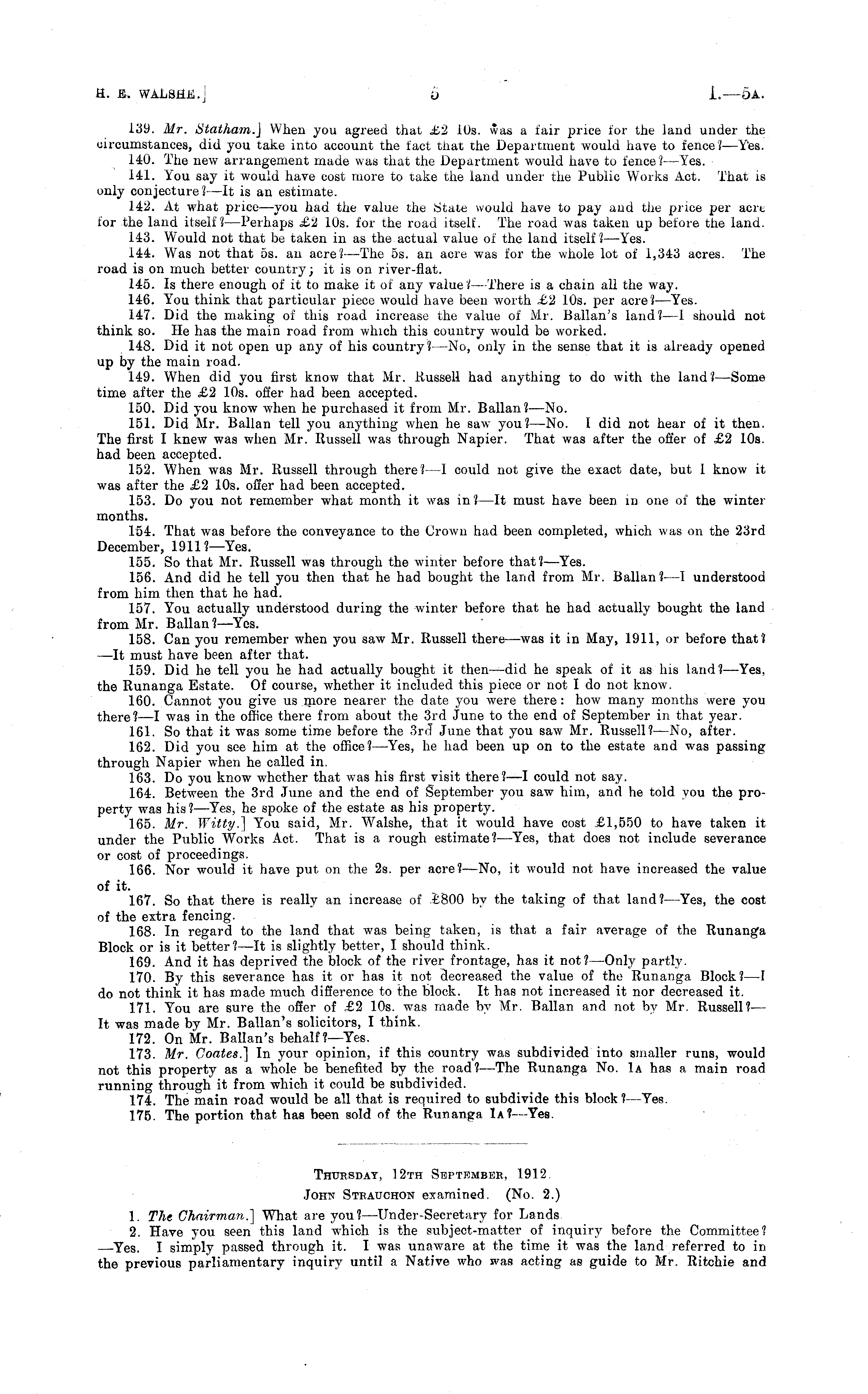 Thursday, 12th September, 1912. John Strauchon examined. (No. 2.) 1. The Chairman.] What are you?—Under-Secretary for Lands 2. Have you seen this land which is the subject-matter of inquiry before the Committee? —Yes. I simply passed through it. I was unaware at the time it was the land referred to in the previous parliamentary inquiry until a Native who was acting as guide to Mr. Ritchie and