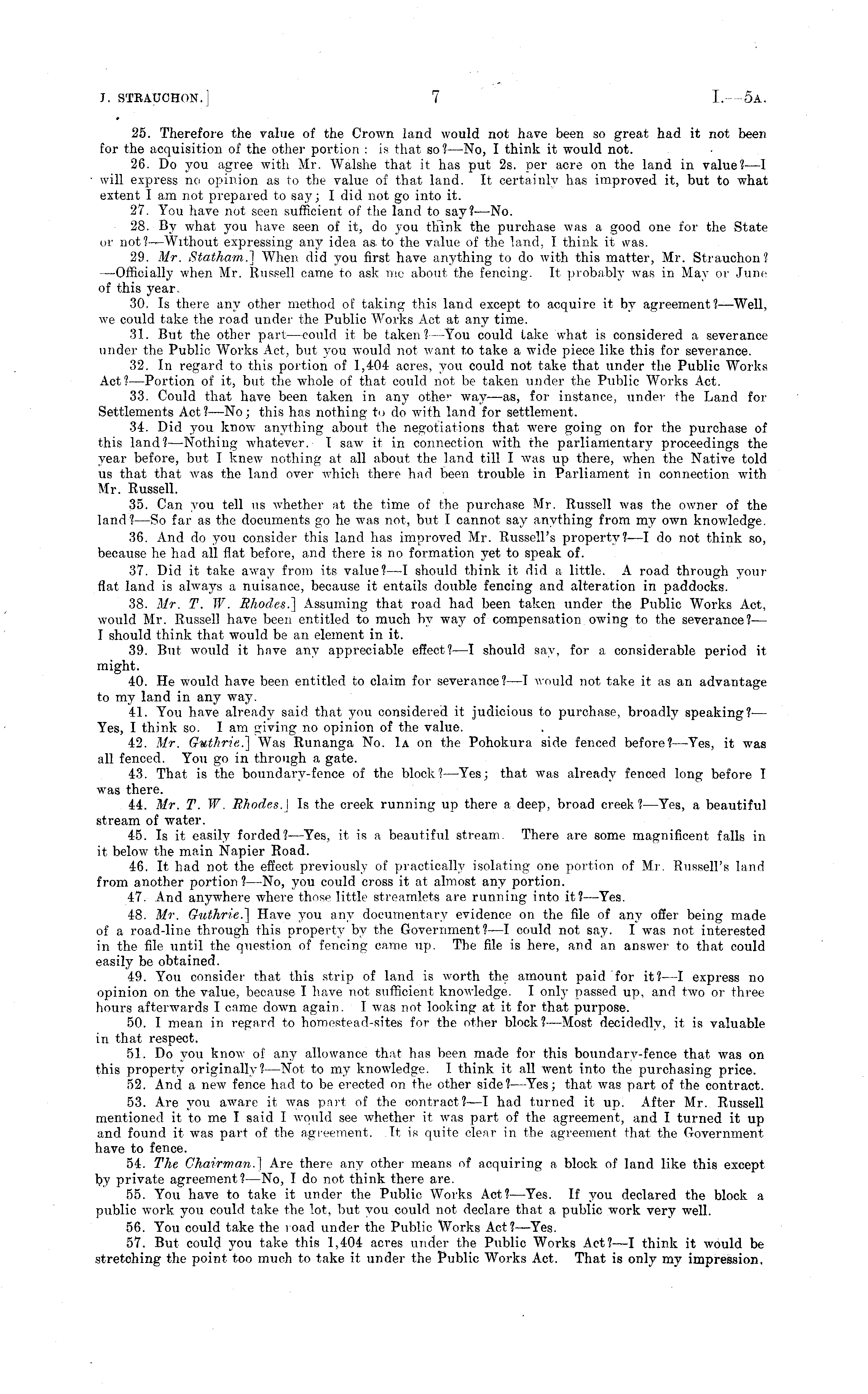 25. Therefore the value of the Crown land would not have been so great had it not been for the acquisition of the other portion : is that so? —No, I think it would not. 26. Do you agree with Mr. Walshe that it has put 2s. per acre on the land in value? —1 will express no opinion as to the value of that land. It certainly has improved it, but to what extent I am not prepared to say; I did not go into it. 27. You have not seen sufficient of the land to say? —No. 28. By what you have seen of it, do you think the purchase was a good one for the State or not?—-Without expressing any idea as to the value of the land, I think it was. 29. Mr. Statham.] When did you first have anything to do with this matter, Mr. Strauchon? —Officially when Mr. Russell came to ask me about the fencing. It probably was in May or June of this year. 30. Is there any other method of taking this land except to acquire it by agreement?—Well, we could take the road under the Public Works Act at any time. 31. But the other part —could it be taken?—You could take what is considered a severance under the Public Works Act, but you would not want to take a wide piece like this for severance. 32. In regard to this portion of 1,404 acres, you could not take that under the Public Works Act? —Portion of it, but the whole of that could not be taken under the Public Works Act. 33. Could that have been taken in any way—as, for instance, under the Land for Settlements Act? —No; this has nothing to do with land for settlement. 34. Did you know anything about the negotiations that were going on for the purchase of this land? —Nothing whatever. I saw it in connection with the parliamentary proceedings the year before, but I knew nothing at all about the land till I was up there, when the Native told us that that was the land over which there had been trouble in Parliament in connection with Mr. Russell. 35. Can you tell us whether at the time of the purchase Mr. Russell was the owner of the land? —So far as the documents go he was not, but I cannot say anything from my own knowledge. 36. And do you consider this land has improved Mr. Russell's property?-—I do not think so, because he had all flat before, and there is no formation yet to speak of. 37. Did it take away from its value?—l should think it did a little. A road through your flat land is always a nuisance, because it entails double fencing and alteration in paddocks. 38. Mr. T. W. Rhodes.] Assuming that road had been taken under the Public Works Act, would Mr. Russell have been entitled to much by way of compensation owing to the severance?— I should think that would be an element in it. 39. But would it have any appreciable effect?—l should say, for a considerable period it might. 40. He would have been entitled to claim for severance?—l would not take it as an advantage to my land in any way. 41. You have already said that you considered it judicious to purchase, broadly speaking? — Yes, I think so. lam giving no opinion of the value. 42. Mr. Guthrie.] Was Runanga No. 1a on the Pohokura side fenced before? —Yes, it was all fenced. You go in through a gate. 43. That is the boundary-fence of the block?—Yes; that was already fenced long before I was there. 44. Mr. T. W. Rhodes.] Is the creek running up there a deep, broad creek?—Yes, a beautiful stream of water. 45. Is it easily forded? —Yes, it is a beautiful stream. There are some magnificent falls in it below the main Napier Road. 46. It had not the effect previously of practically isolating one portion of Mr. Russell's land from another portion I —No, you could cross it at almost any portion. 47. And anywhere where those little streamlets are running into it? —Yes. 48. Mr. Guthrie.] Have you any documentary evidence on the file of any offer being made of a road-line through this property by the Government? —I could not say. I was not interested in the file until the question of fencing came up. The file is here, and an answer to that could easily be obtained. 49. You consider that this strip of land is worth the amount paid for it? —I express no opinion on the value, because I have not sufficient knowledge. I only passed up, and two or three hours afterwards I came down again. I was not looking at it for that purpose. 50. I mean in regard to homestead-sites for the other block ?—Most decidedly, it is valuable in that respect. 51. Do you know of any allowance that has been made for this boundarv-fence that was on this property originally?—Not to my knowledge. I think it all went into the purchasing price. 52. And a new fence had to be erected on the other side? —Yes; that was part of the contract. 53. Are you aware it was part of the contract?—l had turned it up. After Mr. Russell mentioned it to me I said I would see whether it was part of the agreement, and I turned it up and found it was part of the agreement. It is quite clear in the agreement that the Government have to fence. 54. The Chairman.] Are there any other means of acquiring a block of land like this except by private agreement? —No, I do not think there are. 55. You have to take it under the Public Works Act?—Yes. If you declared the block a public work you could take the lot, but vou could not declare that a public work very well. 56. You could take the road under the Public Works Act?—Yes. 57. But could you take this 1,404 acres under the Public Works Act?—l think it would be stretching the point too much to take it under the Public Works Act. That is only my impression.