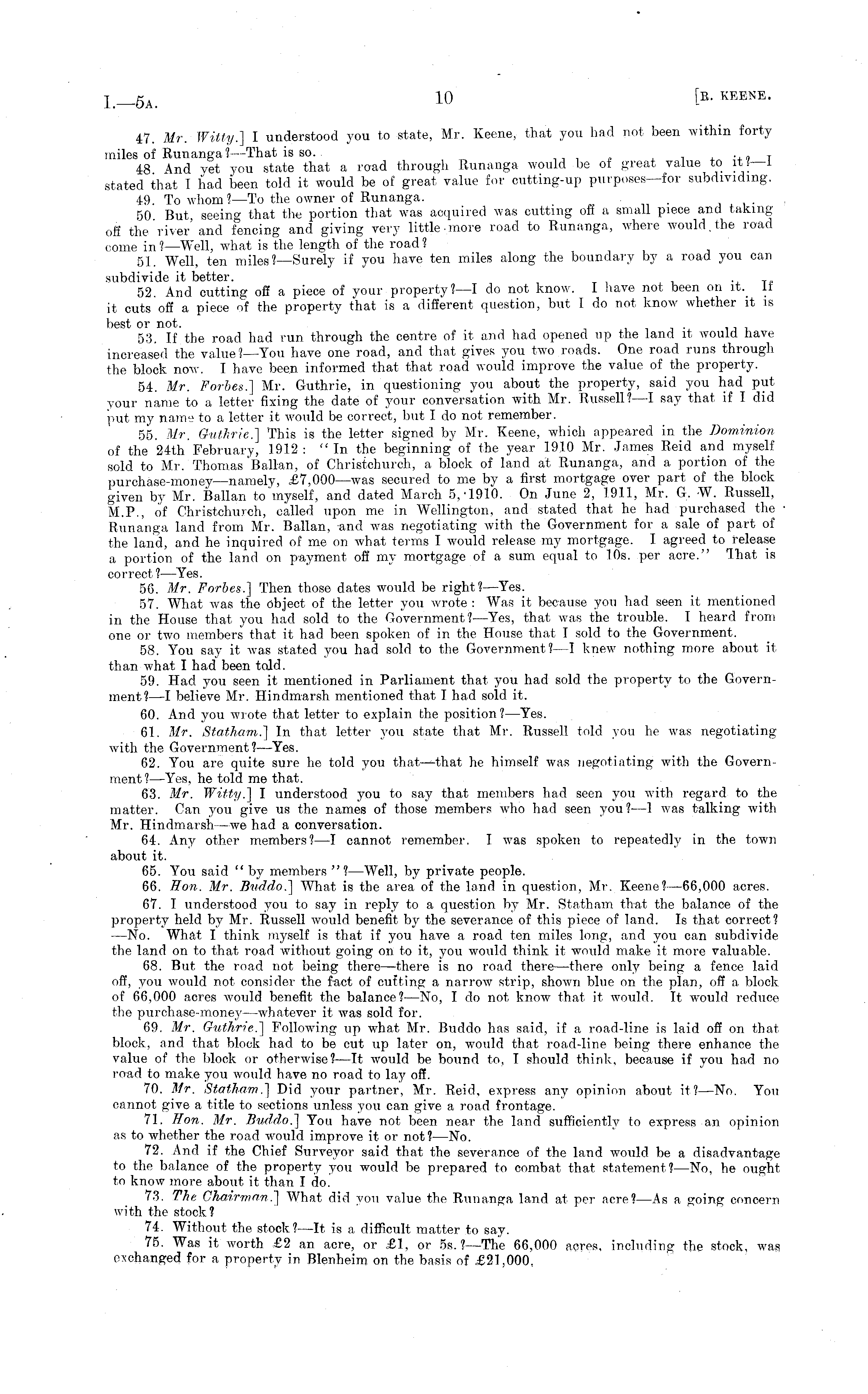 47. Mr. Witty.] I understood you to state, Mr. Keene, that you had not been within forty miles of Runanga?—That is so. 48 And vet you state that a road through Runanga would be of great value to it J—l stated that I had been told it would be of great value for cutting-up purposes—for subdividing. 49. To whom? —To the owner of Runanga. . 50 But seeing that the portion that was acquired was cutting off a small piece and taking off the river'and fencing and giving very little more road to Runanga, where would the road come in ? —Well, what is the length of the road ? 51. Well, ten miles?—Surely if you have ten miles along the boundary by a road you can subdivide it better. 52. And cutting off a piece of your property? —T do not know. I have not been on it. It it cuts off a piece of the property that is a different question, but I do not know whether it is best or not. 53. If the road had run through the centre of it and had opened up the land it would have increased the value?—You have one road, and that gives you two roads. One road runs through the block now. I have been informed that that road would improve the value of the property. 54. Mr. Forbes.] Mr. Guthrie, in questioning you about the property, said you had put your name to a letter fixing the date of your conversation with Mr. Russell?—l say that if I did put my name to a letter it would be correct, but I do not. remember. 55. Mr. Guthrie.] This is the letter signed by Mr. Keene, which appeared in the Dominion of the 24th February, 1912: "In the beginning" of the year 1910 Mr. James Reid and myself sold to Mr. Thomas'Ballan, of Christchurch, a block of land at Runanga, and a portion of the purchase-money —namely, £7,000 —was secured to me by a first mortgage over part of the block given by Mr. Ballan to myself, and dated March 5,-1910. On June 2, 1911, Mr. G, W. Russell, M.P., of Christchurch, called upon me in AVellington, and stated that he had purchased the Runanga land from Mr. Ballan, and was negotiating with the Government for a sale of part of the land, and he inquired of me on what terms I would release my mortgage. I agreed to release a portion of the land on payment off my mortgage of a sum equal to 10s. per acre." That is correct? —Yes. 56. Mr. Forbes.] Then those dates would be right?—Yes. 57. What was the object of the letter you wrote : Was it because you had seen it mentioned in the House that you had sold to the Government? —Yes, that was the trouble. I heard from one or two members that it had been spoken of in the House that I sold to the Government. 58. You say it was stated you had sold to the Government? —I knew nothing more about it than what I had been told. 59. Had you seen it mentioned in Parliament that you had sold the property to the Government?—l believe Mr. Hindmarsh mentioned that I had sold it. 60. And you wrote that letter to explain the position?—Yes. 61. Mr. Statham.] In that letter you state that Mr. Russell told you he was negotiating with the Government? —Yes. 62. You are quite sure he told you that —that he himself was negotiating with the Government?—Yes, he told me that. 63. Mr. Witty.] I understood you to say that members had seen you with regard to the matter. Can you give us the names of those members who had seen j^ou? —1 was talking with Mr. Hindmarsh—we had a conversation. 64. Any other members? —I cannot remember. I was spoken to repeatedly in the town about it. 65. You said " by members "1 —Well, by private people. 66. Hon. Mr. Buddo.] What is the area of the land in question, Mr. Keene? —66,000 acres. 67. I understood you to say in reply to a question by Mr. Statham that the balance of the property held by Mr. Russell -would benefit by the severance of this piece of land. Is that correct? —No. What I think myself is that if you have a road ten miles long, and you can subdivide the land on to that road without going on to it, you would think it would make it more valuable. 68. But the road not being there—there is no road there —there only being a fence laid off, you would not consider the fact of cufting a narrow strip, shown blue on the plan, off a block of 66,000 acres would benefit the balance?—No, I do not know that it would. It would reduce the purchase-money —whatever it was sold for. 69. Mr. Guthrie.] Following up what Mr. Buddo has said, if a road-line is laid off on that block, and that block had to be cut up later on, would that road-line being there enhance the value of the block or otherwise?—lt would be bound to, I should think, because if you had no road to make you would have no road to lay off. 70. Mr. Statham.] Did your partner, Mr. Reid, express any opinion about it?—No. You cannot give a title to sections unless you can give a road frontage. 71. Hon. Mr. Buddo.] You have not been near the land sufficiently to express an opinion as to whether the road would improve it or not?—No. 72. And if the Chief Surveyor said that the severance of the land would be a disadvantage to the balance of the property you would be prepared to combat that statement? —No, he ought to know more about it than I do. 73. The Chairman.] AVhat did you value the Runanga land at per acre?—As a going concern with the stock? 74. Without the stock?—lt is a difficult matter to say. 75. Was it worth £2 an acre, or £1, or ss.? —The 66,000 acres, including the stock, was exchanged for a property in Blenheim on the basis of £21,000,