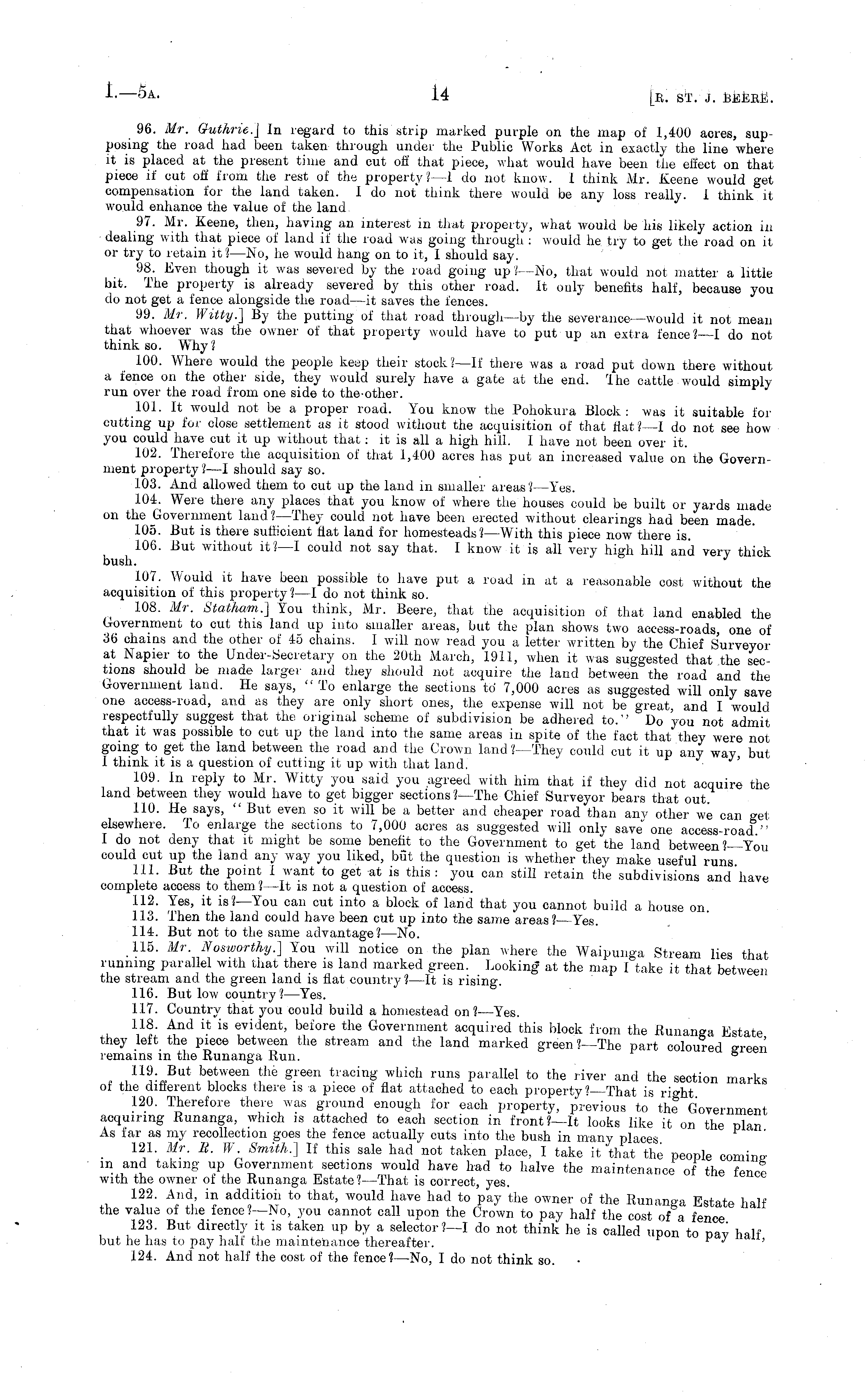 96. Mr. Guthrie.] In regard to this strip marked purple on the map of 1,400 acres, supposing the road had been taken through under the Public Works Act in exactly the line where it is placed at the present time and cut off that piece, what would have been the effect on that piece if cut off from the rest of the property? —1 do not know. I think Mr. Keene would get compensation for the land taken. 1 do not think there would be any loss really. 1 think it would enhance the value of the land 97. Mr. Keene, then, having an interest in that property, what would be his likely action in dealing with that piece of land if the road was going through : would he try to get the road on it or try to retain it?—No, he would hang on to it, I should say. 98. Even though it was severed by the road going up? —No, that would not matter a little bit. The property is already severed by this other road. It only benefits half, because you do not get a fence alongside the road—it saves the fences. 99. Mr. Witty.] By the putting of that road through—by the severance—would it not mean that whoever was the owner of that property would have to put up an extra fence?—! do not think so. Why? 100. Where would the people keep their stock?—lf there was a road put down there without a fence on the other side, they would surely have a gate at the end. Ihe cattle would simplyrun over the road from one side to the-other. 101. It would not be a proper road. You know the Pohokura Block: was it suitable for cutting up for close settlement as it stood without the acquisition of that flat?—l do not see how you could have cut it up without that: it is all a high hill. I have not been over it. 102. Therefore the acquisition of that 1,400 acres has put an increased value on the Government property ?—I should say so. 103. And allowed them to cut up the land in smaller areas? —Y'es. 104. Were there any places that you know of where the houses could be built or yards made on the Government land?—They could not have been erected without clearings had been made. 105. But is there sufficient flat land for homesteads? —With this piece now there is. 106. But without it? —1 could not say that. 1 know it is all very high hill and very thick bush. J 107. Would it have been possible to have put a road in at a reasonable cost without the acquisition of this property?—l do not think so. 108. Mr. Statham.] You think, Mr. Beere, that the acquisition of that land enabled the Government to cut this land up into smaller areas, but the plan shows two access-roads one of 36 chains and the other of 45 chains. 1 will now read you a letter written by the Chief Surveyor at Napier to the Under-Secretary on the 20th March, 1911, when it was suggested that the sections should be made larger and they should not acquire the land between the road and the Government land. He says, "To eularge the sections to 7,000 acres as suggested will only save one access-road, and as they are only short ones, the expense will not be great, and I would respectfully suggest that the original scheme of subdivision be adhered to." Do you not admit that it was possible to cut up the land into the same areas in spite of the fact that they were not going to get the land between the road and the Crown land?—They could cut it up any way but I think it is a question of cutting it up with that land. 109. In reply to Mr. Witty you said you agreed with him that if they did not acquire the land between they would have to get bigger sections ?—The Chief Surveyor bears that out. 110. He says, " But even so it will be a better and cheaper road than any other we can get elsewhere. To enlarge the sections to 7,000 acres as suggested will only save" one access-road" I do not deny that it might be some benefit to the Government to get the land between?—You could cut up the land an)- way you liked, but the question is whether they make useful runs 111. But the point I want to get at is this: you can still retain the subdivisions and'have complete access to them ? —lt is not a question of access. 112. Yes, it is?—You can cut into a block of land that you cannot build a house on. 113. Then the land could have been cut up into the same areas? —Yes. 114. But not to the same advantage?—No. 115. Mr. Nosworthy.] You will notice on the plan where the Waipunga Stream lies that running parallel with that there is land marked green. Looking at the map I take it that between the stream and the green land is flat country ?—lt is rising. 116. But low country ? —Yes. 1.17. Country that you could build a homestead on?—Yes. 118. And it is evident, before the Government acquired this block from the Runanga Estate they left the piece between the stream and the land marked green ?—The part coloured green remains in the Runanga Run. ° . , n ?:- But b f* we , en * he S' reen facing which runs parallel to the river and the section marks ot the different blocks there is a piece of flat attached to each property? That is ri°ht 120. Therefore there was ground enough for each property, previous to' the Government acquiring Runanga, which is attached to each section in front?—lt looks like it on the plan' As far as my recollection goes the fence actually cuts into the bush in many places 121. Mr. R. W Smith.] If this sale had not taken place, I take it that the people coming in and taking up Government sections would have had to halve the maintenance of the fence with the owner of the Runanga Estate? —That is correct, yes. 122. And in addition to that, would have had to pay the owner of the Runanga Estate half the value of the fence!—No, you cannot call upon the Crown to pay half the cost of a fence 123. But directly it is taken up by a selector?—l do not think he is called upon to pav half but he has to pay half the maintenance thereafter. F y ' 124. And not half the cost of the fence? —No, I do not think so.