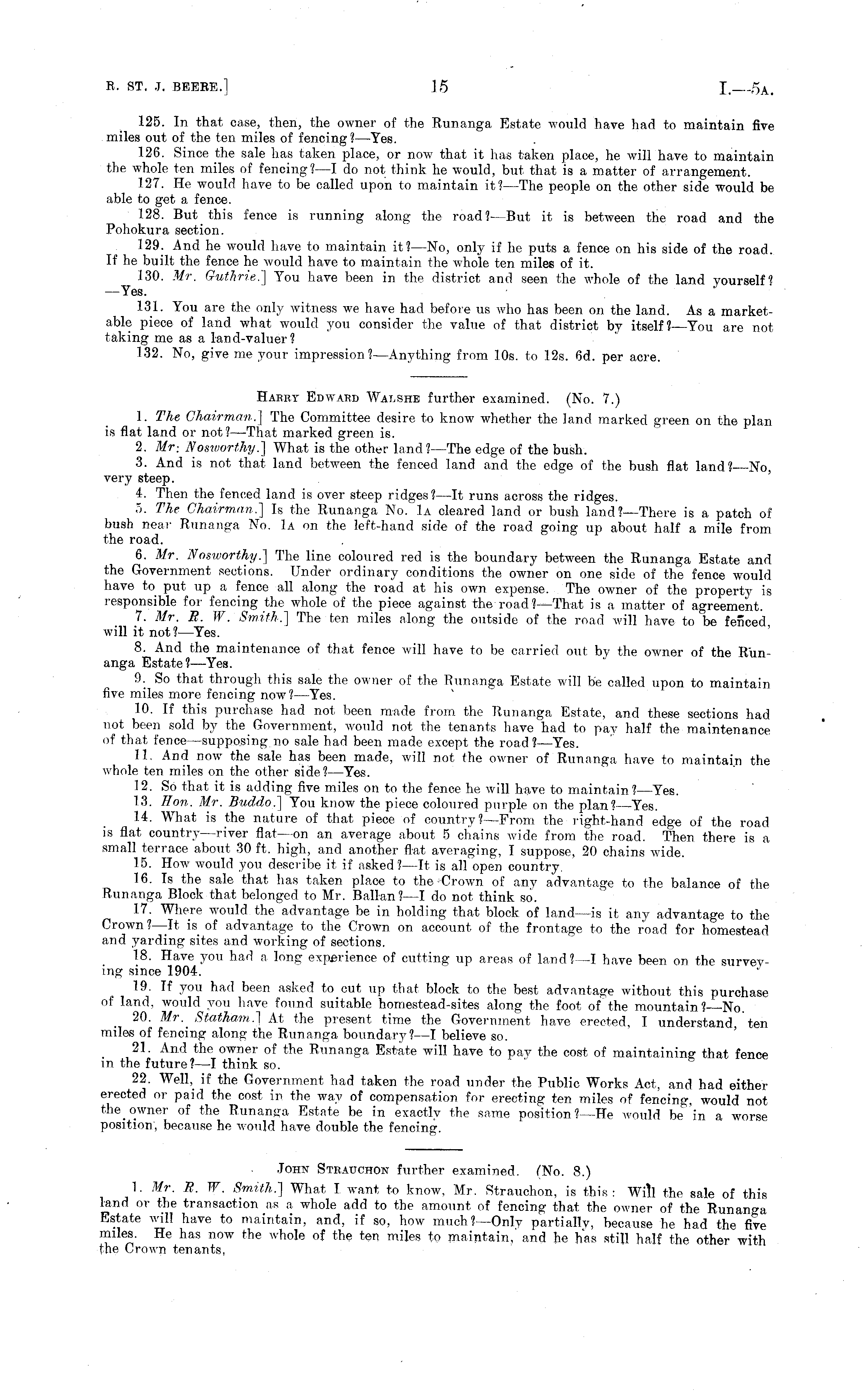 Habrt Edward Walshe further examined. (No. 7.) 1. The Chairman.] The Committee desire to know whether the land marked green on the plan is flat land or not ?—That marked green is. 2. Mr : Nosworthy.] What is the other land? —The edge of the bush. 3. And is not that land between the fenced land and the edge of the bush flat land? —No, very steep. 4. Then the fenced land is over steep ridges?—lt runs across the ridges. 5. The Chairman.] Is the Runanga No. 1a cleared land or bush land?—There is a patch of bush near Runanga No. 1a on the left-hand side of the road going up about half a mile from the road. 6. Mr. Nostvorthy.] The line coloured red is the boundary between the Runanga Estate and the Government sections. Under ordinary conditions the owner on one side of the fence would have to put up a fence all along the road at his own expense. The owner of the property is responsible for fencing the whole of the piece against the road?—That is a matter of agreement. 7. Mr. R. W. Smith.] The ten miles along the outside of the road will have to be fenced, will it not?—Yes. 8. And the maintenance of that fence will have to be carried out by the owner of the Runanga Estate?—Yes. 9. So that through this sale the owner of the Runanga Estate will be called upon to maintain five miles more fencing now? —Yes. 10. If this purchase had not been made from the Runanga Estate, and these sections had not been sold by the Government, would not the tenants have had to pay half the maintenance of that fence—supposing no sale had been made except the road?—Yes. 11. And now the sale has been made, will not the owner of Runanga. have to maintain the whole ten miles on the other side? —Yes. 12. So that it is adding five miles on to the fence he will have to maintain?—Yes. 13. Hon. Mr. Buddo.] You know the piece coloured purple on the plan?—Yes. 14. What is the nature of that piece of country?—From the right-hand edge of the road is flat country—river flat —on an average about 5 chains wide from the road. Then there is a small terrace about 30 ft. high, and another flat averaging, I suppose, 20 chains wide. 15. How would you describe it if asked? —It is all open country. 16. Is the sale that has taken place to the Crown of any advantage to the balance of the Runanga Block that belonged to Mr. Ballan? —I do not think so. 17. Where would the advantage be in holding that block of land—is it any advantage to the Crown?—lt is of advantage to the Crown on account of the frontage to the road for homestead and yarding sites and working of sections. 18. Have you had a long experience of cutting up areas of land?—l have been on the surveying since 1904. 19. If you had been asked to cut up that block to the best advantage without this purchase of land, would you have found suitable homestead-sites along the foot of the mountain? No. 20. Mr. Statham.'] At the present time the Government have erected, I understand, ten miles of fencing along the Runanga boundary?—l believe so. 21. And the owner of the Runanga Estate will have to pav the cost of maintaining that fence in the future? —I think so. 22. Well, if the Government had taken the road under the Public Works Act, and had either erected or paid the cost in the way of compensation for erecting ten miles of fencing, would not the_ owner of the Runanga Estate be in exactly the same position ?—He would be 'in a worse position, because he would have double the fencing.