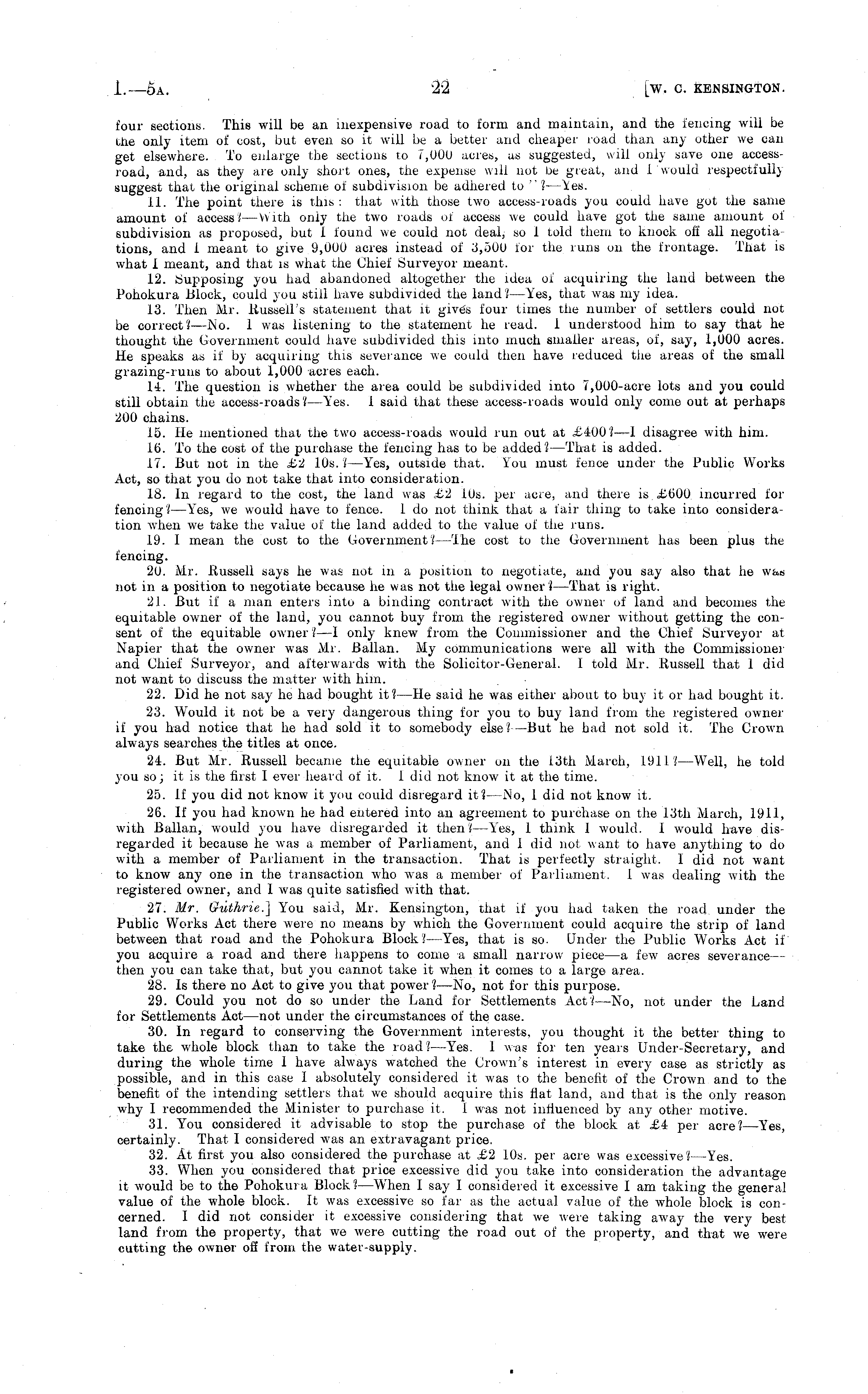 four sections. This will be an inexpensive road to form and maintain, and the fencing will be the only item of cost, but even so it will be a better and cheaper road than any other we can get elsewhere. To enlarge the sections to i,oou acres, as suggested, will only save one accessroad, and, as they are only short ones, the expense will not be great, and I Would respectfully suggest that the original scheme of subdivision be adhered to " ? —Yes. 11. The point there is this: that with those two access-roads you could have got the same amount of access? —With only the two roads ot access we could have got the same amount of subdivision as proposed, but 1 found we could not deal, so I told them to knock off all negotiations, and 1 meant to give 9,000 acres instead of 3,500 lor the runs on the frontage. That is what I meant, and that is what the Chief Surveyor meant. 12. Supposing you had abandoned altogether the idea of acquiring the land between the Pohokura Block, could you still have subdivided the land?—Yes, that was my idea. 13. Then Mr. Russell's statement that it giv6s four times the number of settlers could not be correct? —No. 1 was listening to the statement he read. 1 understood him to say that he thought the Government could have subdivided this into much smaller areas, of, say, 1,000 acres. He speaks as if by acquiring this severance we could then have reduced the areas of the small grazing-runs to about 1,000 acres each. 14. The question is whether the area could be subdivided into 7,000-acre lots and you could still obtain the access-roads? —Yes. 1 said that these access-roads would only come out at perhaps 200 chains. 15. He mentioned that the two access-roads would run out at £400?—I disagree with him. 16. To the cost of the purchase the fencing has to be added?—That is added. 17. But not in the £2 10s.?—Yes, outside that. You must fence under the Public Works Act, so that you do not take that into consideration. 18. In regard to the cost, the land was £2 10s. per acre, and there is. £600 incurred for fencing?—Yes, we would have to fence. 1. do not think that a fair thing to take into consideration when we take the value of the land added to the value of the runs. 19. 1 mean the cost to the Government? —'Ihe cost to the Government has been plus the fencing. 20. Mr. Russell says he was not in a position to negotiate, and you say also that he was not in a position to negotiate because he was not the legal owner ?—That is right. 21. But if a man enters into a binding contract with the owner of land and becomes the equitable owner of the land, you cannot buy from the registered owner without getting the consent of the equitable owner ? —I only knew from the Commissioner and the Chief Surveyor at Napier that the owner was Mr. Ballan. My communications were all with the Commissioner and Chief Surveyor, and afterwards with the Solicitor-General. I told Mr. Russell that 1 did not want to discuss the matter with him. 22. Did he not say he had bought it? —He said he was either about to buy it or had bought it. 23. W 7 ould it not be a very dangerous thing for you to buy land from the registered owner if you had notice that he had sold it to somebody else?-—But he had not sold it. The Crow r n always searches the titles at once. 24. But Air. Russell became the equitable owner on the 13th March, 1911?—Well, he told you so; it is the first I ever heard of it. I did not know it at the time. 25. If you did not know it you could disregard it? —No, 1 did not know it. 26. If you had known he had entered into an agreement to purchase on the 13th March, 1911, with Ballan, would you have disregarded it then?—Y'es, 1 think I would. I would have disregarded it because he was a member of Parliament, and 1 did not want to have anything to do wdth a member of Parliament in the transaction. That is perfectly straight. I did not want to know any one in the transaction who was a member of Parliament. 1 was dealing with the registered owner, and I was quite satisfied with that. 27. Mr. Guthrie.] You said, Mr. Kensington, that if you had taken the road under the Public Works Act there were no means by which the Government could acquire the strip of land between that road and the Pohokura Block? —Yes, that is so. Under the Public AVorks Act if you acquire a road and there happens to come a small narrow piece—a few acres severance — then you can take that, but you cannot take it when it comes to a large area. 28. Is there no Act to give you that power ?—No, not for this purpose. 29. Could you not do so under the Land for Settlements Act?—No, not under the Land for Settlements Act —not under the circumstances of the case. 30. In regard to conserving the Government interests, you thought it the better thing to take the whole block than to take the road?—Yes. 1 was for ten years Under-Secretary, and during the whole time I have always watched the Crown's interest in every case as strictly as possible, and in this case I absolutely considered it was to the benefit of the Crown and to the benefit of the intending settlers that we should acquire this flat land, and that is the only reason why 1 recommended the Minister to purchase it. 1 was not influenced by any other motive. 31. You considered it advisable to stop the purchase of the block at £4 per acre? —Yes, certainly. That I considered was an extravagant price. 32. At first you also considered the purchase at £2 10s. per acre was excessive?—Yes. 33. When you considered that price excessive did you take into consideration the advantage it would be to the Pohokura Block?—When I say I considered it excessive I am taking the general value of the whole block, ft was excessive so far as the actual value of the whole block is concerned. I did not consider it excessive considering that we were taking away the very best land from the property, that we were cutting the road out of the property, and that we w