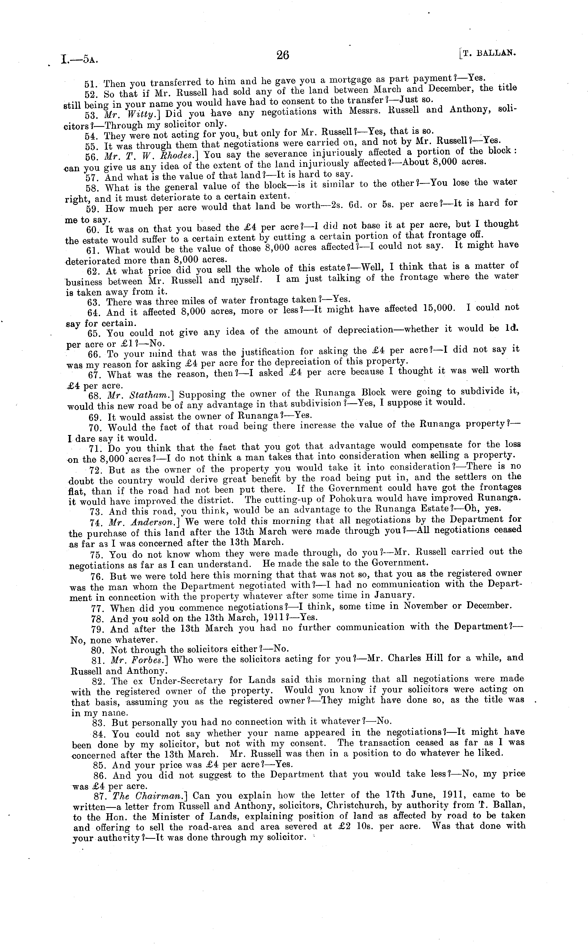 51 Then you transferred to him and he gave you a mortgage as part payment?—Yes 52 So that if Mr. Russell had sold any of the land between March and December, the title still being in your name you would have had to consent to the transfer ?—Just SO. 53 Mr Witty.] Did you have any negotiations with Messrs. Russell and Anthony, solicitors?—Through my solicitor only. _ 54. They were not acting for you, but only for Mr. Russell?—Yes, that is so. 55. It was through them that negotiations were carried on and not by Mr. Russell?-Yes 56 Mr T W Rhodes.] You say the severance injuriously affected a portion ot tne DiocK . oan you give us any idea of the extent of the land injuriously affected i—About 8,000 acres. 57 And what is the value of that land ?—lt is hard to say. 58. What is the general value of the block—is it similar to the other?—You lose the watei right, and it must deteriorate to a certain extent. . 59. How much per acre would that land be worth-2s. 6d. or ss. per acre?—lt is hard for was on that you based the £4 per acre?—l did not base it at per acre but I thought the estate would suffer to a certain extent by cutting a certain portion of that frontage oft 61. AVhat would be the value of those 8,000 acres affected?—l could not say. It might have deteriorated more than 8,000 acres. . . 62 At what price did you sell the whole of this estate!—Well, I think that is a matter of business between Mr. Russell and myself. lam just talking of the frontage where the water is taken away from it. 63. There was three miles of water frontage taken?—Yes. 64. And it affected 8,000 acres, more or less?—lt might have affected 15,000. 1 could not say amount of depreciation—whether it would be Id. per acre or £1? —No. ~ . 66. To your mind that was the justification for asking the £4 per acre?—l did not say it was my reason for asking £4 per acre for the depreciation of this property. 67. What was the reason, then?—l asked £4 per acre because I thought it was well worth £4 per acre. . , ~ ~ •, 68. Mr. Statham.] Supposing the owner of the Runanga Block were going to subdivide it, would this new road be of any advantage in that subdivision ?—Yes, I suppose it would. 69. It would assist the owner of Runanga?—Yes. 70. Would the fact of that road being there increase the value of the Runanga property*— I dare say it would. 71 Do you think that the fact that you got that advantage would compensate tor the loss on the 8,000 acres?—l do not think a man takes that into consideration when selling a property. 72. But as the owner of the property you would take it into consideration? —There is no doubt the country would derive great benefit by the road being put in, and the settlers on the flat than if the road had not been put there. If the Government could have got the frontages it would have improved the district. The cutting-up of Pohokura would have improved Runanga. 73. And this road, you think, would, be an advantage to the Runanga Estate? —Oh, yes. 74. Mr. Anderson.] We were told this morning that all negotiations by the Department for the purchase of this land after the 13th March were made through you?—All negotiations ceased as far as I was concerned after the 13th March. 75. You do not know whom they were made through, do you? —Mr. Russell carried out the negotiations as far as I can understand. He made the sale to the Government. 76. But we were told here this morning that that was not so, that you as the registered owner was the man whom the Department negotiated with? —I had no communication with the Department in connection with the property whatever after some time in January. 77. When did you commence negotiations? —I think, some time in November or December. 78. And you sold on the 13th March, 1911?—Yes. 79. And after the 13th March you had no further communication with the Department?- — No, none whatever. 80. Not through the solicitors either ? —No. 81. Mr. Forbes.] Who were the solicitors acting for you? —Mr. Charles Hill for a while, and Russell and Anthony. 82. The ex Under-Secretary for Lands said this morning that all negotiations were made with the registered owner of the property. Would you know if your solicitors were acting on that basis, assuming you as the registered owner? —Ihey might have done so, as the title was in my name. 83. But personally you had no connection with it whatever? —No. 84. You could not say whether your name appeared in the negotiations? —It might have been done by my solicitor, but not with my consent. The transaction ceased as far as I was concerned after the 13th March. Mr. Russell was then in a position to do whatever he liked. 85. And your price was £4 per acre? —Yes. 86. And you did not suggest to the Department that you would take less? —No, my price was £4 per acre. 87. The Cha.irm,an.] Can you explain how the letter of the 17th June, 1911, came to be wr itten —a letter from Russell and Anthony, solicitors, Christchurch, by authority from t. Ballan, to the Hon. the Minister of Lands, explaining position of land as affected by road to be taken and offering to sell the road-area and area severed at £2 10s. per acre. Was that done with your authority ?—lt was done through my solicitor.