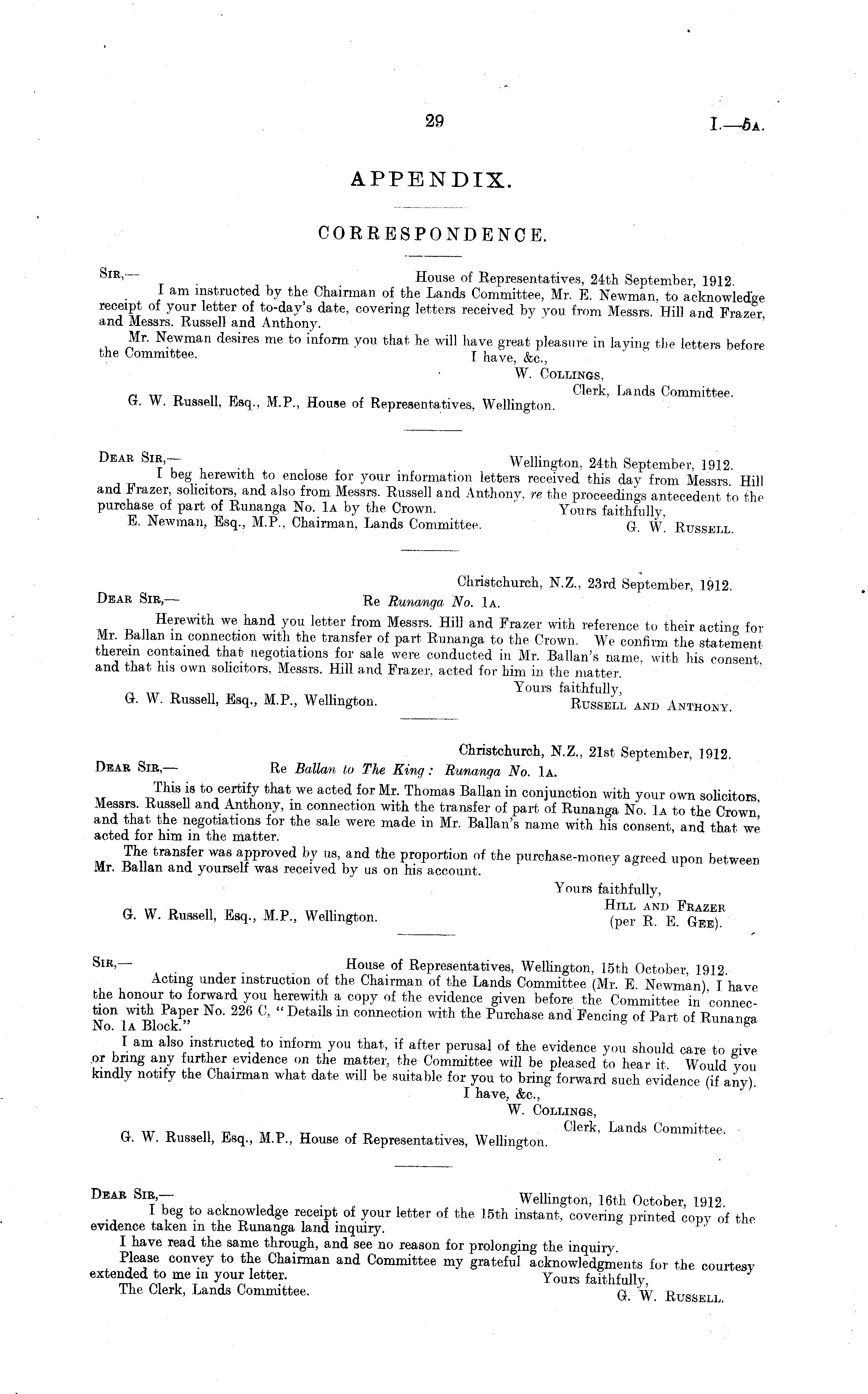 Christchurch, N.Z., 23rd September, 1912. Dear Sir,— Re Runanga No. la. „ 0 „ Herewith we hand you letter from Messrs. Hill and Frazer with reference to their acting for Mr. Ballan m connection with the transfer of part Runanga to the Crown. We confirm the statement therein contained that negotiations for sale were conducted in Mr. Ballan's name with his consent and that Ins own solicitors, Messrs. Hill and Frazer, acted for him in the matter. „_ „ „ „ Yours faithfully, G. W. Russell, Esq., M.P., Wellington. Russell and Anthony.