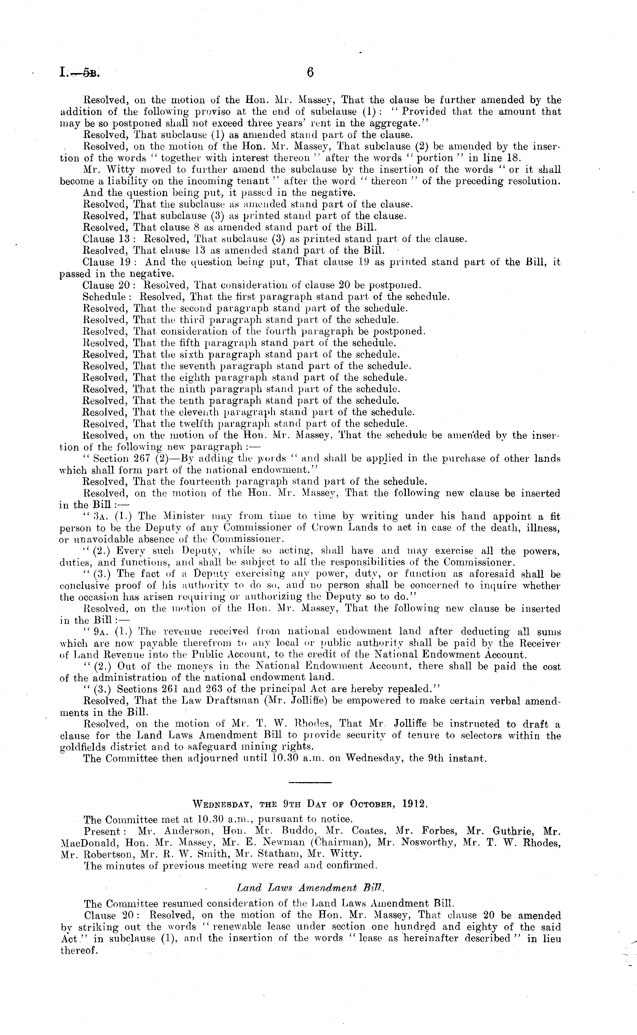 Resolved, on the motion of the Hon. Mr. Massey, That the clause be further amended by the addition of the following proviso at the end of subclause (1) : " Provided that the amount that may be so postponed shall not exceed three years' rent in the aggregate." Resolved, That subclause (1) as amended stand part of the clause. Resolved, on the motion of the Hon. Mr. Massey, That subclause (2) be amended by the insertion of the words " together with interest thereon " after the words " portion " in line 18. Mr. Witty moved to further amend the subclause by the insertion of the words " or it shall become a liability on the incoming tenant " after the word " thereon " of the preceding resolution. And the question being put, it passed in the negative. Resolved, That the subclause as amended stand part of the clause. Resolved, That subclause (3) as printed stand part of the clause. Resolved, That clause 8 as amended stand part of the Bill. Clause 13 : Resolved, That .subclause (3) as printed stand part of the clause. Resolved, That clause 13 as amended stand part of the Bill. Clause 19 : And the question being put, That clause 19 as printed stand part of the Bill, it passed in the negative. Clause 20 : Resolved, That consideration of clause 20 be postponed. Schedule : Resolved, That the first paragraph stand part of the schedule. Resolved, That the second paragraph stand part of the schedule. Resolved, That the third paragraph stand part of the schedule. Resolved, That consideration of the fourth paragraph be postponed. Resolved, That the fifth paragraph stand part of the schedule. Resolved, That the sixth paragraph stand part of the schedule. Resolved, That the seventh paragraph stand part of the schedule. Resolved, That the eighth paragraph stand part of the schedule. Resolved, That the ninth paragraph stand part of the schedule. Resolved, That the tenth paragraph stand part of the schedule. Resolved, That the eleventh paragraph stand part of the schedule. Resolved, That the twelfth paragraph stand part of the schedule. Resolved, on the motion of the Hon. Mi-. Massey, That the schedule be amended by the insertion of the following new paragraph : — " Section 267 (2) —By adding the jvords " and shall be applied in the purchase of other lands which shall form part of the national endowment." Resolved, That the fourteenth paragraph stand part of the schedule. Resolved, on the motion of the Hon. Mr. Massey, That the following new clause be inserted in the Bill :— " 3a. (1.) The Minister may from time to time by writing under his hand appoint a fit person to be the Deputy of any Commissioner of Crown Lands to act in case of the death, illness, or unavoidable absence of the Commissioner. " (2.) Every such Deputy, while so acting, shall have and may exercise all the powers, duties, and functions, and shall be subject to all the responsibilities of the Commissioner. " (3.) The fact of a. Deputy exercising any power, duty, or function as aforesaid shall be conclusive proof of his authority to do so, and no person shall be concerned to inquire whether the occasion has arisen requiring or authorizing the Deputy so to do." Resolved, on the motion of the Hon. Mr. Massey, That the following new clause be inserted in the Bill : — " 9a. (1.) The revenue received from national endowment land after deducting all sums which are now payable therefrom to any local or public authority shall be paid by the Receiver of Land Revenue into the Public Account, to the credit of the National Endowment Account. " (2.) Out of the moneys in the National Endowment Account, there shall be paid the cost of the administration of the national endowonent land. " (3.) Sections 261 and 263 of the principal Act are hereby repealed." Resolved, That the Law Draftsman (Mr. Jolliffe) be empowered to make certain verbal amendments in the Bill. Resolved, on the motion of Mr. T. W. Rhodes, That Mr. Jolliffe be instructed to draft a clause for the Land Laws Amendment Bill to provide security of tenure to selectors within the goldfields district and to safeguard mining rights. The Committee then adjourned until 10.30 a.m. on Wednesday, the 9th instant. Wednesday, the 9th Day op October, 1912. The Committee met at 10.30 a.m., pursuant to notice. Present : Mr. Anderson, Hon. Mr. Buddo,_ Mr. Coates, Mr. Forbes, Mr. Guthrie, Mr. MacDonald, Hon. Mr. Massey, Mr. E. Newman (Chairman), Mr. Nosworthy, Mr. T. W. Rhodes, Mr. Robertson, Mr. R. W. Smith, Mr. Statham, Mr. Witty. The minutes of previous meeting were read and confirmed. Land Laws Amendment Bill. The Committee resumed consideration of the Land Laws Amendment Bill. Clause 20 : Resolved, on the motion of the Hon. Mr. Massey, That clause 20 be amended by striking out the words " renewable lease under section one hundred and eighty of the said Act," in subclause (1), and the insertion of the words "lease as hereinafter described" in lieu thereof.