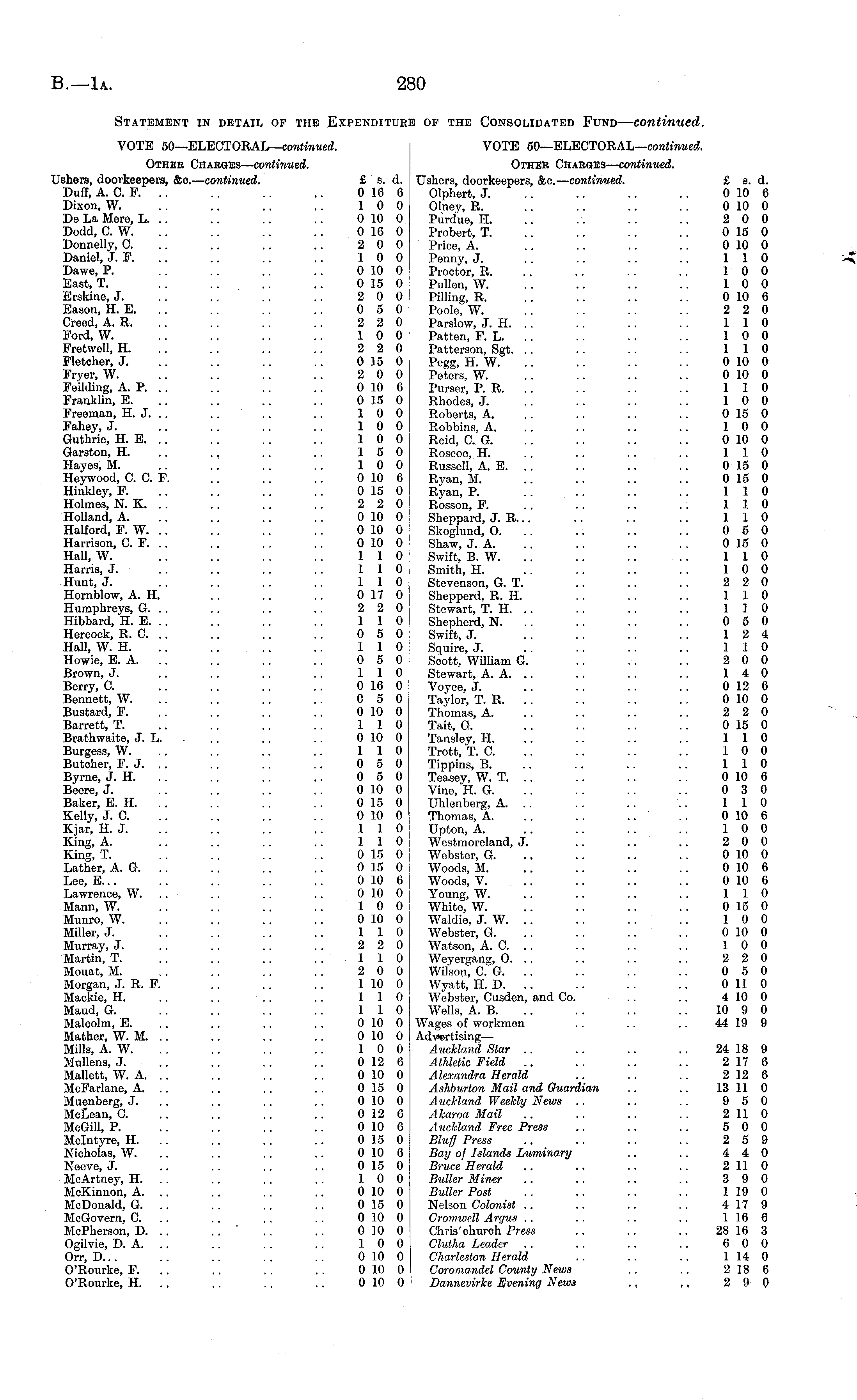 Statement in detail of the Expenditure of the Consolidated Fund— continued. VOTE 50—ELECTORAL— continued. VOTE 60—ELECTORAL— continued. Other Charges— continued. Other Charges— continued. Ushers, doorkeepers, &o.— continued. £ s. d. TJshera, doorkeepers, &c. — continued. £ s. d. Duff, A. C. P. .. .. .. .. 016 6 I Olphert, J. .. .. .. .. 010 6 Dixon, W. .. .. . . .. 10 0 Olney, R. .. .. .. . . 010 0 De La Mere, L. .. .. .. .. 010 0 Purdue, H. .. .. .. .. 2 0 0 Dodd, C. W. .. .. .. .. 016 0 Probert, T. .. .. .. . . 015 0 Donnelly, C. .. .. .. .. 2 0 0 Price, A. .. .. .. .. 010 0 Daniel, J. F. .. .. .. .. 10 0 Penny, J. .. .. .. .. 110 Dawe, P. .. . . .. .. 010 0 ProDtor, R. .. .. . . .. 10 0 East, T. . . .. .. .. 015 0 Pullen, W. . . .. .. .. 10 0 Erskine, J. .. .. .. .. 2 0 0 Pilling, R. .. .. .. .. 010 6 Eason, H. E. .. .. .. 0 5 0 Poole, W. .. .. .. .. 2 2 0 Creed, A. R. .. .. .. .. 2 2 0 Parslow, J. H. . . .. .. .. 110 Ford, W. .. .. .. .. 10 0 Patten, F. L. .. .. .. .. 10 0 Fretwell, H. .. .. .. .. 2 2 0 Patterson, Sgt. .. .. .. .. 110 Fletcher, J. .. .. .. .. 015 0 Pegg, H. W. .. .. .. .. 010 0 Fryer, W. .. .. .. .. 2 0 0 Peters, W. .. .. .. .. 010 0 Feilding, A. P. .. .. .. .. 010 6 Purser, P. R. .. .. .. .. 110 Franklin, E. .. .. .. .. 015 0 Rhodes, J. .. .. .. .. 10 0 Freeman, H. J. .. .. . . .. 10 0 Roberts, A. .. .. .. . . 0 15 0 Fahey, J. .. .. .. .. 10 0 Robbins, A. .. .. .. .. 10 0 Guthrie, H. E. .. .. .. .. 10 0 Reid, C. G. .. .. .. .. 010 0 Garston, H. .. ~ . . .. 15 0 Roscoe, H. .. .. .. . . 110 Hayes, M. .. .. .. . . 10 0 Russell, A. E 015 0 Heywood, C. C. F. .. .. .. 010 6 Ryan, M. .. .. .. .. 015 0 Hinkley, F. .. .. .. .. 015 0 Ryan, P. . . .. .. .. 110 Holmes, N. K. .. .. .. .. 2 2 0 Rosson, F. .. .. .. . . 110 Holland, A. .. .. .. .. 010 0 Sheppard, J. R... .. .. .. 110 Halford, F. W. .. .. .. .. 010 0 Skoglund, O. .. .. .. .. 0 5 0 Harrison, C. F. .. .. .. .. 010 0 Shaw, J. A. .. .. .. .. 015 0 Hall, W. .. .. .. .. 110 Swift, B. W. .. .. .. 110 Harris, J. .. .. .. .. 110 Smith, H. .. .. .. .. 10 0 Hunt, J. .. .. .. .. 110 Stevenson, G. T. .. .. .. 2 2 0 Hornblow, A. H. .. .. .. 017 0 Shepperd, R. H. .. .. .. 110 Humphreys, G. .. .. .. .. 2 2 0 Stewart, T. H. .. .. .. .. 110 Hibbard, H. E. .. .. .. .. 110 Shepherd, N. .. .. .. .. 0 5 0 Hereoek, R. C. .. .. .. .. 0 5 0 Swift, J. . . .. .. . . 12 4 Hall, W. H. .. .. .. .. 110 Squire, J. .. .. .. .. 110 Howie, E. A. .. .. .. .. 0 5 0 Scott, William G. .. .. .. 2 0 0 Brown, J. .. .. .. .. 110 Stewart, A. A. .. . . . . .. 14 0 Berry, C. .. .. .. .. 016 0 Voyce, J. .. .. .. .. 012 6 Bennett, W. .. .. .. .. 0 5 0 Taylor, T. R. .. .. .. .. 010 0 Bustard, F. .. .. .. .. 010 0 Thomas, A. .. . . .. .. 2 2 0 Barrett, T. .. .. .. .. 110 Tait, G. .. .. .. .. 015 0 Brathwaite, J. L. .. .. .. 010 0 Tansley, H. .. .. .. .. 110 Burgess, W. .. .. .. .. 110 Trott, T. C. .. .. .. .. 10 0 Butcher, F. J. .. .. .. .. 0 5 0 Tippins, B. .. .. .. .. 110 Byrne, J. H. .. .. .. 0 5 0 Teasey, W. T. .. .. .. .. 010 6 Beere, J. .. .. .. .. 010 0 Vine, H. G. .. .. .. .. 0 3 0 Baker, E. H. .. .. .. .. 015 0 TJhlenberg, A. .. .. .. .. 110 Kelly, J. C 0 10 0 Thomas, A .. 0 10 6 Kjar, H. J. .. .. .. .. 110 Upton, A. .. . . .. .. 10 0 King, A. .. .. .. .. 110 Westmoreland, J. .. .. .. 2 0 0 King, T. .. .. .. .. 015 0 Webster, G. .. .. .. .. 010 0 Lather, A. G. .. .. .. .. 015 0 Woods, M. .. .. .. .. 010 6 Lee, E... .. .. . . .. 010 6 Woods, V. ... .. .. .. 010 6 Lawrence, W. .. .. .. .. 010 0 Young, W. .. .. .. .. 110 Mann, W. .. .. .. .. 10 0 White, W. .. .. .. .. 015 0 Munro, W. .. .. . . .. 010 0 Waldie, J. W. .. .. . . .. 10 0 Miller, J. .. .. .. .. 110 Webster, G. .. .. .. .. 010 0 Murray, J. .. .. .. .. 2 2 0 Watson, A. C. .. .. .. .. 10 0 Martin, T. .. .. .. .. 110 Weyergang, O. . . .. .. .. 2 2 0 Mouat, M. .. .. .. .. 2 0 0 Wilson, C. G. .. .. .. .. 0 5 0 Morgan, J. R. F. .. .. .. 110 0 Wyatt, H. D. .. .. .. .. 011 0 Mackie, H. .. .. .. .. 110 Webster, Cusden, and Co. .. .. 410 0 Maud, G. .. .. .. .. 110 Wells, A. B. .. .. .. .. 10 9 0 Malcolm, E. .. .. .. .. 010 0 Wages of workmen .. .. .. 44 19 9 Mather, W. M. .. .. .. .. 010 0 AdvertisingMills, A. W. .. .. .. .. 10 0 Auckland Star .. .. .. .. 24 18 9 Mullens, J. .. .. .. . . 012 6 Athletic Field .. .. .. .. 217 6 Mallett, W. A. .. .. .. .. 010 0 Alexandra Herald .. .. .. 212 6 MeFarlane, A. .. .. .. 015 0 Ashburton Mail and Guardian .. .. 13 11 0 Muenberg, J. .. .. .. .. 010 0 Auckland Weekly News .. .. .. 9 5 0 McLean, C. .. .. .. .. 012 6 Alcaroa Mail .. .. .. .. 211 0 McGill, P. .. .. .. .. 010 6 Auckland Free Press .. . . .. 5 0 0 Mclntyre, H. .. .. .. .. 015 0 Bluff Press .. .. .. .. 259 Nicholas, W. .. .. .. .. 010 6 Bay of Islands Luminary .. .. 4 4 0 Neeve, J. .. .. .. .. 015 0 Bruce Herald .. .. .. .. 211 0 McArtney, H. .. .. .. .. 10 0 Buller Miner .. .. .. .. 3 9 0 McKinnon, A. .. . . .. .. 010 0 Buller Post .. .. .. .. 119 0 McDonald, G. .. .. .. .. 015 0 Nelson Colonist .. .. .. .. 417 9 McGovern, C. .. . . .. .. 0 10 0 Cromwell Argus .. .. .. .. 1 16 6 McPherson, D. .. .. .. .. 0 10 0 Chris'church Press .. .. .. 28 16 3 Ogilvie, D. A. .. .. .. .. 10 0 Clutha Leader .. .. .. .. 6 0 0 Orr, D... .. .. .. . . 0 10 0 Charleston Herald .. .. .. 114 0 O'Rourke, F. .. .. .. .. 0 10 0 Coromandel County News .. .. 2 18 6 O'Rourke, H. .. .. ~ 0 10 0 Dannevirke Evening News ~ ~ 2 9 0