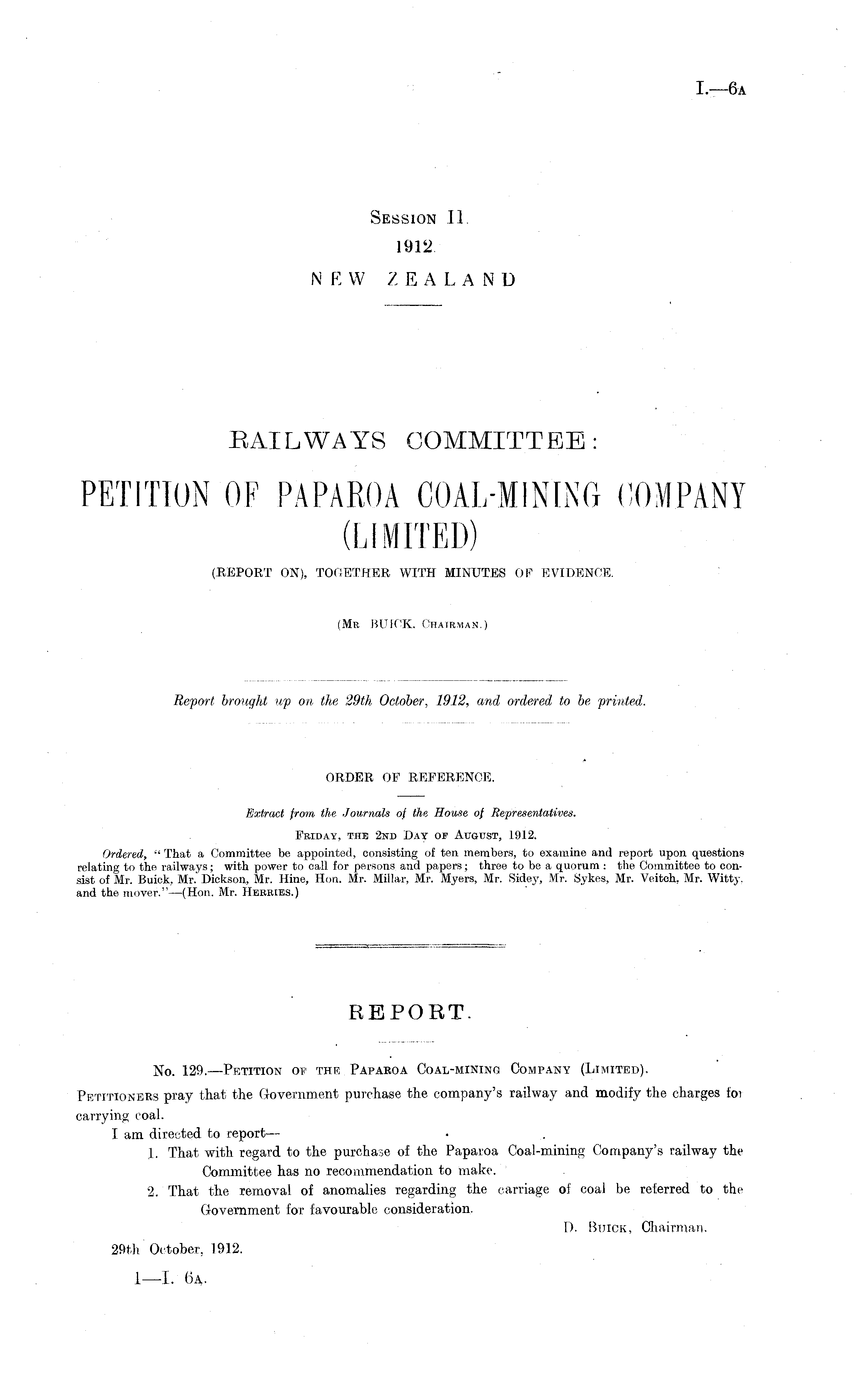 RAILWAYS COMMITTEE: PETITION OF PAPAROA COAL-MINING COMPANY (LIMITED) (REPORT ON), TOGETHER WITH MINUTES OF EVIDENCE. (Mr BUICK. Chairman.)