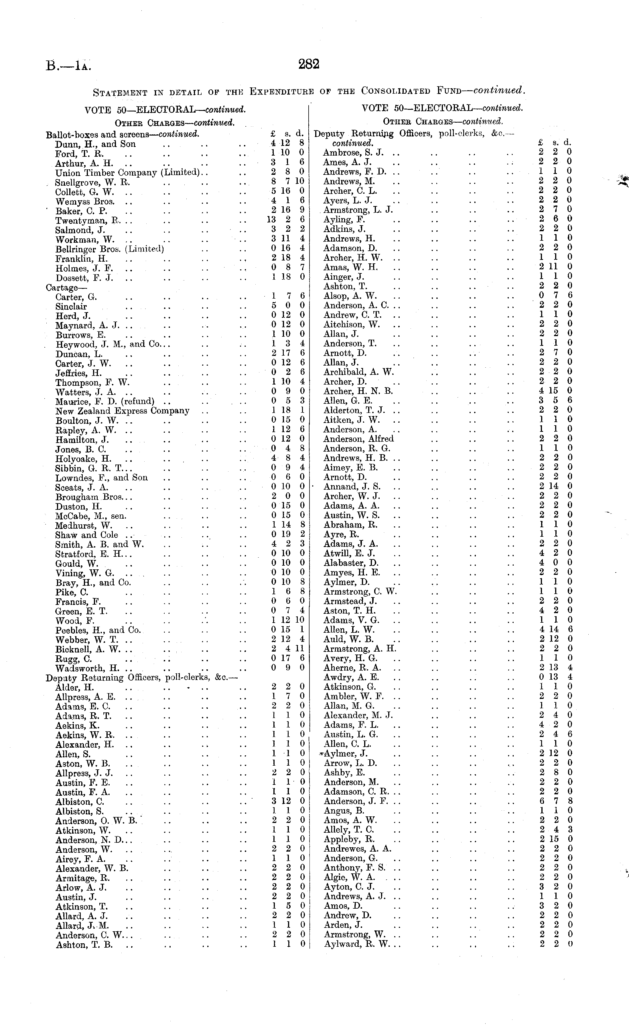 Statement in detail op the Expenditure of the Consolidated Fund — continued. VOTE 50—ELECTORAL— continued. VOTE 50—ELECTORAL— continued. Other Chaeges— continued. Other Charges— continued. Ballot-boxes and screens— continued. £ s. d. Deputy Returning Officers, poll-clerks, &c— Dunn, H., and Son .. .. .. 412 8 continued. £ s. d. Ford, T. R. .. .. .. .. 110 0 Ambrose, S. J. .. .. .. .. 2 2 0 Arthur, A. H. .. .. .. .. 3 16 Ames, A. J. .. .. .. . . 2 2 0 Union Timber Company (Limited).. .. 2 8 0 Andrews, P. D. .. .. .. .. 110 Snellgrove, W. R. .. .. .. 8 710 Andrews, M. .. . . .. .. 2 2 0 Collett, G. W .. .. 516 0 Archer, C. L 2 2 0 Wemyss Bros. .. .. .. .. 4 16 Ayers, L. J. . . .. .. .. 2 2 0 ' Baker, C. P. .. . . .. .. 216 9 Armstrong, L. J. .. .. .. 2 7 0 Twentyman, R. .. .. .. .. 13 2 6 Ayling, F. .. .. .. .. 2 6 0 Salmond, J. .. .. .. .. 3 2 2 Adkins, J. .. .. .. .. 2 2 0 Workman, W. ~ .. .. .. 3 114 Andrews, H. .. .. .. .. 110 Bellringer Bros. (Limited) .. .. 016 4 Adamson, D. .. .. .. .. 2 2 0 Franklin, H. .. .. .. 218 4 Archer, H. W. .. .. .. .. 110 Holmes, J. F. .. .. .. ..087 Amas, W. H. .. .. .. .. 211 0 Doasett, F. J. .. .. .. .. i 18 0 Ainger, J. .. .. .. .. 110 Cartage— Ashton, T. .. .. .. .. 2 2 0 Carter, G 17 6 Alsop, A. W 0 7 6 Sinclair .. .. .. .. 5 0 0 Anderson, A. C. .. .. .. .. 2 2 0 Herd, J. .. .. .. .. 012 0 Andrew, C. T. .. .. .. .. 110 Maynard, A. J. .. .. .. .. 012 0 Aitchison, W. .. .. .. .. 2 2 0 Burrows, E. .. .. .. .. 110 0 Allan, J. .. .. .. .. 2 2 0 Hey wood, J. M., and C 0... .. .. 13 4 Anderson,! 1 . .. .. .. .. 110 Duncan, L. .. .. .. .. 217 6 Arnott, D. .. .. .. .. 2 7 0 Carter, J. W. .. .. .. .. 012 6 Allan, J. .. .. .. .. 2 2 0 Jeffries, H. .. .. .. .. 0 2 6 Archibald, A. W. .. .. .. 2 2 0 Thompson, F. W. .. .. . . 110 4 Archer, D. .. .. .. .. 2 2 0 Watters, J. A. .. .. .. .. 0 9 0 Archer, H. N. B. .. .. .. 415 0 Maurice, F. D. (refund) .. 0 5 3 Allen, G. E. .. .. .. .. 3 5 6 New Zealand Express Company .. .. 1 18 1 Alderton, T. J. .. .. .. .. 2 2 0 Boulton, J. W. .. .. .. .. 015 0 Aitken, J. W. .. .. .. .. 110 Rapley, A. W. .. .. .. .. 112 6 Anderson, A. .. .. .. 110 Hamilton, J. .. .. .. 012 0 Anderson, Alfred .. .. .. 2 2 0 Jones, B. C. .. .. .. .. 0 4 8 Anderson, R. G. .. .. .. 110 Holyoake, H. .. .. .. . . 4 8 4 Andrews, H. B. . . .. .. .. 2 2 0 Sibbin, G. R. T... .. . . .. 0 9 4 Aimey, E. B. .. .. .. .. 2 2 0 Lowndes, F., and Son .. .. .. 0 6 0 Arnott, D. .. .. .. .. 2 2 0 Sceats, J. A. .. .. .. . . 0 10 0 • Annand, J. S. .. .. .. .. 214 0 Brougham 8r05... .. .. .. 2 0 0 Archer, W. J. .. .. .. .. 2 2 0 Duston, H. .. .. .. .. 015 0 Adams, A. A. .. .. .. .. 2 2 0 MoCabe, IVL, sen. .. .. .. 015 0 Austin, W. S. .. .. .. .. 2 2 0 Medhurst, W. .. . . .. .. 114 8 Abraham, R. .. .. .. .. 110 Shaw and Cole .. .. .. .. 019 2 Ayre, R. .. .. .. .. 110 Smith, A. B. and W. .. ..' .. 4 2 3 Adams, J. A. .. .. .. 2 2 0 Stratford, E. H... .. .. .. 0 10 0 Atwill, E. J. .. .. .. .. 4 2 0 Gould, W. .. .. .. . . 010 0 Alabaster, D. .. .. .. .. 4 0 0 Vining, W. G. .. .. .. . . 010 0 Amyes, H. E. .. .. .. .. 2 2 0 Bray, H., and Co. .. .. .. 010 8 Aylmer, D. .. .. .. .. 110 Pike, C. .. .. . . .. 16 8 Armstrong, C. W. .. .. .. 110 Francis, F. .. . . .. .. 0 6 0 Armstead, J. .. .. .. 2 2 0 Green, E. T. .. .. .. 0 7 4 Aston, T. H. .. .. .. .. 4 2 0 Wood, F. .. .. .. .. 112 10 Adams, V. G. .. .. .. .. 110 Peebles, H., and Co. . . .. .. 0 15 1 Allen, L. W. .. .. .. .. 414 6 Webber, W. T. .. . . . . .. 212 4 Auld, W. B. .. .. .. .. 212 0 Bicknell, A. W. .. .. .. .. 2 4 11 Armstrong, A. H. .. .. .. 2 2 0 Rugg, C. .. .. .. .. 017 6 Avery, H. G. .. .. .. .. 110 Waisworfch, H. .. .. .. .. 0 9 0 Aherne, R. A. .. .. .. .. 213 4 Deputy Returning Officers, poll-clerks, &o.— Awdry, A. E. . . .. .. .. 0 13 4 Alder, H. .. .. - .. .. 2 2 0 Atkinson, G. . . .. .. .. 110 AUpress, A. E. .. .. .. .. 17 0 Ambler, W. F. .. .. .. . . 2 2 0 Adams, E. C. .. .. .. .. 2 2 0 Allan, M. G. .. .. .. .. 110 Adams, R. T. .. .. .. .. 110 Alexander, M. J. .. .. .. 2 4 0 Aekins, K. .. .. .. .. 110 Adams, F. L. .. .. .. 4 2 0 Aekins, W. R. .. .. .. .. 110 Austin, L. G. .. .. .. .. 2 4 6 Alexander. H. .. .. .. .. 110 Allen, C. L. .. .. .. .. 110 Allen, S. .. .. .. .. 110 Aylmer, J. .. .. .. .. 2 12 0 Aston, W. B. .. .. .. .. 110! Arrow, L. D. .. .. .. .. 220 Allpress, J. J. . . .. .. .. 2 2 0, Ashby, E. . . .. .. .. 280 Austin, F. E. .. .. .. .. 110 Anderson, M. .. .. .. 2 2 0 Austin, F. A. .. .. .. 110 Adamson, C. R. .. .. .. .. 2 2 0 Albiston, C. .. .. .. .. ' 312 0 Anderson, J. F. .. .. .. .. 6 7 8 Albiston, S. .. .. .. .. 110 Angus, B. .. .. .. .. 110 Anderson, 0. W. B. .. .. .. 2 2 0 Amos, A. W. .. .. .. .. 2 2 0 Atkinson, W. .. .. .. ... 1 1 0 j Allely, T. C. .. .. .. .. 2 4 3 Anderson, N. D 110 Appleby, R 2 15 0 Anderson, W. .. ... .. .. 2 2 0 Andrewes, A. A. .. .. .. 2 2 0 Airey, F. A. .. .. .. .. 110 Anderson, G. .. .. .. .. 2 2 0 Alexander, W. B. .. .. .. 2 2 0 Anthony, F. S. .. .. .. .. 2 2 0 Armitage, R. .. .. .. .. 2 2 0 Algie, W. A. ... .. .. .. 2 2 0 Arlow, A. J. .. .. .. .. 2 2 0 1 Ayton, C. J. .. .. .. .. 3 2 0 Austin, J. .. .. .. .. 2 2 0 Andrews, A. J. .. .. .. .. 110 Atkinson, T. .. .. .. .. 15 0: Amos, D. .. .. .. .. 320 AUard, A. J. .. .. .. .. 2 2 0 1 Andrew, D. .. .. .. .. 2 2 0 Allard, J. M. .. .. .. .. 110 Arden, J. .. .. .. .. 2 2 0 Anderson, C. W... .. .. .. 2 2 0 Armstrong, W. .. .. .. .. 2 2 0 Ashton, T. B. .. .. .. .. 1 1 0 j Aylward, R. W. .. .. .. .. 2 2 0