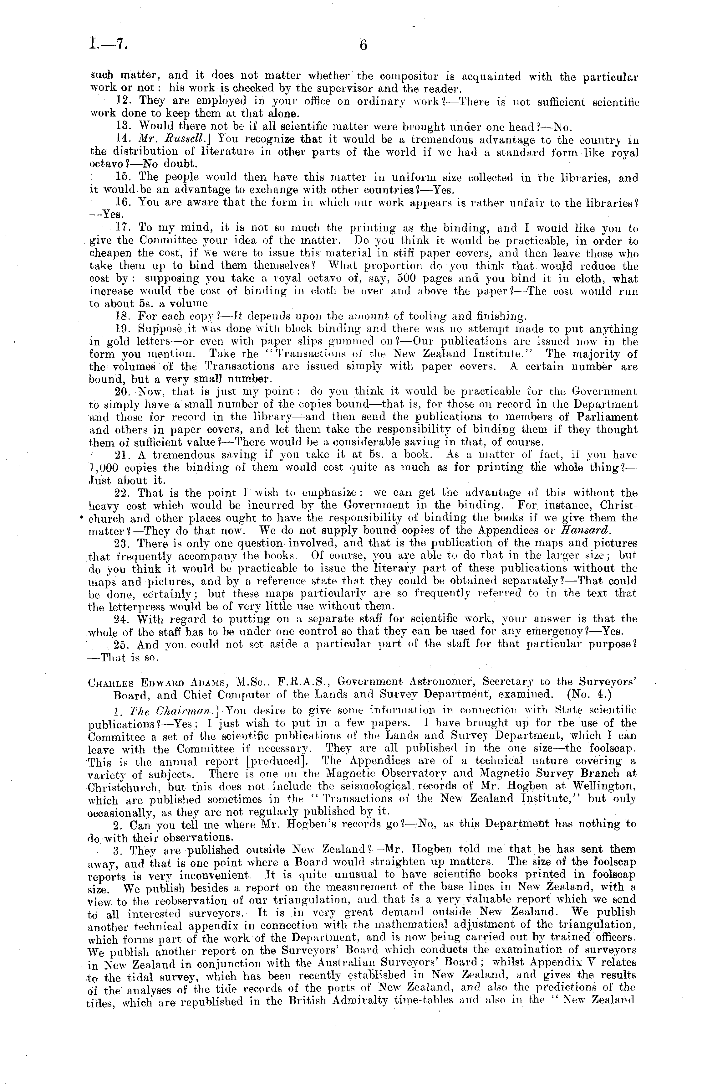 such matter, and it does not matter whether the compositor is acquainted with the particular work or not: his work is checked by the supervisor and the reader. 12. They are employed in your office on ordinary work?— There is not sufficient scientific work done to keep them at that alone. 13. Would there not be if all scientific matter were brought under one head? —No. 14. Mr. Bussell.] You recognize that it would be a tremendous advantage to the country in the distribution of literature in other parts of the world if we had a standard form like royal octavo? —No doubt. 15. The people would then have this matter in uniform size collected in the libraries, and it would-be an advantage to exchange with other countries? —Yes. 16. You are aware that the form in which our work appears is rather unfair to the libraries? —Yes. 17. To my mind, it is not so much the printing as the binding, and 1 would like you to give the Committee your idea of the matter. Do you think it would be practicable, in order to cheapen the cost, if we were to issue this material in stiff paper covers, and then leave those who take them up to bind them themselves? What proportion do you think that would reduce the cost by : supposing you take a royal octavo of, say, 500 pages and you bind it in cloth, what increase would the cost of binding in cloth be over and above the paper? —The cost would run to about ss. a volume 18. For each copy? —It depends upon the amount of tooling and finishing. 19. Suppose it was done With block binding , and there was no attempt made to put anything in gold letters —or even with paper slips gummed on ? —Our publications are issued now in the form you mention. Take the "Transactions of the New Zealand Institute." The majority of the volumes of the Transactions are issued simply with paper covers. A certain number are bound, but a very small number. 20. Now, that is just my point : do you think it would be practicable for the Government to simply have a small number of the copies bound —that is, for those on record in the Department and those for record in the library—and then send the publications to members of Parliament and others in paper covers, and let them take the responsibility of binding them if they thought them of sufficient value? —There would be a considerable saving in that, of course. 21. A tremendous saving if you take it at ss. a book. As a matter of fact, if you have 1,000 copies the binding of them would cost quite as much as for printing the whole thing?— .lust about it. 22. That is the point 1 wish to emphasize : we can get the advantage of this without the heavy cost which would be incurred by the Government in the binding. For instance, Christchurch and other places ought to have the responsibility of binding the books if we give them the matter? —They do that now. We do not supply bound copies of the Appendices or Hansard. 23. There is only one question-involved, and that is the publication of the maps and pictures that frequently accompany the books. Of course, you are able to do that in the larger size; but do you think it would be practicable to issue the literary part of these publications without the maps and pictures, and by a reference state that they could be obtained separately?— That could be done, certainly; but these maps particularly are so frequently referred to in the text that the letterpress would be of very little use without them. 24. With regard to putting on a separate staff for scientific work, your answer is that the whole of the staff has to be under one control so that they can be used for any emergency?— Yes. 25. And you could not set aside a particular part of the staff for that particular purpose? —That is so. Chakles Edwakd Adams, M.Sc, F.R.A.S., Government Astronomer, Secretary to the Surveyors' Board, and Chief Computer of the Lands and Survey Department, examined. (No. 4.) 1. The Chairman. ] You desire to give some information in connection with State scientific publications? —Yes; I just wish to put in a few papers. I have brought up for the use of the Committee a set of the scientific publications of the Lands and Survey Department, which I can leave with the Committee if necessary. They are all published in the one size—the foolscap. This is the annual report [produced]. The Appendices are of a technical nature covering a variety of subjects. There is one on the Magnetic Observatory and Magnetic Survey Branch at Christchurch, but this does not include the seismological. records of Mr. Hogben at Wellington, which are published sometimes in the " Transactions of the New Zealand Institute," but only occasionally, as they are not regularly published by it. 2. Can you tell me where Mr. Hogben's records go?—No, as this Department has nothing to do with their observations. • 3. They are published outside New Zealand? —Mr. Hogben told me that he has sent them away, and that is one point where a Board would straighten up matters. The size of the foolscap reports is very inconvenient. It is quite unusual to have scientific books printed in foolscap size. We publish besides a report on the measurement of the base lines in New Zealand, with a view to the reobservation of our triangulation, and that is a very valuable report which we send to all interested surveyors. It is in very great demand outside New Zealand. We publish another technical appendix in connection with the mathematical adjustment of the triangulation, which forms part of the work of the Department, and is now being carried out by trained officers. We publish another report on the Surveyors' Board which conducts the examination of surveyors in New Zealand in conjunction with the Australian Surveyors' Board; whilst Appendix V relates to the tidal survey, which has been recently established in New Zealand, and gives the results of the analyses of the tide records of the ports of New Zealand, and also the predictions of the tides, which a