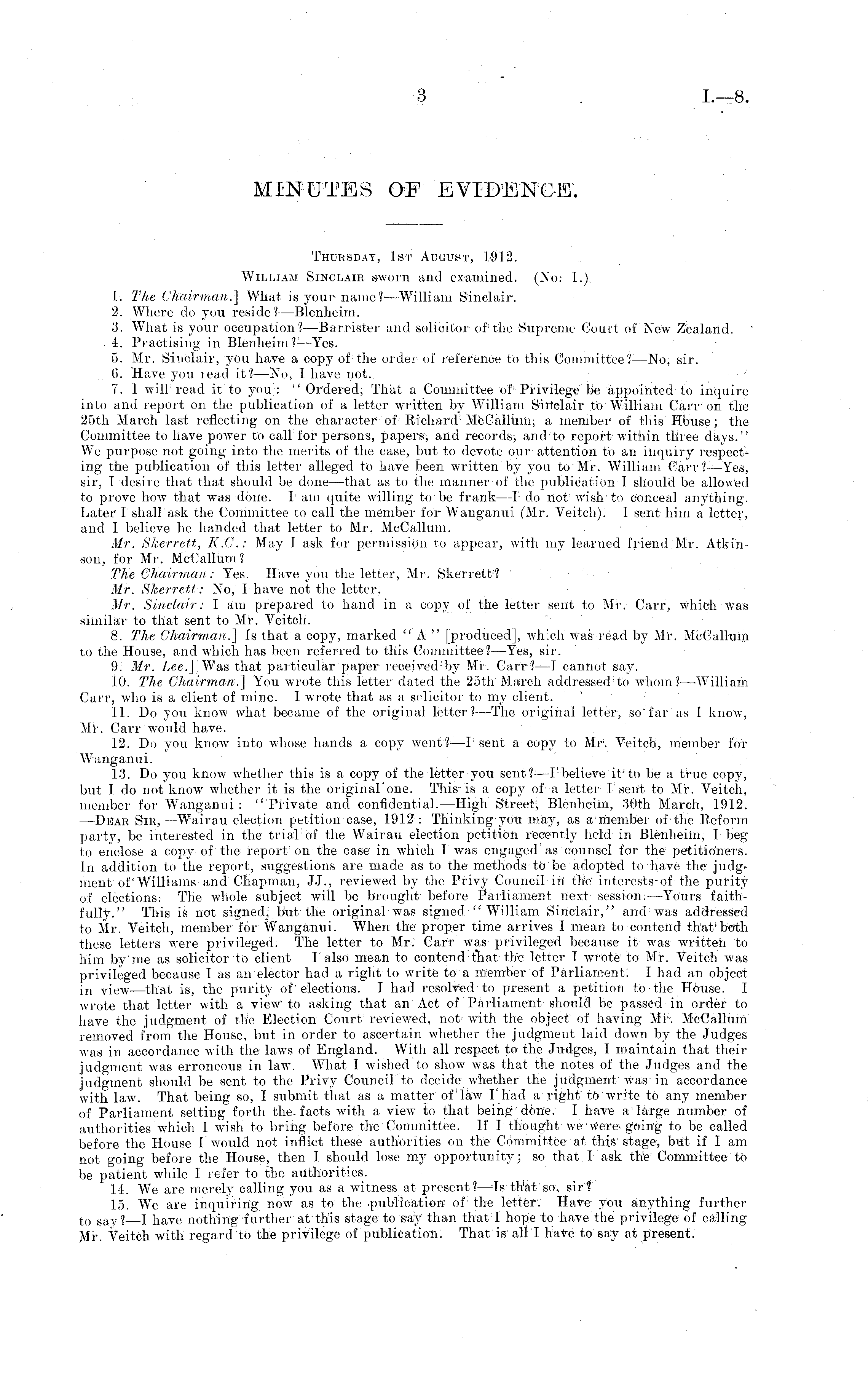 MINUTES OF EVIDENCE. Thursday, Ist August, 1912. William Sinclair sworn and examined. (No. 1.) 1. The Chairman,.] What is your name?— William Sinclair. 2. Where do you reside? —Blenheim. 3. What is your occupation? —Barrister and solicitor of the Supreme Court of New Zealand. 4. Practising , in Blenheim ? —Yes. 5. Mr. Sinclair, you have a copy of the order of reference to this Committee? —No, sir. 6. Have you lead it?—No, I have not. 7. 1 will read it to you : " Ordered, That a Committee of Privilege be appointed to inquire into and report on the publication of a letter written by William Sinclair to William Carr on the 25th March last reflecting on the character of Richard McGallum, a member of this House; the Committee to have power to call for persons, papers, and records, and to report within three days." We purpose not going into the merits of the case, but to devote our attention to an inquiry respecting the publication of this letter alleged to have been written by you to Mr. William Carr?—Yes, sir, I desire that that should be done —that as to the manner of the publication I should be allowed to prove how that was done. lam quite ■willing to be frank—l do not wish to conceal anything. Later I shall ask the Committee to call the member for Wanganui (Mr. Veitch). I sent him a letter, and I believe he handed that letter to Mr. McCallum. Mr. Skerrett, K.G.: May 1 ask for permission to appear, with my learned friend Mr. Atkinson, for Mr. McCallum? The Chairman : Yes. Have you the letter, Mr. Skerrett? Mr. Skerrett: No, 1 have not the letter. Mr. Sinclair: I am prepared to hand in a copy of the letter sent to Mr. Carr, which was similar to that sent to Mr. Veitch. 8. The Chairman] is that a copy, marked " A " [produced], which was read by Mr. McGallum to the House, and which has been referred to this Committee? —Yes, sir. 9. Mr. Lee.] Was that particular paper received by Mr. Carr?—l cannot say. 10. The Chairman.] You wrote this letter dated the 25th March addressed to whom?— William Carr, who is a client of mine. I wrote that as a solicitor to my client. 11. Do you know what became of the original letter? —The original letter, so far as I know, Mr. Carr would have. 12. Do you know into whose hands a copy went? —1 sent a copy to Mr. Veitch, member for Wanganui. 13. Do you know whether this is a copy of the letter you sent?—l believe it to be a true copy, but Ido not know whether it is the original'one. This is a copy of a letter 1 sent to Mr. Veitch, member for Wanganui : " Private and confidential. —High Street, Blenheim, 30th March, 1912. —Dear Sih, —Wairau election petition case, 1912 : Thinking you may, as a'member of the Reform party, be interested in the trial of the Wairau election petition recently held in Blenheim, I beg to enclose a copy of the report on the case in which I was engaged as counsel for the petitioners. In addition to the report, suggestions are made as to the methods to be adopted to have the judgment of Williams and Chapman, JJ., reviewed by the Privy Council in , the interests of the purity of elections. The whole subject will be brought before Parliament next session.—Yours faithfully." This is not signed, but the original was signed "William Sinclair," and was addressed to Mr. Veitch, member for Wanganui. When the proper time arrives I mean to contend that both these letters were privileged. The letter to Mr. Carr was privileged because it was written to him by me as solicitor to client I also mean to contend t*hat the letter I wrote to Mr. Veitch was privileged because las an elector had a right to write to a member of Parliament. I had an object in view—that is, the purity of elections. I had resolved to present a petition to the House. I wrote that letter with a view , to asking that an Act of Parliament should be passed in order to have the judgment of the Election Court reviewed, not with the object of having Mr. McCallum removed from the House, but in order to ascertain whether the judgment laid down by the Judges was in accordance with the laws of England. With all respect to the Judges, I maintain that their judgment was erroneous in law. What I wished to show was that the notes of the Judges and the judgment should be sent to the Privy Council to decide whether the judgment was in accordance with law. That being so, I submit that as a matter of law I had a right to write to any member of Parliament setting forth the facts witli a view to that being done. I have a large number of authorities which I wish to bring before the Committee. If I thought we were going to be called before the House I would not inflict these authorities on the Committee at this stage, but if I am not going before the House, then I should lose my opportunity; so that I ask the Committee to be patient while I refer to the authorities. 14. We are merely calling you as a witness at present? —Is that so, sir? 15. We are inquiring now as to the .publication of the letter. Have you anything further to say? —I have nothing further at this stage to say than that I hope to have the privilege of callingMr. Veitch with regard to the privilege of publication. That is all I have to say at present.