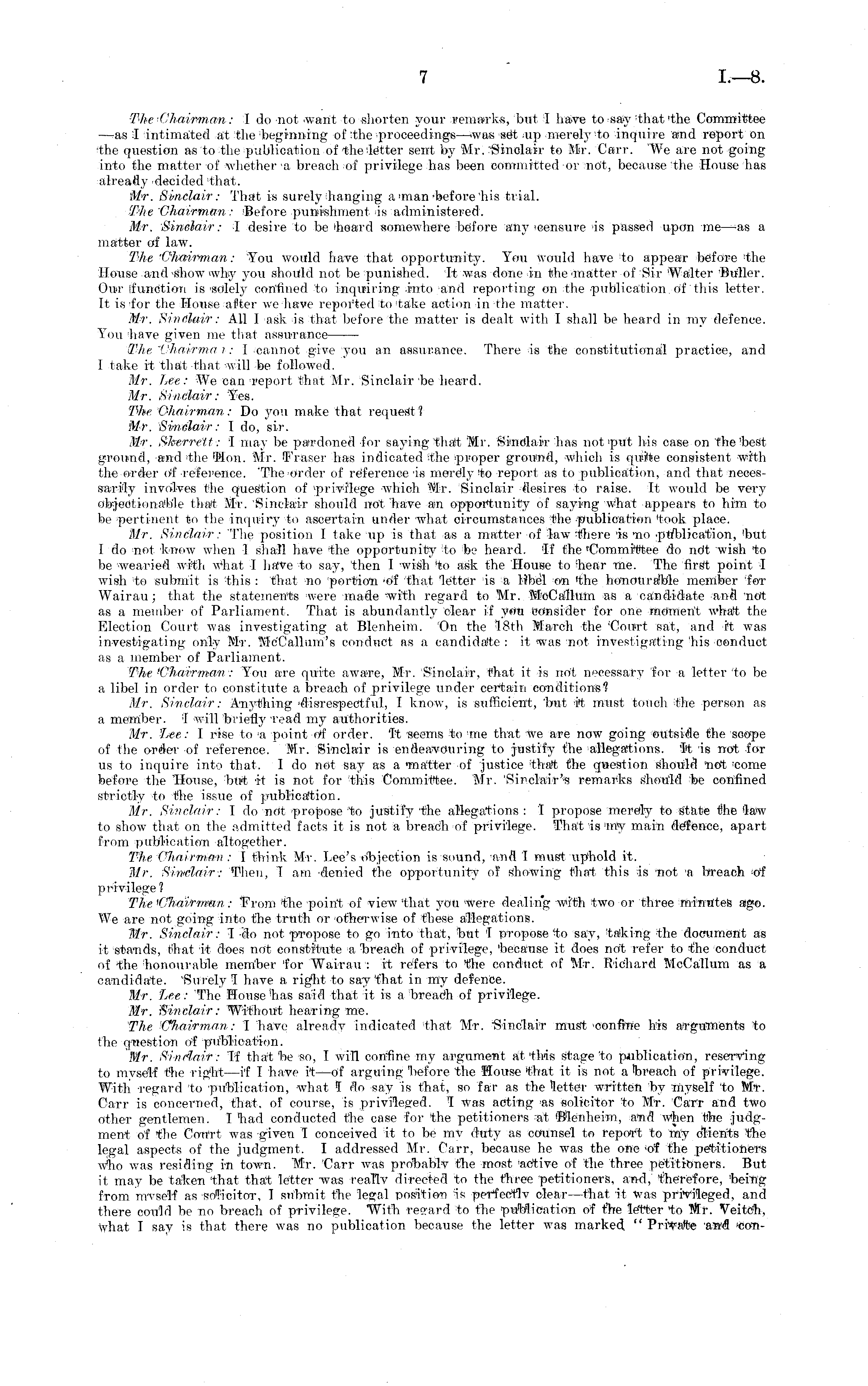 The Chairman : I do not .want to shorten your remarks, but I have to say that the Committee —as I intimated at the beginning of the proceedings —.was setup merely'to inquire and report on the question as to the publication of the letter sent by Mr. Sinclair to Mr. Carr. We are not going into the matter of whether a breach of privilege'has been committed or not, because the House has already decided that. Mr. Sinclair: That is surely hanging a man before his trial. The Chairman : Before punishment is administered. Mr. Sinclair: I desire to be'heard somewhere before any'censure is passed upon me —as a matter of law. The 'Chairman: You would have that opportunity. You would have to appear before the House and show why you should not be punished. It was done in the'matter of Sir Walter Biiller. Oiw ifunctioTi is solely confined to inquiring into and reporting on the publication of this tetter. It is for the House after we have reported to take action in the matter. Mr. Sinclair: All I ask is that before the matter is dealt with I shall be heard in my defence. You have given me that assurance Dhe ' 'h/tirma i: 1 cannot give you an assurance. There is the constitutional practice, and I take it that that will be followed. Mr. Lee: We can report that Mr. Sinclair be heard. Mr. Sinclair: Yes. The Chairman : Do you make that request? Mr. Sinclair: I do, sir. Mr. Sherreit: I may be pardoned -for saying that Mr. Sinclair lias not'put his case on the'best ground, and the ! Mon. Mr. iFraser has indicated the proper ground, Which is quite consistent with the order of reference. The order of reference is merely 'to report as to publication, and that necessarily involves the question of privilege which Mr. Sinclair flesires to raise. It would be very objectionable that Mr. Sinclair should not have an opportunity of saying what appears to him to be pertinent to the inquiry to ascertain under what circumstances the publication 'took place. Mr. Sinclair: The position I take up is that a matter of law iihere is'no -publication, but I do not know when 1 shall have the opportunity to be heard. If the Committee do not wish to be wearied with what I have to say, then I wish to ask the House to hear me. The first point I wish to submit is this : that no portion of that letter is a libel on 'the honourable member for Wairau; that the statements were made with regard to Mr. MoCallum as a candidate and not as a member of Parliament. That is abundantly clear if you consider for one moment whalt the Election Court was investigating at Blenheim. On the 18th March the Court sat, and it was investigating only Mr. McCallum's conduct as a candidate : it was not investigating 'his conduct as a member of Parliament. The 'Chairman : You are quite awa>re, Mr. Sinclair, that it is not necessary for a letter to be a libel in order to constitute a breach of privilege under certain conditions? Mr. Sinclair: Anything disrespectful, I know, is sufficient, 'but it must touch the person as a member. T will briefly read my authorities. Mr. 'Lee: I rise to a point fvf order. 'It seems to me that we are now going outside the scope of the order of reference. Mr. Sinclair is endeavouring to justify the allegations. It is not for us to inquire into that. I do not say as a 'matter of justice that the question should not come before the House, but it is not for this Committee. Mr. Sinclair's remarks should be confined strictly to the issue of publication. Mr. Sinclair: I do not propose to justify the allegations: I propose merely to state the-la>w to show that on the admitted facts it is not a breach of privilege. That is my main defence, apart from publication altogether. The Chairman : I think Mr. Lee's objection is sound, and I must uphold it. Mr. Sinclair: Then, T am denied the opportunity of showing that this is not a breach of privilege? The -Chairman: "From the point of view that you were dealing with two or three miniiteS ago. We are not going into the truth or otherwise of these allegations. Mr. Sinclair: 1 'do not -propose to go into that, but I propose to say, talking the document as it stands, that it does not constitute a broach of privilege, 'because it does not refer to the conduct of the honourable member for Wairau : it refers to the conduct of Mr. Richard McCallum as a candidate. 'Surely 'I have a right to say that in my defence. Mr. Tiee: The House has said that it is a breach of privilege. Mr. Sinclair: Without hearing me. The Chairman: I liave already indicated that Mr. Sinclair must confine his arguments to the question of publication. Mr. Sinclair: If that be so, I will confine my argument at this stage to publication, reserving to myself the right—if T have it—of arguing 'before the House that it is not a of privilege. With regard to publication, what I do say is that, so far as the letter written by myself to Mr. Carr is concerned, that, of course, is privileged. I was acting as solicitor to Mr. Carr and two other gentlemen. I "had conducted the case for the petitioners at (Blenheim, and when the judgment of the Court was given 1 conceived it to be mv duty as counsel to report to my clients the legal aspects of the judgment. I addressed Mr. Carr, because he was the one of the petitioners Wlio was residing in town. Mr. Carr was prol>ablv the most active of the three petitioners. But it may be taken that that letter was really directed to the three petitioners, and, therefore, 'being from myself as solicitor, I submit the legal position is perfectly clear—that it was privileged, and there could bo no breach of privilege. With regard to the publication of the letter to Mr. Veitch, what I say is that there was no publication because the letter was marked " Private awfi con-