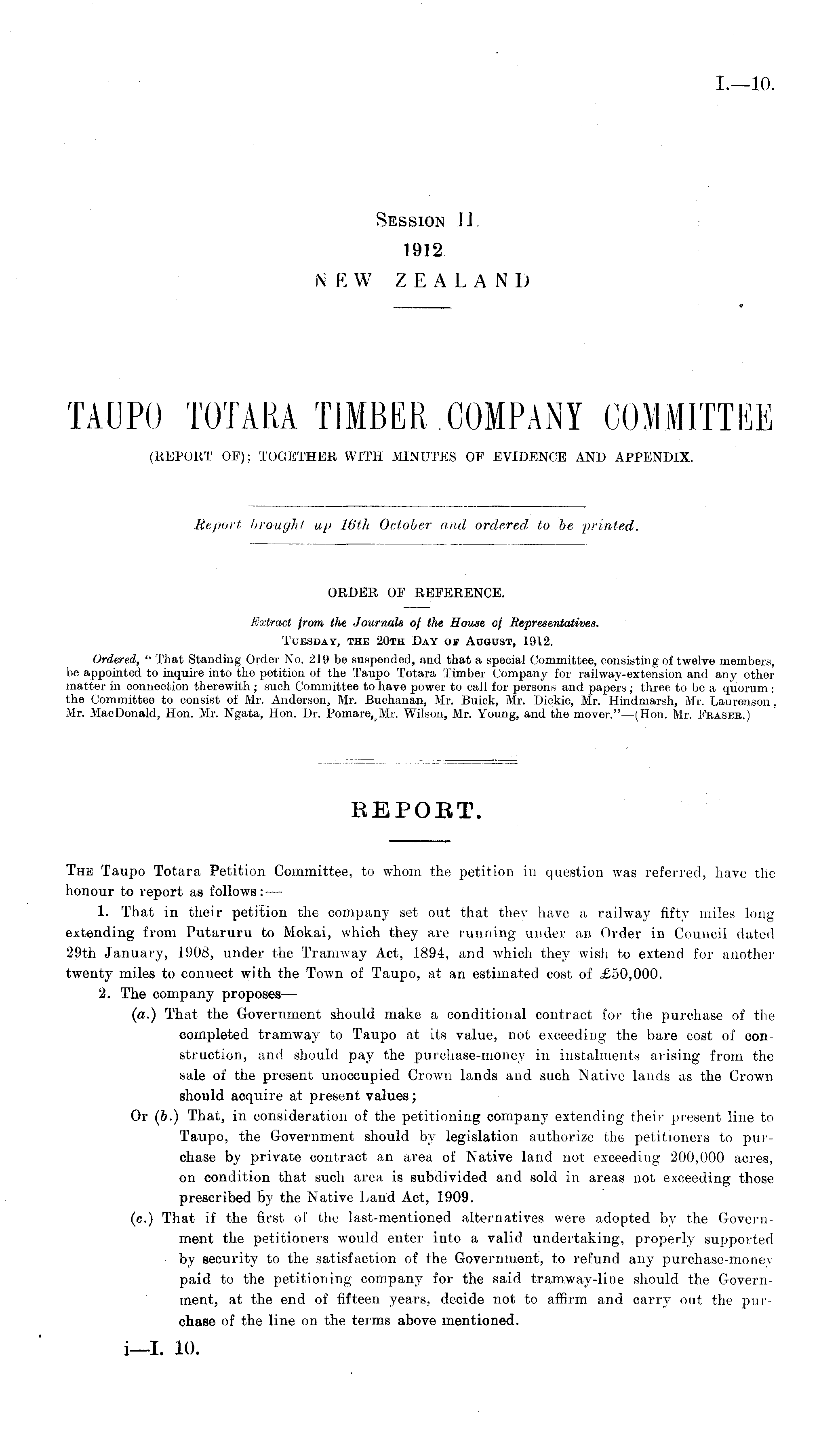 Extract from the Journals of the House of Representatives. Tuesday, the 20th Day or August, 1912. Ordered, " That Standing Order No. 219 be suspended, and that a special Committee, consisting of twelve members, be appointed to inquire into the petition of the Taupo Totara Timber Company for railway-extension and any other matter in connection therewith; such Committee to have power to call for persons and papers ; three to be a quorum : the Committee to consist of Mr. Anderson, Mr. Buchanan, Mr. Buick, Mr. Dickie, Mr. Hindmarsh, Mr. Laurenson , Mr. MacDonald, Hon. Mr. Ngata, Hon. Dr. Pomare, f Mr. Wilson, Mr. Young, and the mover." —(Hon. Mr. Fraser.)