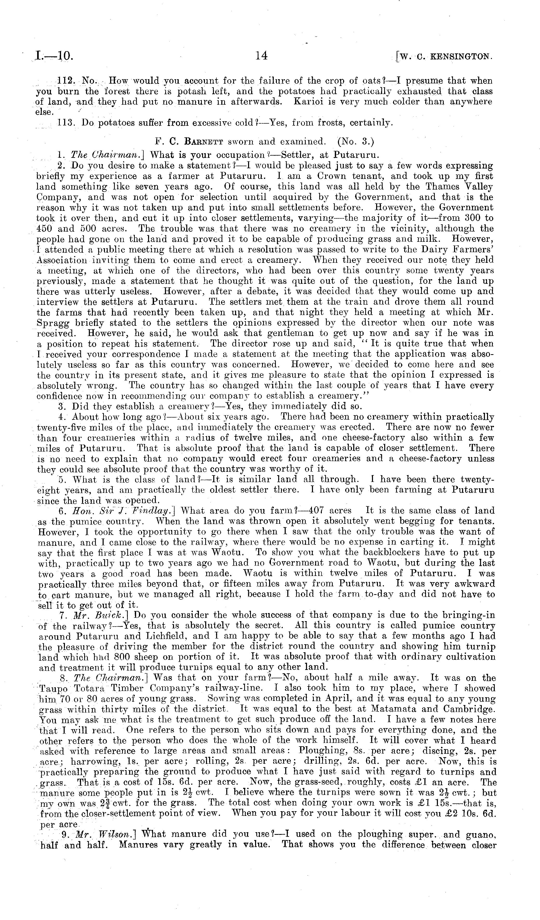 112. No. How would you account for the failure of the crop of oats? —I presume that when you burn the forest there is potash left, and the potatoes had practically exhausted that class of land, and they had put no manure in afterwards. Karioi is very much colder than anywhere else. ' 113. Do potatoes suffer from excessive cold? —Yes, from frosts, certainly. F. C. Barnett sworn and examined. (No. 3.) 1. The Chairman.] What is your occupation'—Settler, at Putaruru. 2. Do you desire to make a statement?—l would be pleased just to say a few words expressing briefly my experience as a farmer at Putaruru. I am a Crown tenant, and took up my first land something like seven years ago. Of course, this land was all held by the Thames Valley Company, and was not open for selection until acquired by the Government, and that is the reason why it was not taken up and put into small settlements before. However, the Government took it over then, and cut it up into closer settlements, varying—the majority of it—from 300 to 450 and 500 acres. The trouble was that there was no creamery in the vicinity, although the people had gone on the land and proved it to be capable of producing grass and milk. However, I attended a public meeting there at which a resolution was passed to write to the Dairy Farmers' Association inviting them to come and erect a creamery. When they received our note they held a meeting, at which one of the directors, who had been over this country some twenty years previously, made a statement that he thought it was quite out of the question, for the land up there was utterly useless. However, after a debate, it was decided that they would come up and interview the settlers at Putaruru. The settlers met them at the train and drove them all round the farms that had recently been taken up, and that night they held a meeting at which Mr. Spragg briefly stated to the settlers the opinions expressed by the director when our note was received. However, he said, he would ask that gentleman to get up now and say if he was in a position to repeat his statement. The director rose up and said, "It is quite true that when I received your correspondence I made a statement at the meeting that the application was absolutely useless so far as this country was concerned. However, we decided to come here and see the country in its present state, and it gives me pleasure to state that the opinion I expressed is absolutely wrong. The country has so changed within the last couple of years that I have every confidence now in recommending our company to establish a creamery." 3. Did they establish a creamery?—Yes, they immediately did so. 4. About how long ago? —About six years ago. There had been no creamery within practically twenty-five miles of the place, and immediately the creamery was erected. There are now no fewer than four creameries within a radius of twelve miles, and one cheese-factory also within a few miles of Putaruru. That is absolute proof that the land is capable of closer settlement. There is no need to explain that no company would erect four creameries and a cheese-factory unless they could see absolute proof that the country was worthy of it. 5. What is the class of land?—lt is similar land all through. I have been there twentyeight years, and am practically the oldest settler there. I have only been farming at Putaruru since the land was opened. 6. Hon. Sir J. Findlay.] What area do you farm? —407 acres It is the same class of land as the pumice country. When the land was thrown open it absolutely went begging for tenants. However, I took the opportunity to go there when I saw that the only trouble was the want of manure, and I came close to the railway, where there would be no expense in carting it. I might say that the first place I was at was Waotu. To show you what the backblockers have to put up with, practically up to two years ago we had no Government road to Waotu, but during the last two years a good road has been made. Waotu is within twelve miles of Putaruru. I was practically three miles beyond that, or fifteen miles away from Putaruru. It was very awkward to cart manure, but we managed all right, because I hold the farm to-day and did not have to sell it to get out of it. 7. Mr. Buick.] Do you consider the whole success of that company is due to the bringing-in of the railway?—Yes, that is absolutely the secret. All this country is called pumice country around Putaruru and Lichfield, and I am happy to be able to say that a few months ago I had the pleasure of driving the member for the district round the country and showing him turnip land which had 800 sheep on portion of it. It was absolute proof that with ordinary cultivation and treatment it will produce turnips equal to any other land. 8. The Chairman.] Was that on your farm? —No, about half a mile away. It was on the Taupo Totara Timber Company's railway-line. I also took him to my place, where I showed him 70 or 80 acres of young grass. Sowing was completed in April, and it was equal to any young grass within thirty miles of the district. It was equal to the best at Matamata and Cambridge. You may ask me what is the treatment to get such produce off the land. I have a few notes here that I will read. One refers to the person who sits down and pays for everything done, and the other refers to the person who does the whole of the work himself. It will cover what I heard asked with reference to large areas and small areas: Ploughing, Bs. per acre; discing, 2s. per acre; harrowing, Is. per acre; rolling, 2s. per acre; drilling, 2s. 6d. per acre. Now, this is practically preparing the ground to produce what I have just said with regard to turnips and grass. That is a cost of 15s. 6d. per acre. Now, the grass-seed, roughly, costs £1 an acre. The manure some people put in is 2J cwt. I believe where the turnips were sown it was 2§-cwt. ; but my own was 2f cwt. for the grass. The total cost when doi