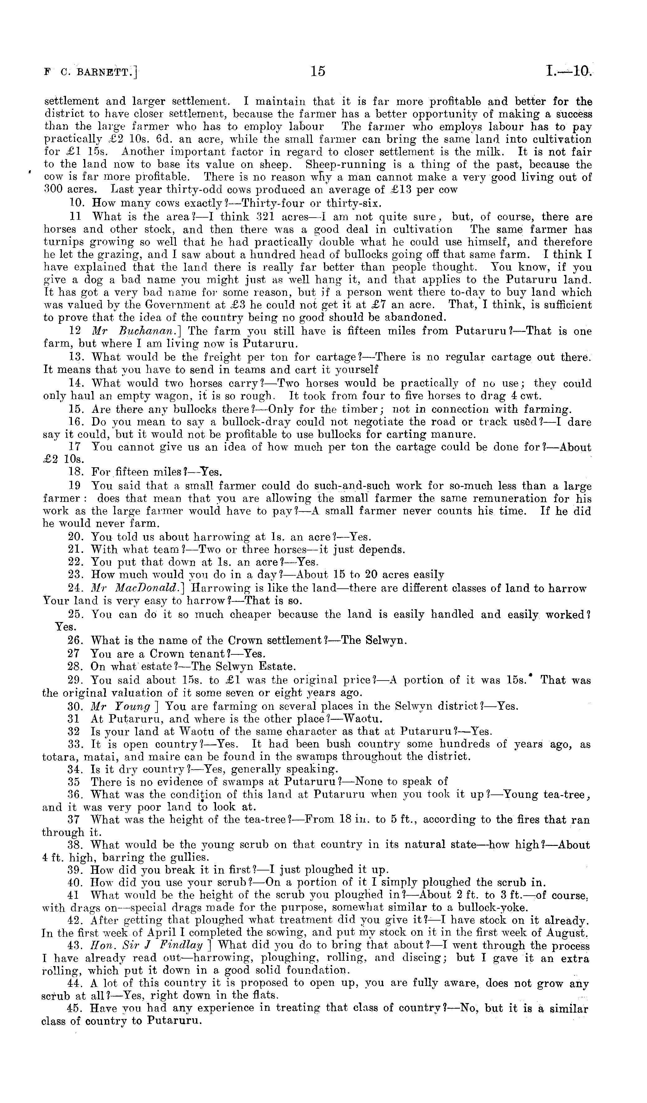 settlement and larger settlement. I maintain that it is far more profitable and better for the district to have closer settlement, because the farmer has a better opportunity of making a success than the large farmer who has to employ labour The farmer who employs labour has to paypractically £2 10s. 6d. an acre, while the small farmer can bring the same land into cultivation for £1 15s. Another important factor in regard to closer settlement is the milk. It is not fair to the land now to base its value on sheep. Sheep-running is a thing of the past, because the cow is far more profitable. There is no reason why a man cannot make a very good living out of 300 acres. Last year thirty-odd cows produced an average of £13 per cow 10. How many cows exactly?—Thirty-four or thirty-six. 11 What is the area?—l think 321 acres—l am not quite sure, but, of course, there are horses and other stock, and then there was a good deal in cultivation The same farmer has turnips growing so well that he had practically double what he could use himself, and therefore he let the grazing, and I saw about a hundred head of bullocks going off that same farm. I think I have explained that the land there is really far better than people thought. You know, if you give a dog a bad name you might just as well hang it, and that applies to the Putaruru land. It has got a very bad name for some reason, but if a person went there to-day to buy land which was valued by the Government at £3 he could not get it at £7 an acre. That, I think, is sufficient to prove that the idea of the country being no good should be abandoned. 12 Mr Buchanan.] The farm you still have is fifteen miles from Putaruru? —That is one farm, but where I am living now is Putaruru. 13. What would be the freight per ton for cartage?—There is no regular cartage out there. It means that you have to send in teams and cart it yourself 14. What would two horses carry?—Two horses would be practically of no use; they could only haul an empty wagon, if is so rough. Tt took from four to five horses to drag 4 cwt. 15. Are there any bullocks there?—Only for the timber; not in connection with farming. 16. Do you mean to say a bullock-dray could not negotiate the road or track used?—l dare say it could, but it would not be profitable to use bullocks for carting manure. 17 You cannot give us an idea of how much per ton the cartage could be done for?—About £2 10s. 18. For fifteen miles?—Yes. 19 You said that a small farmer could do such-and-such work for so-much less than a large farmer : does that mean that you are allowing the small farmer the same remuneration for his work as the large farmer would have to pay?—A small farmer never counts his time. If he did he would never farm. 20. You told us about harrowing at Is. an acre? —Yes. 21. With what team?—Two or three horses—it just depends. 22. You put that down at Is. an acre? —Yes. 23. How much would you do in a day?—About 15 to 20 acres easily 24. Mr MacDonald.] Harrowing is like the land —there are different classes of land to harrow Your land is very easy to harrow?—That is so. 25. You can do it so much cheaper because the land is easily handled and easily worked? Yes. 26. What is the name of the Crown settlement? —The Selwyn. 27 You are a Crown tenant? —Yes. 28. On what estate? —The Selwyn Estate. 29. You said about 15s. to £1 was the original price?—A portion of it was 155." That was the original valuation of it some seven or eight years ago. 30. Mr Young ] You are farming on several places in the Selwyn district? —Yes. 31 At Putaruru, and where is the other place?—Waotu. 32 Is your land at Waotu of the same character as that at Putaruru?—Yes. 33. It is open country?—Yes. It had been bush country some hundreds of years ago, as totara, matai, and maire can be found in the swamps throughout the district. 34. Is it dry country?—Yes, generally speaking. 35 There is no evidence of swamps at Putaruru?—None to speak of 36. What was the condition of this land at Putaruru when you took it up? —Young tea-tree, and it was very poor land to look at. 37 What was the height of the tea-tree? —From 18 in. to 5 ft., according to the fires that ran through it. 38. What would be the young scrub on that country in its natural state —how high? —About 4 ft. high, barring the gullies. 39. How did you break it in first?—l just ploughed it up. 40. How did you use your scrub? —On a portion of it I simply ploughed the scrub in. 41 What would be the height of the scrub you ploughed in?—About 2 ft. to 3 ft.—of course, with drags on —special drags made for the purpose, somewhat similar to a bullock-yoke. 42. After getting that ploughed what treatment did you give it?—l have stock on it already. In the first week of April I completed the sowing, and put my stock on it in the first week of August. 43. Hon. Sir J Findlay ] What did you do to bring that about? —I went through the process I have already read out —harrowing, ploughing, rolling, and discing; but I gave it an extra rolling, which put it down in a good solid foundation. 44. A lot of this country it is proposed to open up, you are fully aware, does not grow any scrub at all? —Yes, right down in the flats. 45. Have you had any experience in treating that class of country?—No, but it is a similar class of country to Putaruru.