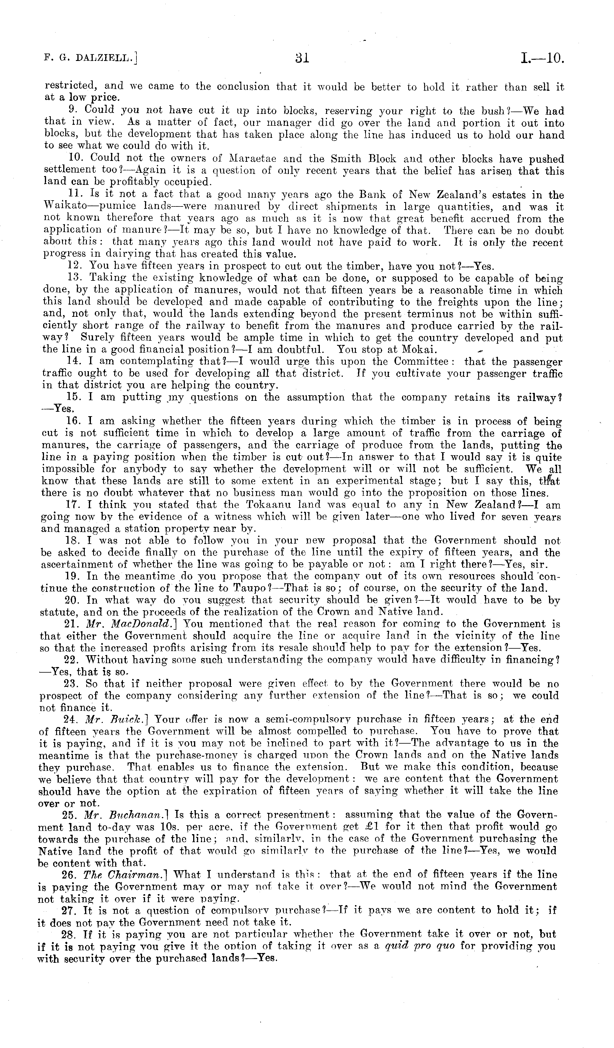 restricted, and we came to the conclusion that it would be better to hold it rather than sell it at a low price. 9. Could you not have cut it up into blocks, reserving your right to the bush? —We had that in view. As a matter of fact, our manager did go over the land and portion it out into blocks, but the development that has taken place along the line has induced us to hold our hand to see what we could do with it. 10. Could not the owners of Maraetae and the Smith Block and other blocks have pushed settlement too? —Again it is a question of only recent years that the belief has arisen that this land can be profitably occupied. 11. Is it not a fact that a good many years ago the Bank of New Zealand's estates in the Waikato —pumice lands—were manured by direct shipments in large quantities, and was it not known therefore that years ago as much as it is now that great benefit accrued from the application of manure? —It may be so, but I have no knowledge of that. There can be no doubt about this : that many years ago this land would not have paid to work. It is only the recent progress in dairying that has created this value. 12. You have fifteen years in prospect to cut out the timber, have you not?—Yes. 13. Taking the existing knowledge of what can be done, or supposed to be capable of being done, by the application of manures, would not that fifteen years be a reasonable time in which this land should be developed and made capable of contributing to the freights upon the line; and, not only that, would the lands extending beyond the present terminus not be within sufficiently short range of the railway to benefit from the manures and produce carried by the railway? Surely fifteen years would be ample time in which to get the country developed and put the line in a good financial position?—l am doubtful. You stop at Mokai. 14. lam contemplating that?—l would urge this upon the Committee: that the passenger traffic ought to be used for developing all that district. If you cultivate your passenger traffic in that district you are helping the country. 15. I am putting my questions on the assumption that the company retains its railway? —Yes. 16. I am asking whether the fifteen years during which the timber is in process of being cut is not sufficient time in which to develop a large amount of traffic from the carriage of manures, the carriage of passengers, and the carriage of produce from the lands, putting the line in a paying position when the timber is cut out?—Tn answer to that I would say it is quite impossible for anybody to say whether the development will or will not be sufficient. We all know that these lands are still to some extent in an experimental stage; but I say this, tlfat there is no doubt whatever that no business man would go into the proposition on those lines. 17. I think you stated that the Tokaanu land was equal to any in New Zealand?—l am going now by the evidence of a witness which will be given later —one who lived for seven years and managed a station property near by. 18. I was not able to follow you in your new proposal that the Government should not be asked to decide finally on the purchase of the line until the expiry of fifteen years, and the ascertainment of whether the line was going to be payable or not : am I right there? —Yes, sir. 19. In the meantime do you propose that the company out of its own resources should continue the construction of the line to Taupo?—That is so; of course, on the security of the land. 20. In what way do you suggest that security should be given?—lt would have to be by statute, and on the proceeds of the realization of the Crown and. Native land. 21. Mr. MacDonald.] You mentioned that the real reason for coming to the Government is that either the Government should acquire the line or acquire land in the vicinity of the line so that the increased profits arising from its resale should help to pay for the extension? —Yes. 22. Without having some such understanding the company would have difficulty in financing? —Yes, that is so. 23. So that if neither proposal were given effect to by the Government there would be no prospect of the company considering any further extension of the line?—That is so; we could not finance it. 24. Mr. Buick.] Your offer is now a semi-compulsory purchase in fifteen years; at the end of fifteen years the Government will be almost compelled to purchase. You have to prove that it is paying, and if it is vou may not be inclined to part with it? —The advantage to us in the meantime is that the purchase-money is charged upon the Crown lands and on the Native lands they purchase. That enables us to finance the extension. But we make this condition, because we believe that that country will pay for the development: we are content that the Government should have the option at the expiration of fifteen years of saying whether it will take the line over or not. 25. Mr. Buchanan.] Is this a correct presentment : assuming that the value of the Government land to-day was 10s. per acre, if the Government get £1 for it then that profit would go towards the purchase of the line; and, similarly, in the ease of the Government purchasing the Native land the profit of that would go similarly to the purchase of the line?—Yes, we would be content with that. 26. The Chairman.] What I understand is this : that at the end of fifteen years if the line is paving the Government may or may not take it over?—We would not mind the Government not taking it over if it were paying. 27. It is not a question of compulsory purchase?—lf it pays we are content to hold it; if it does not pay the Government need not take it. 28. If it is paying you are not particular whether the Government take it over or not, but if it is not paying vou give it the option of taking it over as a quid pro quo for providing you with security over the purchased lands? —Yes.