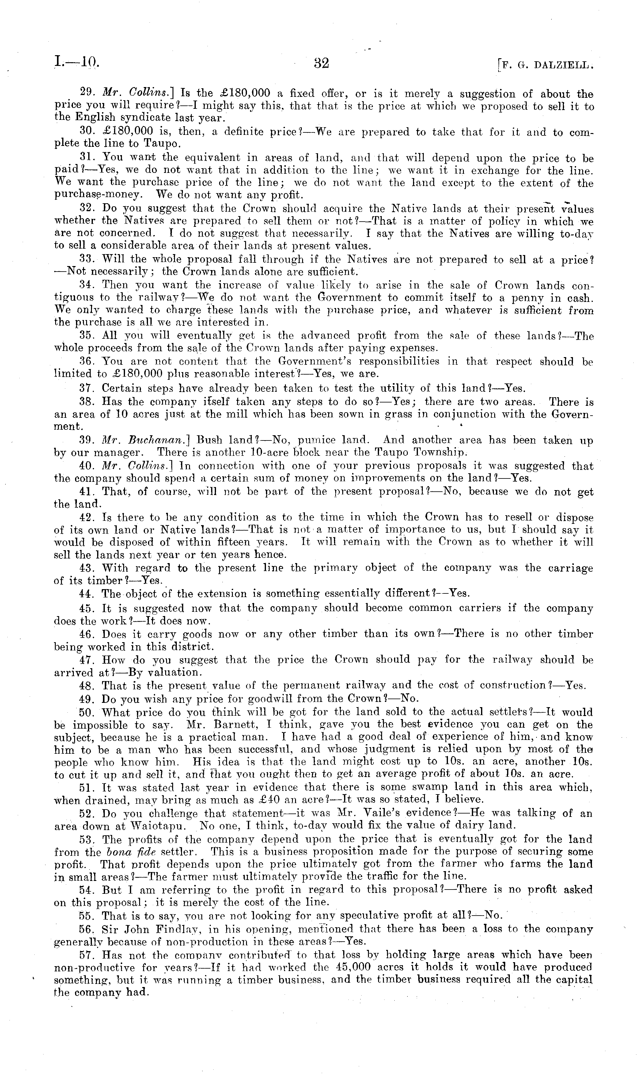 29. Mr. Collins.] Is the £180,000 a fixed offer, or is it merely a suggestion of about the price you will require?—l might say this, that that is the price at which we proposed to sell it to the English syndicate last year. 30. £180,000 is, then, a definite price?—We are prepared to take that for it and to complete the line to Taupo. 31. You want the equivalent in areas of land, and that will depend upon the price to be paid?—Yes, we do not want that in addition to the line; we want it in exchange for the line. We want the purchase price of the line; we do not want the land except to the extent of the purchase-money. We do not want any profit. 32. Do you suggest that the Crown should acquire the Native lands at their present values whether the Natives are prepared to sell them or not? —That is a matter of policy in which we are not concerned. I do not suggest that necessarily. I say that the Natives are willing to-day to sell a considerable area of their lands at present values. 33. Will the whole proposal fall through if the Natives are not prepared to sell at a price? —Not necessarily; the Crown lands alone are sufficient. 34. Then you want the increase of value likely to arise in the sale of Crown lands contiguous to the railway?—We do not want the Government to commit itself to a penny in cash. We only wanted to charge these lands with the purchase price, and whatever is sufficient from the purchase is all we are interested in. 35. All you will eventually get is the advanced profit from the sale of these lands?—The whole proceeds from the sale of the Crown lands after paying expenses. 36. You are not content that the Government's responsibilities in that respect should be limited to £180,000 plus reasonable interest?—Yes, we are. 37. Certain steps have already been taken to test the utility of this land?—Yes. 38. Has the company itself taken any steps to do so? —Yes; there are two areas. There is an area of 10 acres just at the mill which has been sown in grass in conjunction with the Government. 39. Mr. Buchanan.] Bush land?—No, pumice land. And another area has been taken up by our manager. There is another 10-acre block near the Taupo Township. 40. Mr. Collins.] In connection with one of your previous proposals it was suggested that the compare should spend a certain sum of money on improvements on the land ?—Yes. 41. That, of course, will not be part of the present proposal?—No, because we do not get the land. 42. Is there to be any condition as to the time in which the Crown has to resell or dispose of its own land or Native lands?—That is not a matter of importance to us, but I should say it would be disposed of within fifteen years. It will remain with the Grown as to whether it will sell the lands next year or ten years hence. 4-3. With regard to the present line the primary object of the company was the carriage of its timber? —Yes. 44. The object of the extension is something essentially different? —Yes. 45. It is suggested now that the company should become common carriers if the company does the work? —It does now. 46. Does it carry goods now or any other timber than its own? —There is no other timber being worked in this district. 47. How do you suggest that the price the Crown should pay for the railway should be arrived at? —By valuation. 48. That is the present value of the permanent railway and the cost of construction? —Yes. 49. Do you wish any price for goodwill from the Crown? —No. 50. What price do you think will be got for the land sold to the actual settlers?—lt would be impossible to say. Mr. Barnett, I think, gave you the best evidence you can get on the subject, because he is a practical man. I have had a good deal of experience of him, and know him to be a man who has been successful, and whose judgment is relied upon by most of the people who know him. His idea is that the land might cost up to 10s. an acre, another 10s. to cut it up and sell it, and that you ought then to get an average profit of about 10s. an acre. 51. It was stated last year in evidence that there is some swamp land in this area which, when drained, may bring as much as £40 an acre? —It was so stated, T believe. 52. Do you challenge that statement —it was Mr. Vaile's evidence? —He was talking of an area down at Waiotapu. No one, I think, to-day would fix the value of dairy land. 53. The profits of the company depend upon the price that is eventually got for the land from the bona fide settler. This is a business proposition made for the purpose of securing some profit. That profit depends upon the price ultimately got from the farmer who farms the land in small areas? —The farmer must ultimately provide the traffic for the line. 54. But I am referring to the profit in regard to this proposal?—There is no profit asked on this proposal; it is merely the cost of the line. 55. That is to say, vou are not looking for any speculative profit at all? —No. 56. Sir John Findlay, in his opening, mentioned that there has been a loss to the company generally because of non-production in these areas? —Yes. 57. Has not the company contributed to that loss by holding large areas which have been non-productive for years?—lf it had worked the 45,000 acres it holds it would have produced something, but it was running a timber business, and the timber business required all the capital the company had.