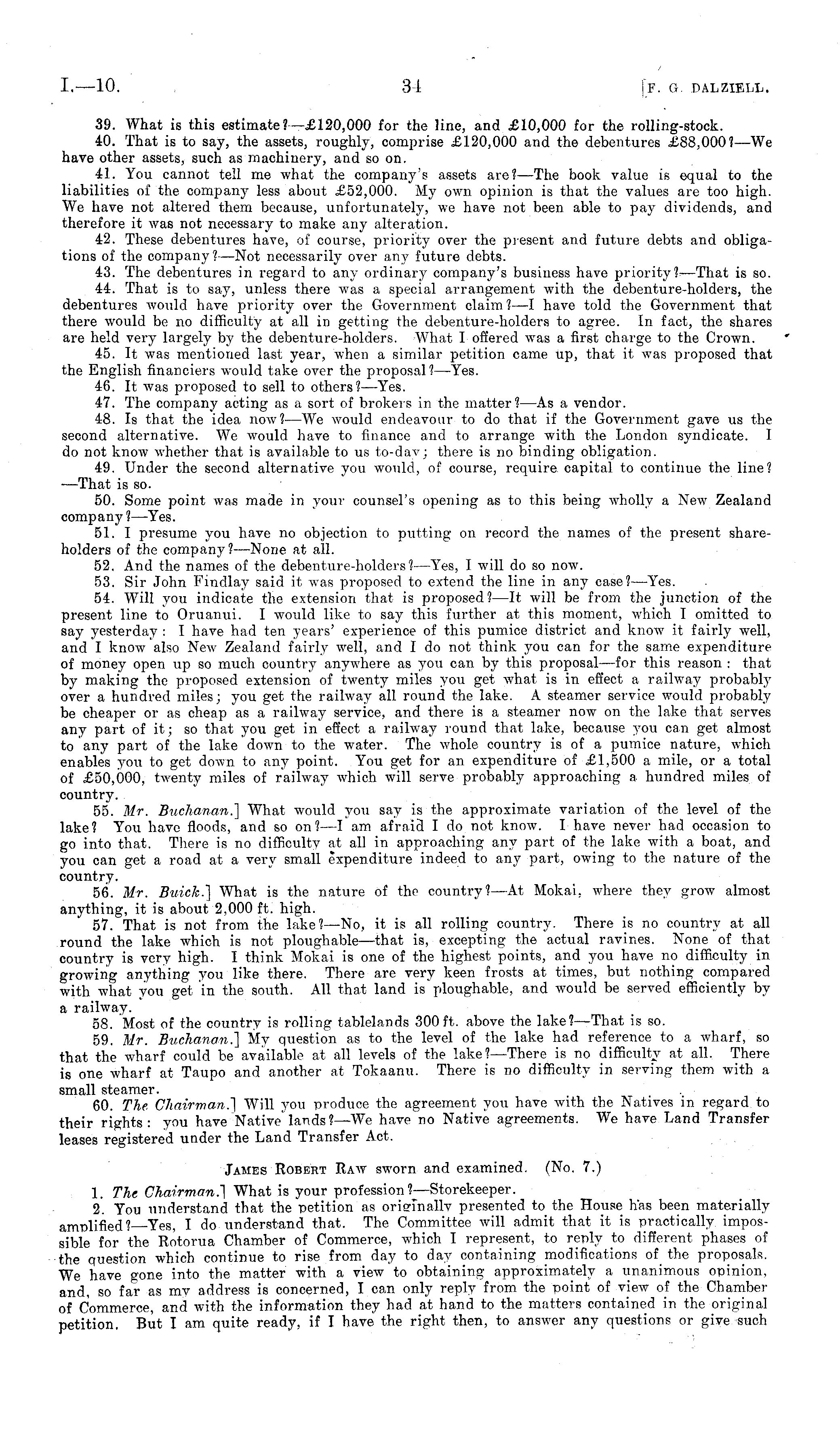 39. What is this estimate?—£l2o,ooo for the line, and £10,000 for the rolling-stock. 40. That is to say, the assets, roughly, comprise £120,000 and the debentures £88,000? —We have other assets, such as machinery, and so on. 41. You cannot tell me what the company's assets are?—The book value is equal to the liabilities of the company less about £52,000. My own opinion is that the values are too high. We have not altered them because, unfortunately, we have not been able to pay dividends, and therefore it was not necessary to make any alteration. 42. These debentures have, of course, priority over the present and future debts and obligations of the company?—Not necessarily over any future debts. 43. The debentures in regard to any ordinary company's business have priority? —That is so. 44. That is to say, unless there was a special arrangement with the debenture-holders, the debentures would have priority over the Government claim? —I have told the Government that there would be no difficulty at all in getting the debenture-holders to agree. In fact, the shares are held very largely by the debenture-holders. What I offered was a first charge to the Crown. 45. It was mentioned last year, when a similar petition came up, that it was proposed that the English financiers would take over the proposal? —Yes. 46. It was proposed to sell to others? —Yes. 47. The company acting as a sort of brokers in the matter? —As a vendor. 48. Is that the idea now?—We would endeavour to do that if the Government gave us the second alternative. We would have to finance and to arrange with the London syndicate. I do not know whether that is available to us to-dav; there is no binding obligation. 49. Under the second alternative you would, of course, require capital to continue the line? —That is so. 50. Some point was made in your counsel's opening as to this being wholly a New Zealand company ? —Yes. 51. I presume you have no objection to putting on record the names of the present shareholders of the company?—None at all. 52. And the names of the debenture-holders? —Yes, I will do so now. 53. Sir John Findlay said it was proposed to extend the line in any case? —Yes. 54. Will you indicate the extension that is proposed ? —lt will be from the junction of the present line to Oruanui. I would like to say this further at this moment, which I omitted to say yesterday : I have had ten years' experience of this pumice district and know it fairly well, and I know also New Zealand fairly well, and I do not think you can for the same expenditure of money open up so much country anywhere as you can by this proposal—for this reason : that by making the proposed extension of twenty miles you get what is in effect a railway probably over a hundred miles; you get the railway all round the lake. A steamer service would probably be cheaper or as cheap as a railway service, and there is a steamer now on the lake that serves any part of it; so that you get in effect a railway round that lake, because you can get almost to any part of the lake down to the water. The whole country is of a pumice nature, which enables you to get down to any point. You get for an expenditure of £1,500 a mile, or a total of £50,000, twenty miles of railway which will serve probably approaching a hundred miles of country. 55. Mr. Buchanan.] What would you say is the approximate variation of the level of the lake? You have floods, and so on? —I am afraid I do not know. I have never had occasion to go into that. There is no difficulty at all in approaching any part of the lake with a boat, and you can get a road at a very small expenditure indeed to any part, owing to the nature of the country. 56. Mr. Buick.] What is the nature of the country?—At Mokai, where they grow almost anything, it is about 2,000 ft. high. 57. That is not from the lake? —No, it is all rolling country. There is no country at all round the lake which is not ploughable—that is, excepting the actual ravines. None of that country is very high. I think Mokai is one of the highest points, and you have no difficulty in growing anything you like there. There are very keen frosts at times, but nothing compared with what you get in the south. All that land is ploughable, and would be served efficiently by a railway. 58. Most of the country is rolling tablelands 300ft. above the lake?—That is so. 59. Mr. Buchanan.] My question as to the level of the lake had reference to a wharf, so that the wharf could be available at all levels of the lake? —There is no difficulty at all. There is one wharf at Taupo and another at Tokaanu. There is no difficulty in serving them with a small steamer. 60. The. Chairman.] Will you produce the agreement you have with the Natives in regard to their rights: you have Native'lands?—We have no Native agreements. We have Land Transfer leases registered under the Land Transfer Act. James Robert Raw sworn and examined. (No. 7.) 1. The Chairman.] What is your profession? —Storekeeper. 2. You understand that the petition as originally presented to the House has been materially amplified? Yes, I do understand that. The Committee will admit that it is practically impossible for the Rotorua Chamber of Commerce, which I represent, to reply to different phases of the question which continue to rise from day to day containing modifications of_ the proposals. We have gone into the matter with a view to obtaining approximately a unanimous opinion, and, so far as mv address is concerned, I can only reply from the point of view of the Chamber of Commerce, and with the information they had at hand to the matters contained in the original petition, But I am quite ready, if I have the right then, to answer any questions or give such