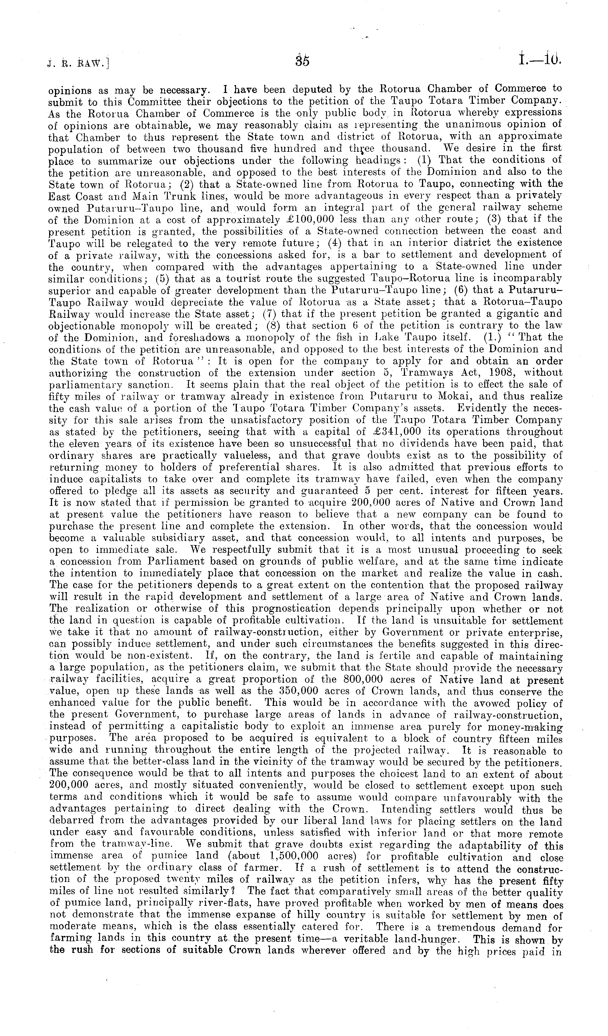 opinions as may be necessary. I have been deputed by the Rotorua Chamber of Commerce to submit to this Committee their objections to the petition of the Taupo Totara Timber Company. As the Rotorua Chamber of Commerce is the only public body in Rotorua whereby expressions of opinions are obtainable, we may reasonably claim as representing the unanimous opinion of that Chamber to thus represent the State town and district of Rotorua, with an approximate population of between two thousand five hundred and thr,ee thousand. We desire in the first place to summarize our objections under the following headings : (1) That the conditions of the petition are unreasonable, and opposed to the best interests of the Dominion and also to the State town of Rotorua; (2) that a State-owned line from Rotorua to Taupo, connecting with the East Coast and Main Trunk lines, would be more advantageous in every respect than a privately owned Putaruru-Taupo line, and would form an integral part of the general railway scheme of the Dominion at a cost of approximately £100,000 less than any other route; (3) that if the present petition is granted, the possibilities of a State-owned connection between the coast and Taupo will be relegated to the very remote future; (4) that in an interior district the existence of a private railway, with the concessions asked for, is a bar to settlement and development of the country, when compared with the advantages appertaining to a State-owned line under similar conditions; (5) that as a tourist route the suggested Taupo-Rotorua line is incomparably superior and capable of greater development than the Putaruru-Taupo line; (6) that a PutaruruTaupo Railway would depreciate the value of Rotorua as a State asset; that a Rotorua-Taupo Railway would increase the State asset; (7) that if the present petition be granted a gigantic and objectionable monopoly will be created; (8) that section 6 of the petition is contrary to the law of the Dominion, and foreshadows a monopoly of the fish in Lake Taupo itself. (1.) " That the conditions of the petition are unreasonable, and opposed to the best interests of the Dominion and the State town of Rotorua " : It is open for the company to apply for and obtain an order authorizing the construction of the extension under section 5, Tramways Act, 1908, without parliamentary sanction. It seems plain that the real object of the petition is to effect the sale of fifty miles of railway or tramway already in existence from Putaruru to Mokai, and thus realize the cash value of a portion of the Taupo Totara Timber Company's assets. Evidently the necessity for this sale arises from the unsatisfactory position of the Tnupo Totara Timber Company as stated by the petitioners, seeing that with a capital of £341,000 its operations throughout the eleven years of its existence have been so unsuccessful that no dividends have been paid, that ordinary shares are practically valueless, and that grave doubts exist as to the possibility of returning money to holders of preferential shares. It is also admitted that previous efforts to induce capitalists to take over and complete its tramway have failed, even when the company offered to pledge all its assets as security and guaranteed 5 per cent, interest for fifteen years. It is now stated that if permission be granted to acquire 200,000 acres of Native and Crown land at present value the petitioners have reason to believe that a new company can. be found to purchase the present line and complete the extension. In other words, that the concession would become a valuable subsidiary asset, and that concession would, to all intents and purposes, be open to immediate sale. We respectfully submit that it is a most unusual proceeding to seek a concession from Parliament based on grounds of public welfare, and at the same time indicate the intention to immediately place that concession on the market and realize the value in cash. The case for the petitioners depends to a great extent on the contention that the proposed railway will result in the rapid development and settlement of a large area of Native and Crown lands. The realization or otherwise of this prognostication depends principally upon whether or not the land in question is capable of profitable cultivation. If the land is unsuitable for settlement we take it that no amount of railway-construction, either by Government or private enterprise, can possibly induce settlement, and under such circumstances the benefits suggested in this direction would be non-existent. If, on the contrary, the land is fertile and capable of maintaining a large population, as the petitioners claim, we submit that the State should provide the necessary railway facilities, acquire a great proportion of the 800,000 acres of Native land at present value, open up these lands as well as the 350,000 acres of Crown lands, and thus conserve the enhanced value for the public benefit. This would be in accordance with the avowed policy of the present Government, to purchase large areas of lands in advance of railway-construction, instead of permitting a capitalistic body to exploit an immense area purely for money-making purposes. The area proposed to be acquired is equivalent to a block of country fifteen miles wide and running throughout the entire length of the projected railway. It is reasonable to assume that the better-class land in the vicinity of the tramway would be secured by the petitioners. The consequence would be that to all intents and purposes the choicest land to an extent of about 200,000 acres, and mostly situated conveniently, would be closed to settlement except upon such terms and conditions which it would be safe to assume would compare unfavourably with the advantages pertaining to direct dealing with the Crown. Intending settlers would thus be debarred from the advantages provided by our liberal land laws for placing settlers on the land under easy and favourable conditions