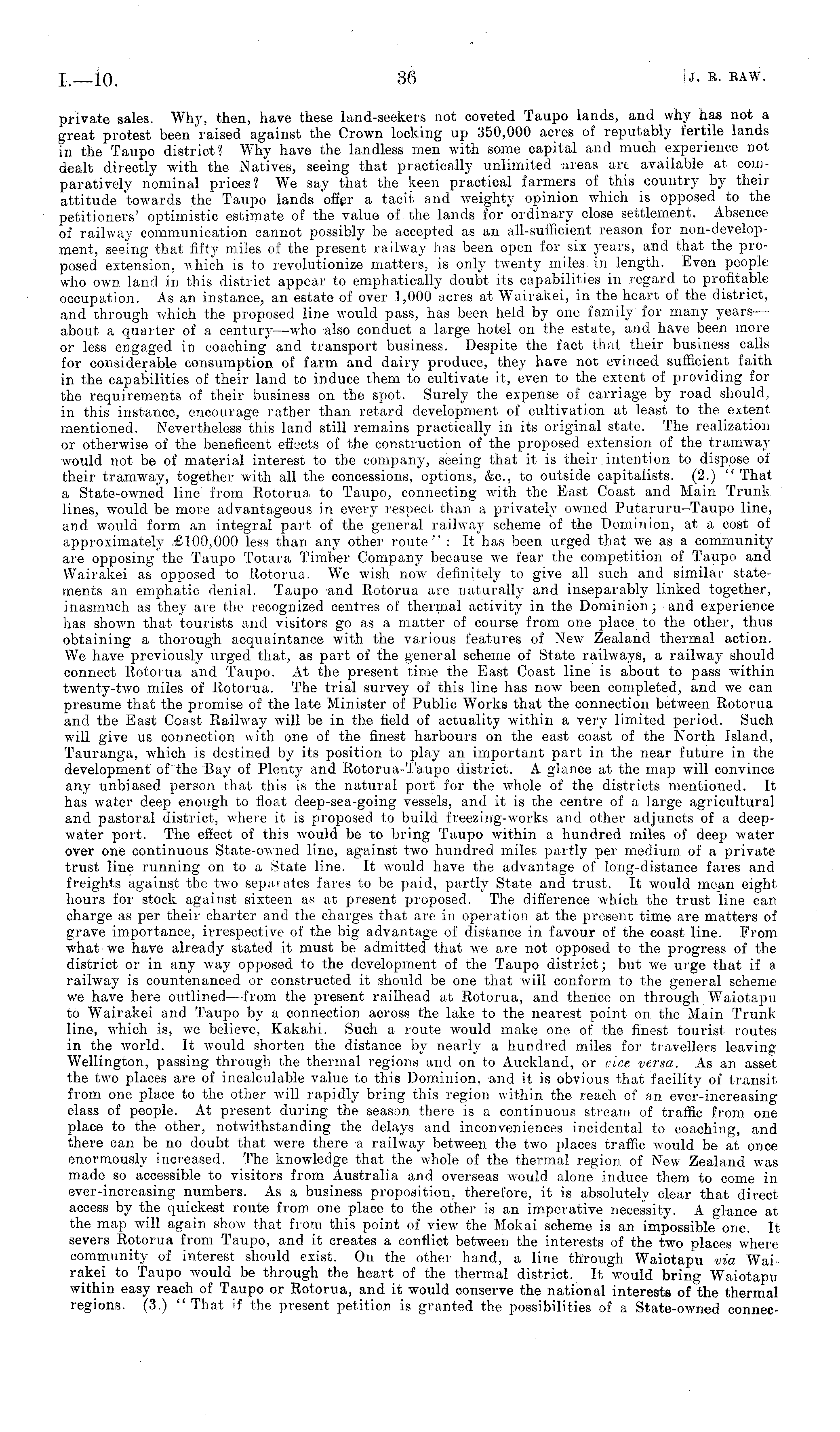 private sales. Why, then, have these land-seekers not coveted Taupo lands, and why has not a great protest been raised against the Crown locking up 350,000 acres of reputably fertile lands in the Taupo district? Why have the landless men with some capital and much experience not dealt directly with the Natives, seeing that practically unlimited areas art available at comparatively nominal prices? We say that the keen practical farmers of this country by their attitude towards the Taupo lands offer a tacit and weighty opinion which is opposed to the petitioners' optimistic estimate of the value of the lands for ordinary close settlement. Absence of railway communication cannot possibly be accepted as an all-sufficient reason for non-develop-ment, seeing that fifty miles of the present railway has been open for six years, and that the proposed extension, which is to revolutionize matters, is only twenty miles in length. Even people who own land in this district appear to emphatically doubt its capabilities in regard to profitable occupation. As an instance, an estate of over 1,000 acres at Wairakei, in the heart of the district, and through which the proposed line would pass, has been held by one family for many years — about a quarter of a century—who also conduct a large hotel on the estate, and have been more or less engaged in coaching and transport business. Despite the fact that their business calls for considerable consumption of farm and dairy produce, they have not evinced sufficient faith in the capabilities of their land to induce them to cultivate it, even to the extent of providing for the requirements of their business on the spot. Surely the expense of carriage by road should, in this instance, encourage rather than retard development of cultivation at least to the extent mentioned. Nevertheless this land still remains practically in its original state. The realization or otherwise of the beneficent effects of the construction of the proposed extension of the tramway would not be of material interest to the company, seeing that it is their. intention to dispose of their tramway, together with all the concessions, options, &c, to outside capitalists. (2.) " That a State-owned line from Rotorua to Taupo, connecting with the East Coast and Main Trunk lines, would be more advantageous in every respect than a privately owned Putaruru-Taupo line, and would form an integral part of the general railway scheme of the Dominion, at a cost of approximately £100,000 less than any other route" : It has been urged that we as a community are opposing the Taupo Totara Timber Company because we fear the competition of Taupo and Wairakei as opposed to Rotorua. We wish now definitely to give all such and similar statements an emphatic denial. Taupo and Rotorua are naturally and inseparably linked together, inasmuch as they are the recognized centres of thermal activity in the Dominion; and experience has shown that tourists and visitors go as a mutter of course from one place to the other, thus obtaining a thorough acquaintance with the various features of New Zealand thermal action. We have previously urged that, as part of the general scheme of State railways, a railway should connect Rotorua and Taupo. At the present time the East Coast line is about to pass within twenty-two miles of Rotorua. The trial survey of this line has now been completed, and we can presume that the promise of the late Minister of Public Works that the connection between Rotorua and the East Coast Railway will be in the field of actuality within a very limited period. Such will give us connection with one of the finest harbours on the east coast of the North Island, Tauranga, which is destined by its position to play an important part in the near future in the development of the Bay of Plenty and Rotorua-Taupo district. A glance at the map will convince any unbiased person that this is the natural port for the whole of the districts mentioned. It has water deep enough to float deep-sea-going vessels, and it is the centre of a large agricultural and pastoral district, where it is proposed to build freezing-works and other adjuncts of a deepwater port. The effect of this would be to bring Taupo within a hundred miles of deep water over one continuous State-owned line, against two hundred miles partly per medium of a private trust line running on to a State line. It would have the advantage of long-distance fares and freights against the two separates fares to be paid, partly State and trust. It would mean eight hours for stock against sixteen as at present proposed. The difference which the trust line can charge as per their charter ami the charges that are in operation at the present time are matters of grave importance, irrespective of the big advantage of distance in favour of the coast line. From what we have already stated it must be admitted that we are not opposed to the progress of the district or in any way opposed to the development of the Taupo district; but we urge that if a railway is countenanced or constructed it should be one that will conform to the general scheme we have here outlined —from the present railhead at Rotorua, and thence on through Waiotapu to Wairakei and Taupo by a connection across the lake to the nearest point on the Main Trunk line, which is, we believe, Kakahi. Such a route would make one of the finest tourist routes in the w r orld. It would shorten the distance by nearly a hundred miles for travellers leaving Wellington, passing through the thermal regions and on to Auckland, or vice versa. As an asset the two places are of incalculable value to this Dominion, and it is obvious that facility of transit from one place to the other will rapidly bring this region within the reach of an ever-increasing class of people. At present during the season there is a continuous stream of traffic from one place to the other, notwithstanding the delays and inconveniences incidental to coa
