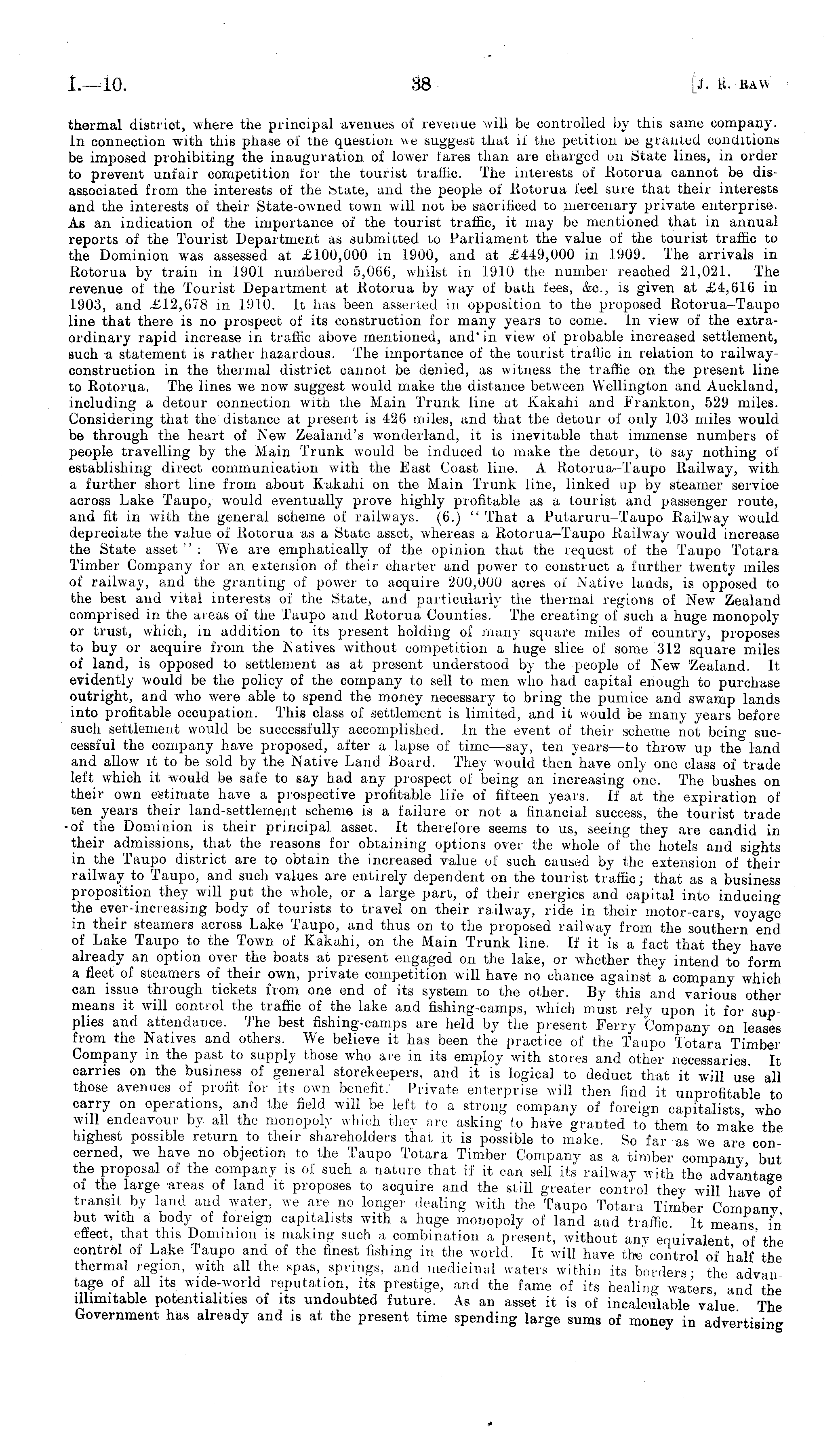 thermal district, where the principal avenues of revenue will be controlled by this same company, in connection with this phase oi' the question we suggest that if the petition oe granted conditions be imposed prohibiting the inauguration of lower tares than are charged on State lines, in order to prevent unfair competition tor the tourist traffic. The interests of Rotorua cannot be disassociated from the interests of the (state, and the people of Rotorua feel sure that their interests and the interests of their State-owned town will not be sacrificed to mercenary private enterprise. As an indication of the importance of the tourist traffic, it may be mentioned that in annual reports of the Tourist Department as submitted to Parliament the value of the tourist traffic to the Dominion was assessed at £100,000 in 1900, and at £449,000 in 1909. The arrivals in Rotorua by train in 1901 numbered 5,066, whilst in 1910 the number reached 21,021. The revenue of the Tourist Department at Rotorua by way of bath fees, &c, is given at £4,616 in 1903, and £12,678 in 1910. It has been asserted in opposition to the proposed Rotorua—Taupo line that there is no prospect of its construction for many years to come. In view of the extraordinary rapid increase in traffic above mentioned, and' in view of probable increased settlement, such a statement is rather hazardous. The importance of the tourist traffic in relation to railwayconstruction in the thermal district cannot be denied, as witness the traffic on the present line to Kotorua. The lines we now suggest would make the distance between Wellington and Auckland, including a detour connection with the Main Trunk line at Kakahi and Frankton, 529 miles. Considering that the distance at present is 426 miles, and that the detour of only 103 miles would be through the heart of New Zealand's wonderland, it is inevitable that immense numbers of people travelling by the Main Trunk would be induced to make the detour, to say nothing of establishing direct communication with the East Coast line. A Rotorua-Taupo Railway, with a further short line from about Kakahi on the Main Trunk line, linked up by steamer service across Lake Taupo, would eventually prove highly profitable as a tourist and passenger route, and fit in with the general scheme of railways. (6.) " That a Putaruru-Taupo Railway would depreciate the value of Rotorua as a State asset, whereas a Rotorua—Taupo Railway would increase the State asset": We are emphatically of the opinion that the request of the Taupo Totara Timber Company for an extension of their charter and power to construct a further twenty miles of railway, and the granting of power to acquire 200,000 acres of Native lands, is opposed to the best and vital interests of the State, and particularly the thermal regions of New Zealand comprised in the areas of the Taupo and Rotorua Counties. The creating of such a huge monopoly or trust, which, in addition to its present holding of many square miles of country, proposes to buy or acquire from the Natives without competition a huge slice of some 312 square miles of land, is opposed to settlement as at present understood by the people of New Zealand. It evidently would be the policy of the company to sell to men who had capital enough to purchase outright, and who were able to spend the money necessary to bring the pumice and swamp lands into profitable occupation. This class of settlement is limited, and it would be many years before such settlement would be successfully accomplished. In the event of their scheme not being successful the company have proposed, after a lapse of time—say, ten years —to throw up the land and allow it to be sold by the Native Land Board. They would then have only one class of trade left which it would be safe to say had any prospect of being an increasing one. The bushes on their own estimate have a prospective profitable life of fifteen years. If at the expiration of ten years their land-settlement scheme is a failure or not a financial success, the tourist trade •of the Dominion is their principal asset. It therefore seems to us, seeing they are candid in their admissions, that the reasons for obtaining options over the whole of the hotels and sights in the Taupo district are to obtain the increased value of such caused by the extension of their railway to Taupo, and such values are entirely dependent on the tourist traffic; that as a business proposition they will put the whole, or a large part, of their energies and capital into inducing the ever-increasing body of tourists to travel on their railway, ride in their motor-cars, voyage in their steamers across Lake Taupo, and thus on to the proposed railway from the southern end of Lake Taupo to the Town of Kakahi, on the Main Trunk line. If it is a fact that they have already an option over the boats at present engaged on the lake, or whether they intend to form a fleet of steamers of their own, private competition will have no chance against a company which can issue through tickets from one end of its system to the other. By this and various other means it will control the traffic of the lake and fishing-camps, which must rely upon it for supplies and attendance. The best fishing-camps are held by the present Ferry Company on leases from the Natives and others. We believe it has been the practice of the Taupo Totara Timber Company in the past to supply those who are in its employ with stores and other necessaries. It carries on the business of general storekeepers, and it is logical to deduct that it will use all those avenues of profit for its own benefit. Private enterprise will then find it unprofitable to carry on operations, and the field will be left to a strong company of foreign capitalists, who will endeavour by all the monopoly which they are asking to have granted to them to make the highest possible return to their shareholders that it is possible to make. So far as we are concern