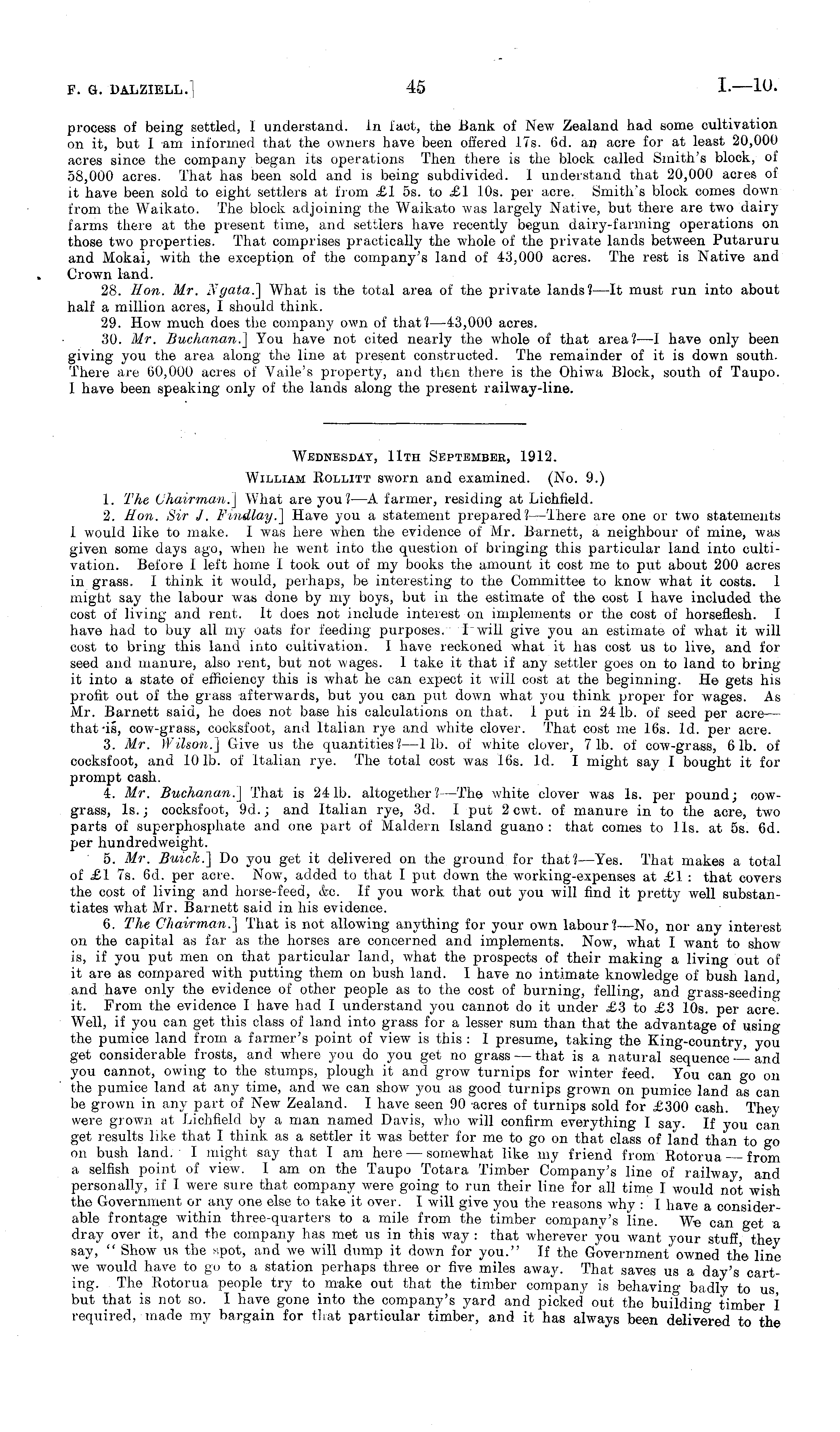 Wednesday, 11th September, 1912. William Rollitt sworn and examined. (No. 9.) 1. The Chairman.] What are you? —A farmer, residing at Lichfield. 2. Hon. Sir J. Findlay.] Have you a statement prepared? —There are one or two statements I would like to make. I was here when the evidence of Mr. Barnett, a neighbour of mine, was given some days ago, when he went into the question of bringing this particular land into cultivation. Before I left home 1 took out of my books the amount it cost me to put about 200 acres in grass. I think it would, perhaps, be interesting to the Committee to know what it costs. 1 migrit say the labour was done by my boys, but in the estimate of the cost I have included the cost of living and rent, it does not include interest on implements or the cost of horseflesh. I have liad to buy all my oats for feeding purposes. I will give you an estimate of what it will cost to bring this land into cultivation. I have reckoned what it has cost us to live, and for seed and manure, also rent, but not wages. 1 take it that if any settler goes on to land to bring it into a state of efficiency this is what he can expect it will cost at the beginning. He gets his profit out of the grass afterwards, but you can put down what you think proper for wages. As Mr. Barnett said, he does not base his calculations on that. 1 put in 241b. of seed per acre — that-is, cow-grass, cocksfoot, and Italian rye and white clover. That cost me 16s. Id. per acre. 3. Mr. Wilson.] Give us the quantities? —lib. of white clover, 7 Ib. of cow-grass, 61b. of cocksfoot, and 10 Ib. of Italian rye. The total cost was 16s. Id. I might say I bought it for prompt cash. 4. Mr. Buchanan.] That is 241b. altogether?—The white clover was Is. per pound; oowgrass, Is.; cocksfoot, 9d.; and Italian rye, 3d. I put 2 cwt. of manure in to the acre, two parts of superphosphate and one part of Maldern Island guano: that comes to lis. at ss. 6d. per hundredweight. 5. Mr. Buick.] Do you get it delivered on the ground for that?—Yes. That makes a total of £1 7s. 6d. per acre. Now, added to that I put down the working-expenses at £1 : that covers the cost of living and horse-feed, &c. If you work that out you will find it pretty well substantiates what Mr. Barnett said in his evidence. 6. The Chairman.] That is not allowing anything for your own labour?—No, nor any interest on the capital as far as the horses are concerned and implements. Now, what I want to show is, if you put men on that particular land, what the prospects of their making a living out of it are as compared with putting them on bush land. I have no intimate knowledge of bush land, and have only the evidence of other people as to the cost of burning, felling, and grass-seeding it. From the evidence I have had I understand you cannot do it under £3 to £3 10s. per acre. Well, if you can get this class of land into grass for a lesser sum than that the advantage of using the pumice land from a farmer's point of view is this : I presume, taking the King-country, you get considerable frosts, and where you do you get no grass — that is a natural sequence and you cannot, owing to the stumps, plough it and grow turnips for winter feed. You can go on trie pumice land at any time, and we can show you as good turnips grown on pumice land as can be grown in any part of New Zealand. I have seen 90 acres of turnips sold for £300 cash. They were grown at Lichfield by a man named Davis, who will confirm everything I say. If you can get results like that I think as a settler it was better for me to go on that class of land than to go on bush land. I might say that lam here — somewhat like my friend from Rotorua from a selfish point of view. I am on the Taupo Totara Timber Company's line of railway, and personally, if I were sure that company were going to run their line for all time I would not wish the Government or any one else to take it over. I will give you the reasons why : I have a considerable frontage within three-quarters to a mile from the timber company's line. We can get a dray over it, and the company has met us in this way : that wherever you want your stuff, they say, " Show us the spot, and we will dump it down for you." If the Government owned the line we would have to go to a station perhaps three or five miles away. That saves us a day's carting. The Rotorua people try to make out that the timber company is behaving badly to us, but that is not so. I have gone into the company's yard and picked out the building timber I required, made my bargain for that particular timber, and it has always been delivered to the