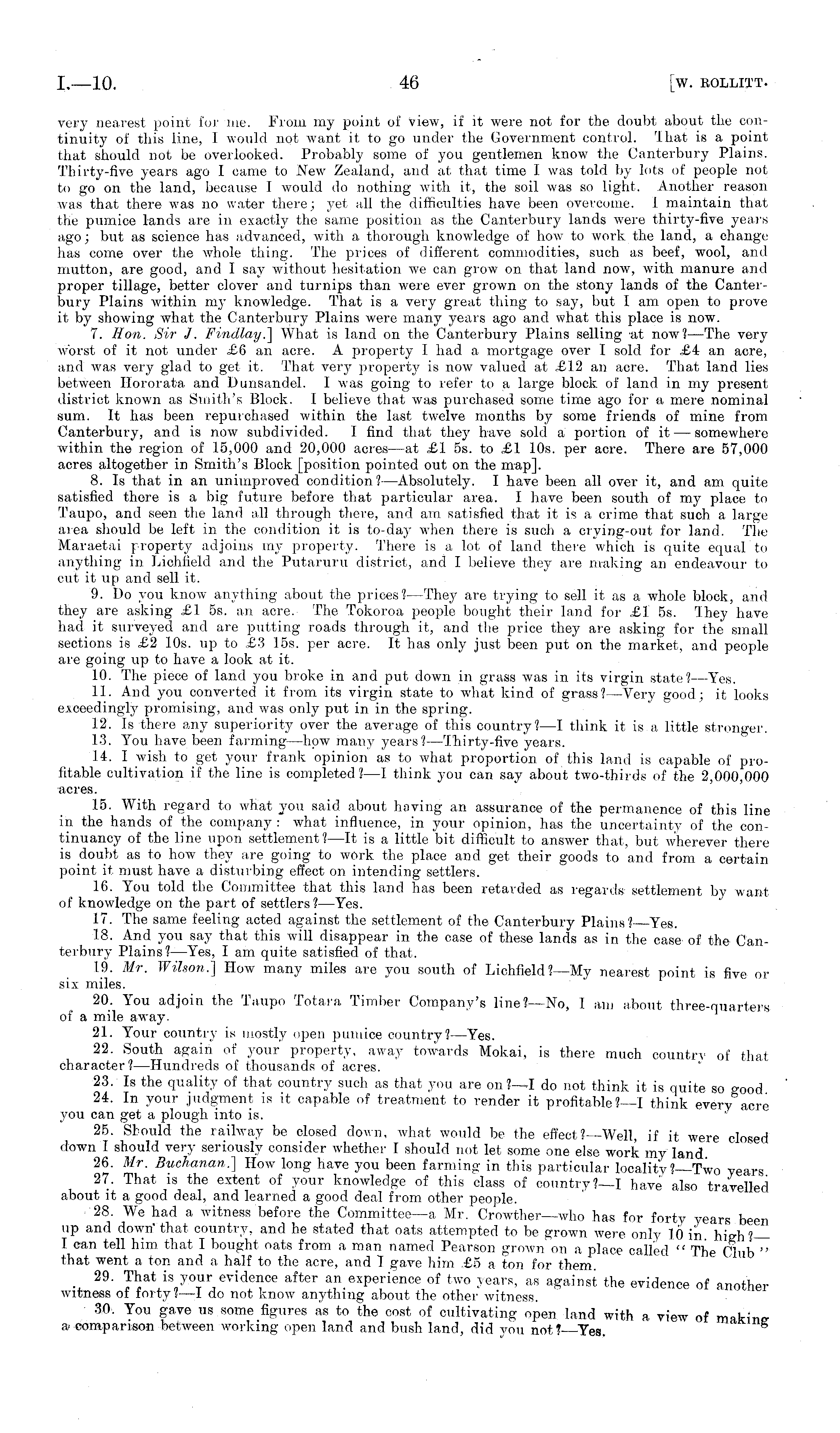 very nearest point for me. From my point of view, if it were not for the doubt about the continuity of this line, I would not want it to go under the Government control. That is a point that should not be overlooked. Probably some of you gentlemen know the Canterbury Plains. Thirty-five years ago I came to New Zealand, and at that time I was told by lots of people not to go on the land, because I would do nothing with it, the soil was so light. Another reason was that there was no water there; yet all the difficulties have been overcome. 1 maintain that the pumice lands are in exactly the same position as the Canterbury lands were thirty-five years ago; but as science has advanced, with a thorough knowledge of how to work the land, a change has come over the whole thing. The prices of different commodities, such as beef, wool, and mutton, are good, and 1 say without hesitation we can grow on that land now, with manure and proper tillage, better clover and turnips than were ever grown on the stony lands of the Canterbury Plains within my knowledge. That is a very great thing to say, but I am open to prove it by showing what the Canterbury Plains were many years ago and what this place is now. 7. Hon. Sir J. Findlay.] What is land on the Canterbury Plains selling at now? —The very worst of it not under £6 an acre. A property I had a mortgage over I sold for £4 an acre, and was very glad to get it. That very property is now valued at £12 an acre. That land lies between Hororata and Dunsandel. I was going to refer to a large block of land in my present district known as Smith's Block. I believe that was purchased some time ago for a mere nominal sum. It has been repurchased within the last twelve months by some friends of mine from Canterbury, and is now subdivided. I find that they have sold a portion of it — somewhere within the region of 15,000 and 20,000 acres —at £1 ss. to £1 10s. per acre. There are 57,000 acres altogether in Smith's Block [position pointed out on the map], 8. Is that in an unimproved condition? —Absolutely. I have been all over it, and am. quite satisfied there is a big future before that particular area. I have been south of my place to Taupo, and seen the land all through there, and am satisfied that it is a crime that such a large area should be left in the condition it is to-day when there is such a crying-out for land. The Maraetai property adjoins my property. There is a lot of land there which is quite equal to anything in Lichfield and the Putaruru district, and I believe they are making an endeavour to cut it up and sell it. 9. Do you know anything about the prices?—They are trying to sell it as a whole block, and they are asking £1 ss. an acre. The Tokoroa people bought their land for £1 ss. They have had it surveyed and are putting roads through it, and the price they are asking for the small sections is £2 10s. up to £3 15s. per acre. It has only just been put on the market, and people are going up to have a look at it. 10. The piece of land you broke in and put down in grass was in its virgin state? —Yes. 11. And you converted it from its virgin state to what kind of grass?—Very good; it looks exceedingly promising, and was only put in in the spring. 12. is there any superiority over the average of this country?—l think it is a little stronger. 13. You have been farming—how many years? —Thirty-five years. 14. I wish to get your frank opinion as to what proportion of this land is capable of profitable cultivation if the line is completed?—l think you can say about two-thirds of the 2,000,000 acres. 15. With regard to what you said about having an assurance of the permanence of this line in the hands of the company: what influence, in your opinion, has the uncertainty of the continuancy of the line upon settlement?—lt is a little bit difficult to answer that, but wherever there is doubt as to how they are going to work the place and get their goods to and from a certain point it must have a disturbing effect on intending settlers. 16. You told the Committee that this land has been retarded as regards settlement by want of knowledge on the part of settlers?—Yes. 17. The same feeling acted against the settlement of the Canterbury Plains? Yes. 18. And you say that this will disappear in the case of these lands as in the case of the Canterbury Plains?—Yes, I am quite satisfied of that. 19. Mr. Wilson.] How many miles are you south of Lichfield? —My nearest point is five or six miles. 20. You adjoin the Taupo Totara Timber Company's line?—No, I am about three-quarters of a mile away. 21. Your country is mostly open pumice country? —Yes. 22. South again of .vour property, away towards Mokai, is there much country of that character?—Hundreds of thousands of acres. 23. Is the quality of that country such as that you are on?—-I do not think it is quite so good 24. In your judgment is it capable of treatment to render it profitable?—l think every acre you can get a plough into is. 25. Should the railway be closed down, what would be the effect ?—Well, if it were closed down I should very seriously consider whether I should not let some one else work my land 26. Mr. Buchanan.] How long have you been farming in this particular locality?—Two years 27. That is the extent of your knowledge of this class of country?—l have also travelled about it a good deal, and learned a good deal from other people. 28. We had a witness before the Committee—a Mr. Crowther—who has for forty years been up and down' that country, and he stated that oats attempted to be grown were only 10 in high?— I can tell him that I bought oats from a man named Pearson grown on a place called " The Club " that went a ton and a half to the acre, and 1 gave him £5 a ton for them. 29. That is your evidence after an experience of two years, as against, the evidence of another witness of forty? —I do not know anything about the other witness. 30.