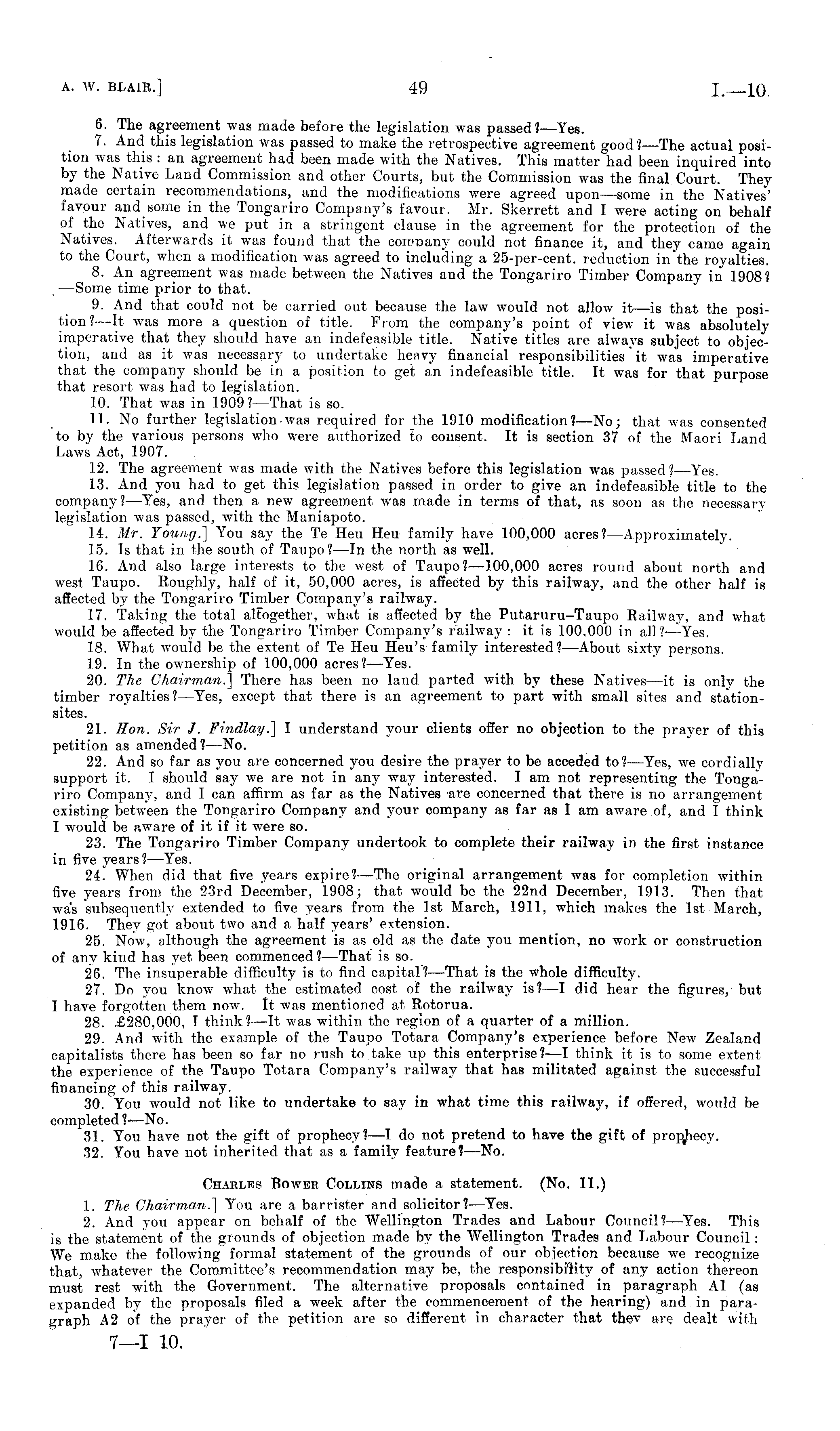 6. The agreement was made before the legislation was passed?—Yes. 7. And this legislation was passed to make the retrospective agreement good?—The actual position was this :an agreement had been made with the Natives. This matter had been inquired into by the Native Land Commission and other Courts, but the Commission was the final Court. They made certain recommendations, and the modifications were agreed upon —some in the Natives' favour and some in the Tongariro Company's favour. Mr. Skerrett and I were acting on behalf of the Natives, and we put in a stringent clause in the agreement for the protection of the Natives. Afterwards it was found that the company could not finance it, and they came again to the Court, when a modification was agreed to including a 25-per-cent. reduction in the royalties. 8. An agreement was made between the Natives and the Tongariro Timber Company in 1908? —Some time prior to that. 9. And that could not be carried out because the law would not allow it —is that the position?—lt was more a question of title. From the company's point of view it was absolutely imperative that they should have an indefeasible title. Native titles are always subject to objection, and as it was necessary to undertake heavy financial responsibilities it was imperative that the company should be in a position to get an indefeasible title. It was for that purpose that resort was had to legislation. 10. That was in 1909?—That is so. 11. No further legislation.was required for the 1910 modification ?—No; that was consented to by the various persons who were authorized to consent. It is section 37 of the Maori Land Laws Act, 1907. 12. The agreement was made with the Natives before this legislation was passed?—Yes. 13. And you had to get this legislation passed in order to give an indefeasible title to the company? —Yes, and then a new agreement was made in terms of that, as soon as the necessary legislation was passed, with the Maniapoto. 14. Mr. Young.] You say the Te Heu Heu family have 100,000 acres? —Approximately. 15. Is that in the south of Taupo?—ln the north as well. 16. And also large interests to the west of Taupo?—100,000 acres round about north and west Taupo. Roughly, half of it, 50,000 acres, is affected by this railway, and the other half is affected by the Tongariro Timber Company's railway. 17. Taking the total altogether, what is affected by the Putaruru-Taupo Railway, and what would be affected by the Tongariro Timber Company's railway : it is 100,000 in all? —Yes. 18. What would be the extent of Te Heu Heu's family interested? —About sixty persons. 19. In the ownership of 100,000 acres? —Yes. 20. The Chairman.] There has been no land parted with by these Natives—it is only the timber royalties? —Yes, except that there is an agreement to part with small sites and stationsites. 21. Hon. Sir J. Findlay.] I understand your clients offer no objection to the prayer of this petition as amended? —No. 22. And so far as you are concerned you desire the prayer to be acceded to?—Yes, we cordially support it. I should say we are not in any way interested. I am not representing the Tongariro Company, and I can affirm as far as the Natives are concerned that there is no arrangement existing between the Tongariro Company and your company as far as I am aware of, and I think I would be aware of it if it were so. 23. The Tongariro Timber Company undertook to complete their railway in the first instance in five years? —Yes. 24. When did that five years expire?—The original arrangement was for completion within five years from the 23rd December, 1908; that would be the 22nd December, 1913. Then that was subsequently extended to five years from the Ist March, 1911, which makes the Ist March, 1916. They got about two and a half years' extension. 25. Now, although the agreement is as old as the date you mention, no work or construction of any kind has yet been commenced? —That is so. 26. The insuperable difficulty is to find capital?—That is the whole difficulty. 27. Do you know what the estimated cost of the railway is?—l did hear the figures, but I have forgotten them now. It was mentioned at Rotorua. 28. £280,000, I think? —It was within the region of a quarter of a million. 29. And with the example of the Taupo Totara Company's experience before New Zealand capitalists there has been so far no rush to take up this enterprise?—l think it is to some extent the experience of the Taupo Totara Company's railway that has militated against the successful financing of this railway. 30. You would not like to undertake to say in what time this railway, if offered, would be completed ?—No. 31. You have not the gift of prophecy?—l do not pretend to have the gift of propliecy. 32. You have not inherited that as a family feature? —No. Charles Bower Collins made a statement. (No. 11.) 1. The Chairman.] You are a barrister and solicitor?—Yes. 2. And you appear on behalf of the Wellington Trades and Labour Council? —Yes. This is the statement of the grounds of objection made by the Wellington Trades and Labour Council: We make the following formal statement of the grounds of our objection because we recognize that, whatever the Committee's recommendation may be, the responsibility of any action thereon must rest with the Government. The alternative proposals contained in paragraph Al (as expanded by the proposals filed a week after the commencement of the hearing) and in paragraph A2 of the prayer of the petition are so different in character that they are dealt with