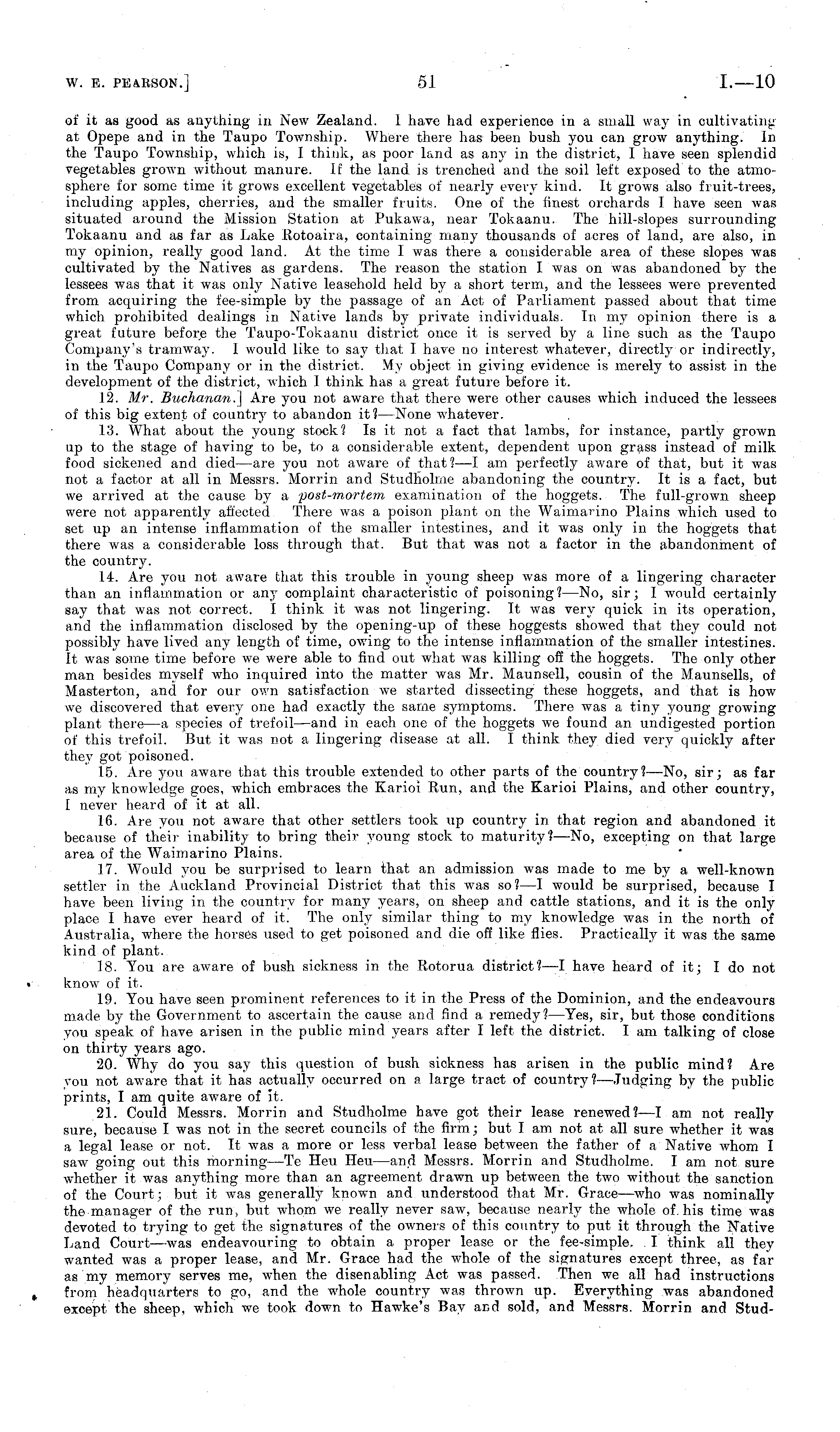 of it as good as anything in New Zealand. 1 have had experience in a small way in cultivating at Opepe and in the Taupo Township. Where there has been bush you can grow anything. In the Taupo Township, which is, I think, as poor land as any in the district, I have seen splendid vegetables grown without manure. If the land is trenched and the soil left exposed to the atmosphere for some time it grows excellent vegetables of nearly every kind. It grows also fruit-trees, including apples, cherries, and the smaller fruits. One of the finest orchards I have seen was situated around the Mission Station at Pukawa, near Tokaanu. The hill-slopes surrounding Tokaanu and as far as Lake Rotoaira, containing many thousands of acres of land, are also, in my opinion, really good land. At the time I was there a considerable area of these slopes was cultivated by the Natives as gardens. The reason the station I was on was abandoned by the lessees was that it was only Native leasehold held by a short term, and the lessees were prevented from acquiring the fee-simple by the passage of an Act of Parliament passed about that time which prohibited dealings in Native lands by private individuals. In my opinion there is a great future before the Taupo-Tokaanu district once it is served by a line such as the Taupo Company's tramway. I would like to say that I have no interest whatever, directly or indirectly, in the Taupo Company or in the district. My object in giving evidence is merely to assist in the development of the district, which I think has a great future before it. 12. Mr. Buchanan.] Are you not aware that there were other causes which induced the lessees of this big extent of country to abandon it? —None whatever. 13. What about the young stock? Is it not a fact that lambs, for instance, partly grown up to the stage of having to be, to a considerable extent, dependent upon grass instead of milk food sickened and died—are you not aware of that ?—I am perfectly aware of that, but it was not a factor at all in Messrs. Morrin and Studholme abandoning the country. It is a fact, but we arrived at the cause by a post-mortem examination of the hoggets. The full-grown sheep were not apparently affected There was a poison plant on the Waimarino Plains which used to set up an intense inflammation of the smaller intestines, and it was only in the hoggets that there was a considerable loss through that. But that was not a factor in the abandonment of the country. 14. Are you not aware that this trouble in young sheep was more of a lingering character than an inflammation or any complaint characteristic of poisoning? —No, sir; I would certainly say that was not correct. I think it was not lingering. It was very quick in its operation, and the inflammation disclosed by the opening-up of these hoggests showed that they could not possibly have lived any length of time, owing to the intense inflammation of the smaller intestines. It was some time before we were able to find out what was killing off the hoggets. The only other man besides myself who inquired into the matter was Mr. Maunsell, cousin of the Maunsells, of Masterton, and for our own satisfaction we started dissecting these hoggets, and that is how we discovered that every one had exactly the same symptoms. There was a tiny young growing plant there—a species of trefoil —and in each one of the hoggets we found an undigested portion of this trefoil. But it was not a lingering disease at all. I think they died very quickly after they got poisoned. 15. Are you aware that this trouble extended to other parts of the country?—No, sir; as far as my knowledge goes, which embraces the Karioi Run, and the Karioi Plains, and other country, I never heard of it at all. 16. Are you not aware that other settlers took up country in that region and abandoned it because of their inability to bring their young stock to maturity?—No, excepting on that large area of the Waimarino Plains. 17. Would you be surprised to learn that an admission was made to me by a well-known settler in the Auckland Provincial District that this was so? —I would be surprised, because I have been living in the country for many years, on sheep and cattle stations, and it is the only place I have ever heard of it. The only similar thing to my knowledge was in the north of Australia, where the horses used to get poisoned and die off like flies. Practically it was the same kind of plant. 18. You are aware of bush sickness in the Rotorua district?—l have heard of it; I do not know of it. 19. You have seen prominent references to it in the Press of the Dominion, and the endeavours made by the Government to ascertain the cause and find a remedy? —Yes, sir, but those conditions you speak of have arisen in the public mind years after I left the district. lam talking of close on thirty years ago. 20. Why do you say this question of bush sickness has arisen in the public mind? Are you not aware that it has actually occurred on a large tract of country?—Judging by the public prints, I am quite aware of it. 21. Could Messrs. Morrin and Studholme have got their lease renewed?—l am not really sure, because I was not in the secret councils of the firm; but I am not at all sure whether it was a legal lease or not. It was a more or less verbal lease between the father of a Native whom I saw going out this morning—Te Heu Heu —and Messrs. Morrin and Studholme. I am not sure whether it was anything more than an agreement drawn up between the two without the sanction of the Court; but it was generally known and understood that Mr. Grace—who was nominally the manager of the run, but whom we really never saw, because nearly the whole of. his time was devoted to trying to get the signatures of the owners of this country to put it through the Native Land Courts—was endeavouring to obtain a proper lease or the fee-simple. . I think all they wanted was a proper lease, and Mr. Grace had the whol