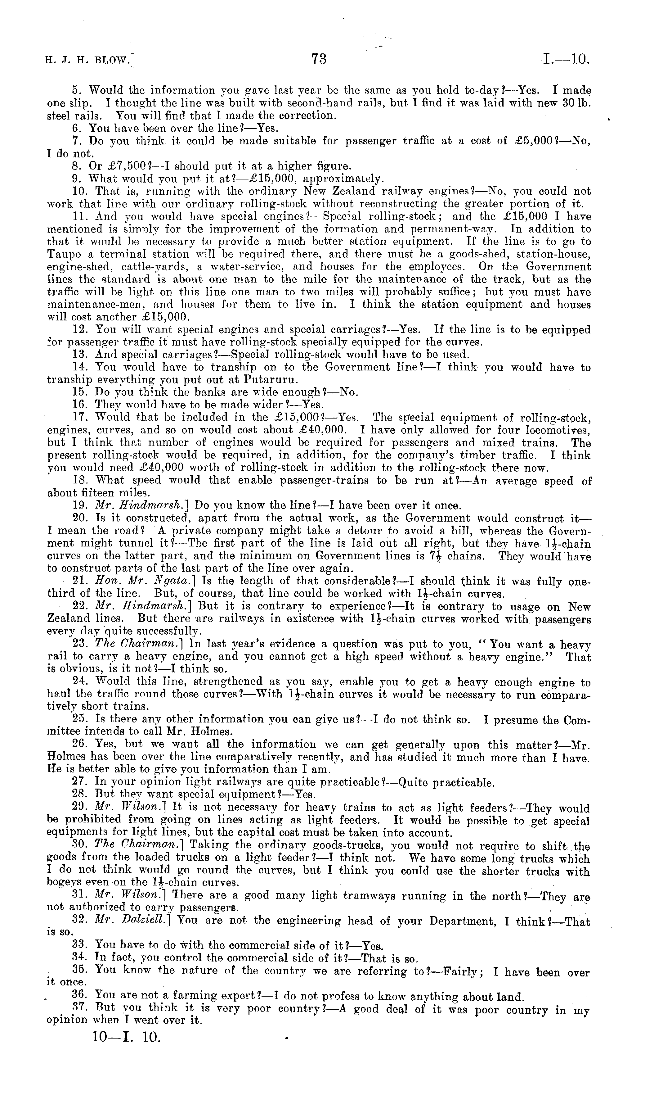 5. Would the information you gave last year be the same as you hold to-day?—Yes. I made one slip. I thought the line was built with second-hand rails, but I find it was laid with new 301b. steel rails. You will find that I made the correction. 6. You have been over the line? —Yes. 7. Do you think it could be made suitable for passenger traffic at a cost of £5,000? —No, I do not. 8. Or £7,500? —I should put it at a higher figure. 9. What would you put it at?—£ls,ooo, approximately. 10. That is, running with the ordinary New Zealand railway engines?—No, you could not work that line with our ordinary rolling-stock without reconstructing the greater portion of it. 11. And you would have special engines?—Special rolling-stock; and the £15,000 I have mentioned is simply for the improvement of the formation and permanent-way. In addition to that it would be necessary to provide a much better station equipment. If the line is to go to Taupo a terminal station will be required there, and there must be a goods-shed, station-house, engine-shed, cattle-yards, a water-service, and houses for the employees. On the Government lines the standard is about one man to the mile for the maintenance of the track, but as the traffic will be light on this line one man to two miles will probably suffice; but you must have maintenance-men, and houses for them to live in. I think the station equipment and houses will cost another £15,000. 12. You will want special engines and special carriages? —Yes. If the line is to be equipped for passenger traffic it must have rolling-stock specially equipped for the curves. 13. And special carriages?—Special rolling-stock would have to be used. 14. You would have to tranship on to the Government line?—l think you would have to tranship everything you put out at Putaruru. 15. Do you think the banks are wide enough? —No. 16. They would have to be made wider?—Yes. 17. Would that be included in the £15,000? —Yes. The special equipment of rolling-stock, engines, curves, and so on xvould cost about £40,000. I have only allowed for four locomotives, but I think that number of engines xvould be required for passengers and mixed trains. The present rolling-stock would be required, in addition, for the company's timber traffic. I think you would need £40,000 worth of rolling-stock in addition to the rolling-stock there now. 18. What speed would that enable passenger-trains to be run at?—An average speed of about fifteen miles. 19. Mr. Hindmarsh.] Do you know the line? —I have been over it once. 20. Is it constructed, apart from the actual work, as the Government would construct it— I mean the road? A private company might take a detour to avoid a hill, whereas the Government might tunnel it?—The first part of the line is laid out all right, but they have curves on the latter part, and the minimum on Government lines is 7J chains. They would have to construct parts of the last part of the line over again. 21. Hon. Mr. Ngata.] Is the length of that considerable?—l should think it was fully onethird of the line. But, of course, that line could be worked with lj-chain curves. 22. Mr. Hindmarsh.] But it is contrary to experience?—lt is contrary to usage on New Zealand lines. But there are railways in existence with IJ-chain curves worked with passengers every day quite successfully. 23. The Chairman.] In last year's evidence a question was put to you, " You want a heavy rail to carry a heavy engine, and you cannot get a high speed without a heavy engine." That is obvious, is it not?—l think so. 24. Would this line, strengthened as you say, enable you to get a heavy enough engine to haul the traffic round those curves? —With lj-chain curves it would be necessary to run comparatively short trains. 25. Is there any other information you can give us?—l do not think so. I presume the Committee intends to call Mr. Holmes. 26. Yes, but we want all the information we can get generally upon this matter?—Mr. Holmes has been over the line comparatively recently, and has studied it much more than I have. He is better able to give you information than I am. 27. In your opinion light railways are quite practicable?—Quite practicable. 28. But they want special equipment?—Yes. 29. Mr. Wilson.] It is not necessary for heavy trains to act as light feeders?—They would be prohibited from going on lines acting as light feeders. It would be possible to get special equipments for light lines, but the capital cost must be taken into account. 30. The Chairman.] Taking the ordinary goods-trucks, you would not require to shift the goods from the loaded trucks on a light feeder? —I think not. We have some long trucks which I do not think would go round the curves, but I think you could use the shorter trucks with bogeys even on the lj-chain curves. 31. Mr. Wilson.] There are a good many light tramways running in the north?—They are not authorized to carry passengers. 32. Mr. Dakiell.] You are not the engineering head of your Department, I think? —That is so. 33. You have to do with the commercial side of it?—Yes. 34. In fact, you control the commercial side of it? —That is so. 35. You know the nature of the country we are referring to? —Fairly; I have been over it once. 36. You are not a farming expert?—l do not profess to know anything about land. 37. But you think it is very poor country? —A good deal of it was poor country in my opinion when I went over it.