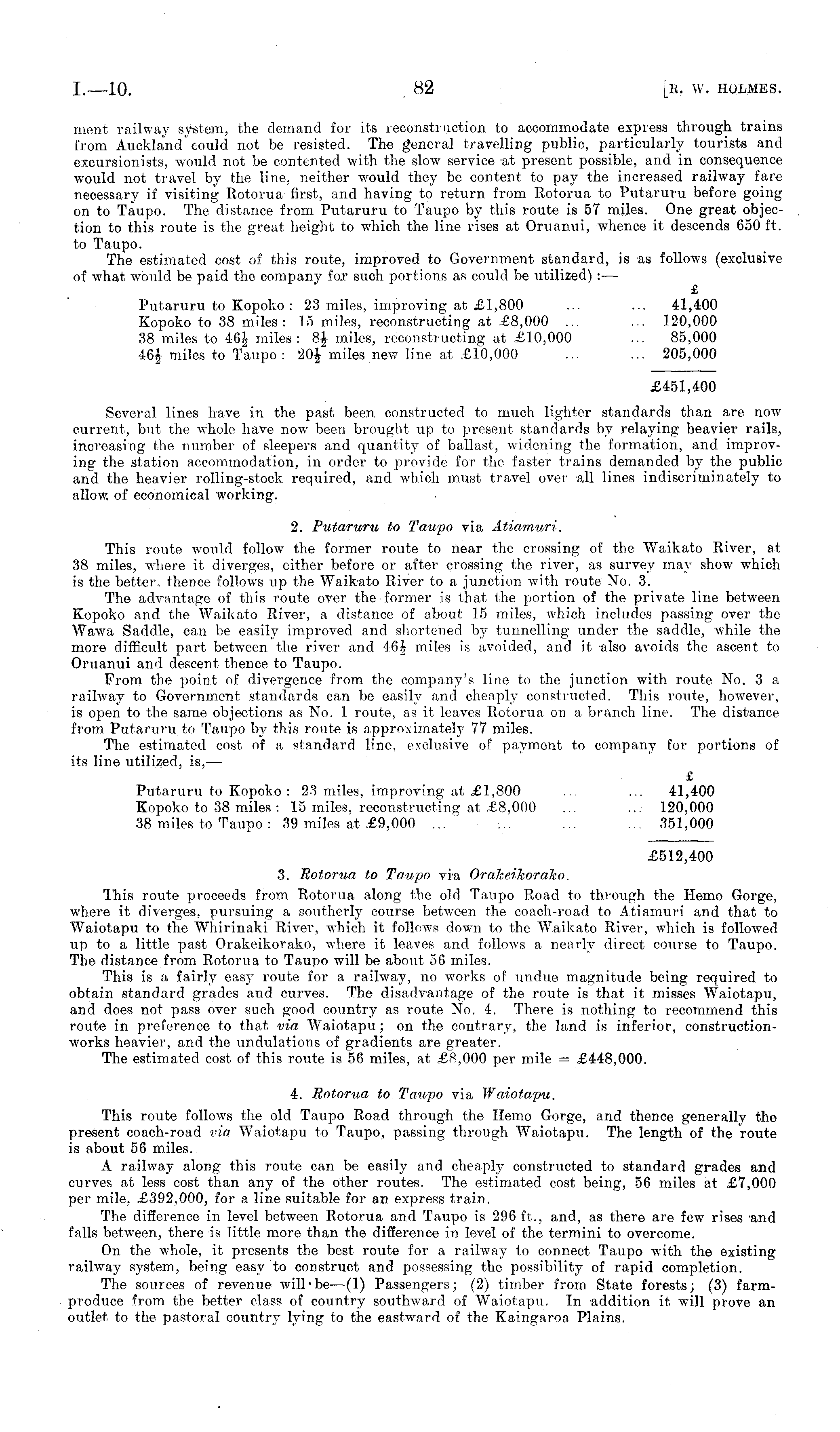 ment railway system, the demand for its reconstruction to accommodate express through trains from Auckland" could not be resisted. The general travelling public, particularly tourists and excursionists, xvould not be contented with the slow service at present possible, and in consequence xvould not travel by the line, neither xx-ould they be content to pay the increased railway fare necessary if visiting Rotorua first, and having to return from Rotorua to Putaruru before going on to Taupo. The distance from Putaruru to Taupo by this route is 57 miles. One great objection to this route is the great height to xvhich the line rises at Oruanui, whence it descends 650 ft. to Taupo. The estimated cost of this route, improved to Government standard, is as follows (exclusive of xvhat xvould be paid the company fox such portions as could be utilized) : — £ Putaruru to Kopoko :23 miles, improving at £1,800 ... ... 41,400 Kopoko to 38 miles : 15 miles, reconstructing at £8,000 ... ... 120,000 38 miles to 464 miles :8| miles, reconstructing at £10,000 ... 85,000 46| miles to Taupo : 20J miles nexv line at £10,000 ... ... 205,000 £451,400 Several lines have in the past been constructed to much lighter standards than are now current, but the xvhole have noxv been brought up to present standards by relaying heavier rails, increasing the number of sleepers and quantity of ballast, xvidening the formation, and improving the station accommodation, in order to provide for the faster trains demanded by the public and the heavier rolling-stock required, and xvhich must travel over all lines indiscriminately to alloxv, of economical working. 2. Putaruru to Taupo via Atiamuri. This route xvould folloxv the former route to near the crossing of the Waikato River, at 38 miles, where it diverges, either before or after crossing the river, as survey may show which is the better, thence folloxvs up the Waikato River to a junction xvith route No. 3. The adx r antage of this route over the former is that the portion of the private line between Kopoko and the Waikato River, a distance of about 15 miles, xvhich includes passing over the Waxva Saddle, can be easily and shortened by tunnelling under the saddle, xxdiile the more difficult part betxveen the river and 46| miles is avoided, and it -also ax r oids the ascent to Oruanui and descent thence to Taupo. From the point of divergence from the company's line to the junction with route No. 3 a railxvay to Government standards can be easily and cheaply constructed. This route, hoxvever, is open to the same objections as No. 1 route, as it leaves Rotorua on a branch line. The distance from Putaruru to Taupo by this route is approximately 77 miles. The estimated cost of a standard line, exclusive of payment to company for portions of its line utilized, is,— £ Putaruru to Kopoko: 23 miles, improving at £1,800 ... ... 41,400 Kopoko to 38 miles :15 miles, reconstructing at £8,000 ... ... 120,000 38 miles to Taupo :39 miles at £9,000 ... ... ... ... 351,000 £512,400 3. Rotorua to Taupo via Orakeikorako. This route proceeds from Rotorua along the old Taupo Road to through the Hemo Gorge, where it diverges, pursuing a southerly course betxveen the coach-road to Atiamuri and that to Waiotapu to the Whirinaki River, xx-hich it folloxvs down to the Waikato River, xvhich is followed up to a little past Orakeikorako, xvhere it leaves and folloxvs a nearly direct course to Taupo. The distance from Rotorua to Taupo will be about 56 miles. This is a fairly easy route for a railxvay, no xvorks of undue magnitude being required to obtain standard grades and curves. The disadvantage of the route is that it misses Waiotapu, and does not pass over such good country as route No. 4. There is nothing to recommend this route in preference to that via Waiotapu; on the contrary, the land is inferior, constructionxvorks heavier, and the undulations of gradients are greater. The estimated cost of this route is 56 miles, at £8,000 per mile = £448,000. 4. Rotorua to Taupo via Waiotapu. This route follows the old Taupo Road through the Hemo Gorge, and thence generally the present coach-road via Waiotapu to Taupo, passing through Waiotapu. The length of the route is about 56 miles. A railway along this route can be easily and cheaply constructed to standard grades and curves at less cost than any of the other routes. The estimated cost being, 56 miles at £7,000 per mile, £392,000, for a line suitable for an express train. The difference in level betxveen Rotorua and Taupo is 296 ft., and, as there are few rises and falls between, there is little more than the difference in level of the termini to overcome. On the xxffiole, it presents the best route for a railxvay to connect Taupo with the existing railway system, being easy to construct and possessing the possibility of rapid completion. The sources of revenue will'be—(l) Passengers; (2) timber from State forests; (3) farmproduce from the better class of country southward of Waiotapu. In addition it will prove an outlet to the pastoral country lying to the eastward of the Kaingaroa Plains.