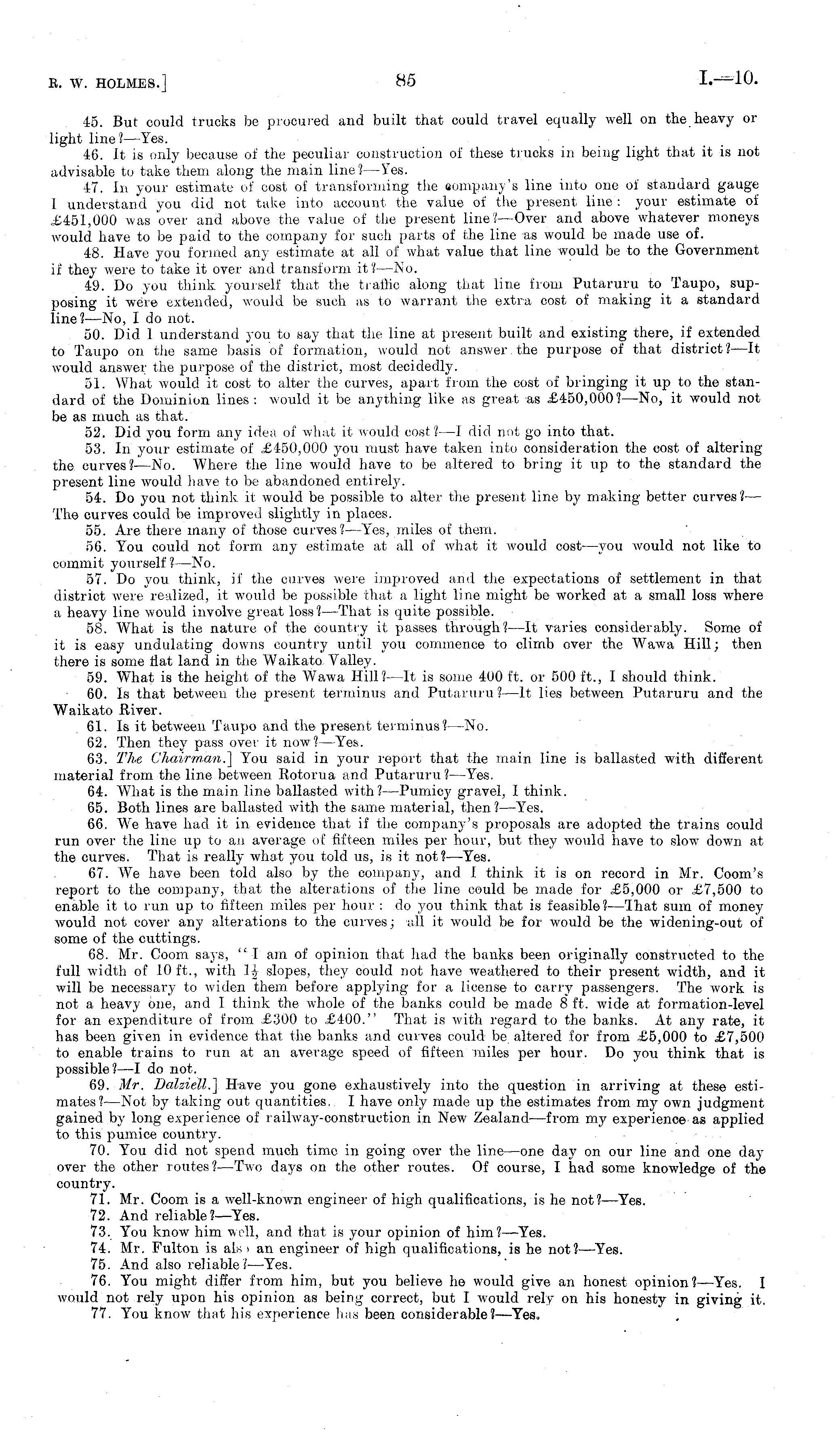45. But could trucks be procured and built that could travel equally well on the heavy or light line? —Yes. 46. It is only because of the peculiar construction of these trucks in being light that it is not advisable to take them along the main line? —Yes. 47. In your estimate of cost of transforming the eompany's line into one of standard gauge f understand you did not take into account the value of the present line: your estimate of £451,000 was over and above the value of the present line? —Over and above whatever moneys xx-ould have to be paid to the company for such parts of the line as xvould be made use of. 48. Have you formed any estimate at all of what value that line would be to the Government if they were to take it over and transform it? —No. 49. Do you think yourself that the traffic along that line from Putaruru to Taupo, supposing it xvere extended, xvould be such as to warrant the extra cost of making it a standard line? —No, I do not. 50. Did 1 understand you to say that the line at present built and existing there, if extended to Taupo on the same basis of formation, would not answer the purpose of that district? —It xvould answer the purpose of the district, most decidedly. 51. What would it cost to alter the curves, apart from the cost of bringing it up to the standard of the Dominion lines: would it be anything like as great as £450,000? —No, it would not be as much as that. 52. Did you form any idea of what it would cost? —I did not go into that. 53. In your estimate of £450,000 you must have taken into consideration the cost of altering the curves? —No. Where the line would have to be altered to bring it up to the standard the present line xvould hax r e to be abandoned entirely. 54. Do you not think it would be possible to alter the present line by making better curves? — The curves could be improved slightly in places. 55. Are there many of those curves? —Yes, miles of them. 56. You could not form any estimate at all of what it xvould cost —you would not like to commit yourself? —No. 57. Do you think, if the curves were improved and the expectations of settlement in that district xvere realized, it would be possible chat a light line might be worked at a small loss where a heavy line xvould involve great loss?—That is quite possible. 58. What is the nature of the country it passes through?—lt varies considerably. Some of it is easy undulating downs country until you commence to climb over the Waxva Hill; then there is some flat land in the Waikato Valley. 59. What is the height of the Wawa Hill?—lt is some 400 ft. or 500 ft., I should think. 60. Is that betxveen the present terminus and Putaruru? —It lies between Putaruru and the Waikato River. 61. Is it betxveen Taupo and the present terminus? —No. 62. Then they pass over it now? —Yes. 63. The Chairman.] You said in your report that the main line is ballasted xvith different material from the line between Rotorua and Putaruru? —Yes. 64. What is the main line ballasted with?—Pumicy gravel, I think. 65. Both lines are ballasted with the same material, then? —Yes. 66. We have had it in evidence that if the company's proposals are adopted the trains could run over the line up to an average of fifteen miles per hour, but they xvould have to slow doxvn at the curves. That is really what you told us, is it not?—Yes. 67. We have been told also by the company, and I think it is on record in Mr. Coom's report to the company, that the alterations of the line could be made for £5,000 or £7,500 to enable it to run up to fifteen miles per hour : do you think that is feasible? —That sum of money xvould not cover any alterations to the curves; all it would be for would be the widening-out of some of the cuttings. 68. Mr. Coom says, " I am of opinion that had the banks been originally constructed to the full xvidth of 10 ft., with 1| slopes, they could not have xveathered to their present width, and it will be necessary to xviden them before applying for a license to carry passengers. The xvork is not a heavy one, and I think the xvhole of the banks could be made 8 ft. wide at formation-level for an expenditure of from £300 to £400." That is xvith regard to the banks. At any rate, it has been given in evidence that the banks and curves could be altered for from £5,000 to £7,500 to enable trains to run at an average speed of fifteen miles per hour. Do you think, that is possible? —I do not. 69. Mr. Dahiell.] Have you gone exhaustively into the question in arriving at these estimates? —Not by taking out quantities, I have only made up the estimates from my own judgment gained by long experience of railxvay-construction in New Zealand—from my experience as applied to this pumice country. 70. You did not spend much time in going over the line —one day on our line and one dayover the other routes?—Txvo days on the other routes. Of course, I had some knowledge of the country. 71. Mr. Coom is a well-known engineer of high qualifications, is he not?—Yes. 72. And reliable?—Yes. 73. You know him well, and that is your opinion of him?—Yes. 74. Mr. Fulton is als > an engineer of high qualifications, is he not? —Yes. 75. And also reliable? —Yes. 76. You might differ from him, but you believe he would give an honest opinion?—Yes. I would not rely upon his opinion as being correct, but I xvould rely on his honesty in giving it. 77. You know that his experience has been considerable?—Yes.