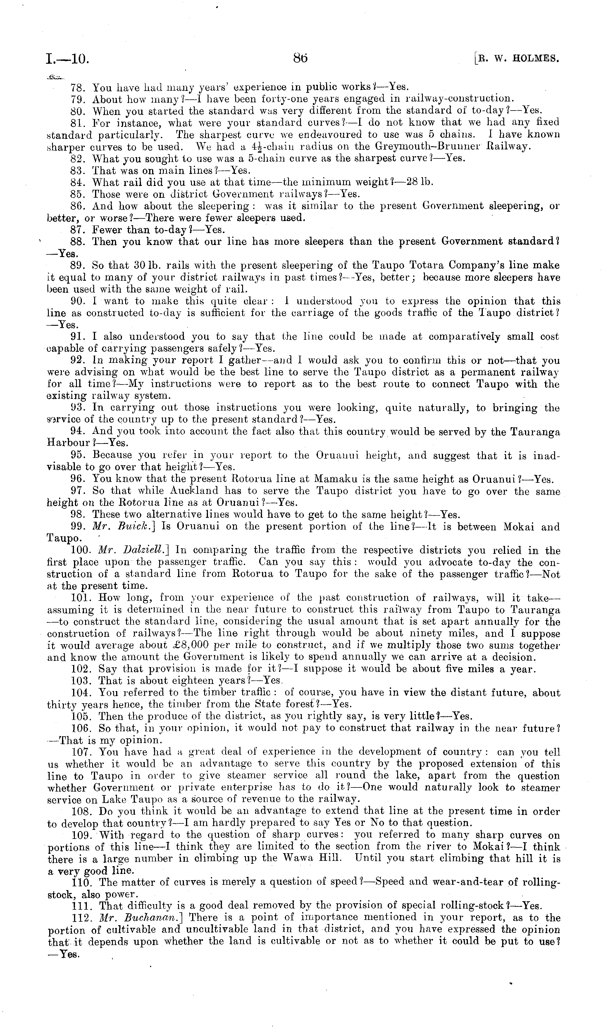 78. You have had many years' experience in public works?—Yes. 79. About hoxv many? —1 have been forty-one years engaged in railway-construction. 80. When you started the standard xvas very different from the standard of to-day? —Yes. 81. For instance, what were your standard curves? —I do not know that xx-e had any fixed standard particularly. The sharpest curve we endeavoured to use was 5 chains. I have known sharper curves to be used. We had a radius on the Greymouth-Brunner Railxvay. 82. What you sought to use xvas a 5-chain curve as the sharpest curve? —Yes. 83. That was on main lines? —Yes. 84. What rail did you use at that time—the minimum weight?—2B lb. 85. Those were on district Government railways? —Yes. 86. And how about the sleepering : was it similar to the present Government sleepering, or better, or worse ?—There were fewer sleepers used. 87. Fewer than to-day? —Yes. 88. Then you know that our line has more sleepers than the present Government standard? —Yes. 89. So that 30 lb. rails with the present sleepering of the Taupo Totara Company's line make it equal to many of your district railways in past times?—-Yes, better; because more sleepers have been used with the same weight of rail. 90. I want to make this quite clear : 1 understood you to express the opinion that this line as constructed to-day is sufficient for the carriage of the goods traffic of the T aupo district ? —Yes. 91. I also understood you to say that the line could be made at comparatively small cost capable of carrying passengers safely? —Yes. 92. In making your report I gather—and 1 would ask you to confirm this or not —that you were advising on what xvould be the best line to serve the Taupo district as a permanent railway for all time? —My instructions xvere to report as to the best route to connect Taupo with the existing railway system. 93. In carrying out those instructions you xvere looking, quite naturally, to bringing the service of the country up to the present standard? —Yes. 94. And you took into account the fact also that this country would be served by the Tauranga Harbour ?—Yes. 95. Because you refer in your report to the Oruanui height, and suggest that it is inadvisable to go over that height ? —Yes. 96. You know that the present Rotorua line at Mamaku is the same height as Oruanui?—Yes. 97. So that while Auckland has to serve the Taupo district you have to go over the same height on the Rotorua line as at Oruanui ?—Yes. 98. These two alternative lines would have to get to the same height? —Yes. 99. Mr. Buick.] Is Oruanui on the present portion of the line? —It is betxveen Mokai and Taupo. 100. Mr. Dalziell.] In comparing the traffic from the respective districts you relied in the first place upon the passenger traffic. Can you say this : would you advocate to-day the construction of a standard line from Rotorua to Taupo for the sake of the passenger traffic ?—Not at the present time. 101. Hoxv long, from your experience of the past construction of railways, will it take — assuming it is determined in the near future to construct this railxvay from Taupo to Tauranga —to construct the standard line, considering the usual amount that is set apart annually for the construction of railways?—The line right through would be about ninety miles, and I suppose it xvould average about £8,000 per mile to construct, and if we multiply those two sums together and know the amount the Government is likely to spend annually we can arrive at a decision. 102. Say that provision is made for it?—l suppose it would be about five miles a year. 103. That is about eighteen years?—Yes 104. You referred to the timber traffic : of course, you have in view the distant future, about thirty years hence, the timber from the State forest? —Yes. 105. Then the produce of the district, as you rightly say, is very little?—Yes. 106. So that, in your opinion, it would not pay to construct that railxvay in the near future? —That is my opinion. 107. You have had a great deal of experience in the development of country : can you tell us whether it xvould be an advantage to seiwe this country by the proposed extension of this line to Taupo in order to give steamer service all round the lake, apart from the question whether Government or private enterprise has to do it? —One would naturally look to steamer service on Lake Taupo as a source of revenue to the railway. 108. Do you think it xvould be an advantage to extend that line at the present time in order to develop that country?—l am hardly prepared to say Yes or No to that question. 109. With regard to the question of sharp curves: you referred to many sharp curves on portions of this line —I think they are limited to the section from the river to Mokai?—l think there is a large number in climbing up the Waxva Hill. Until you. start climbing that hill it is a very good line. 110. The matter of curves is merely a question of speed?—Speed and xvear-and-tear of rollingstock, also poxx^er. 111. That difficulty is a good deal removed by the provision of special rolling-stock?—Yes. 112. Mr. Buchanan.] There is a point of importance mentioned in your report, as to the portion of cultivable and uncultivable land in that district, and you have expressed the opinion that it depends upon whether the land is cultivable or not as to whether it could be put to use? —Yes.