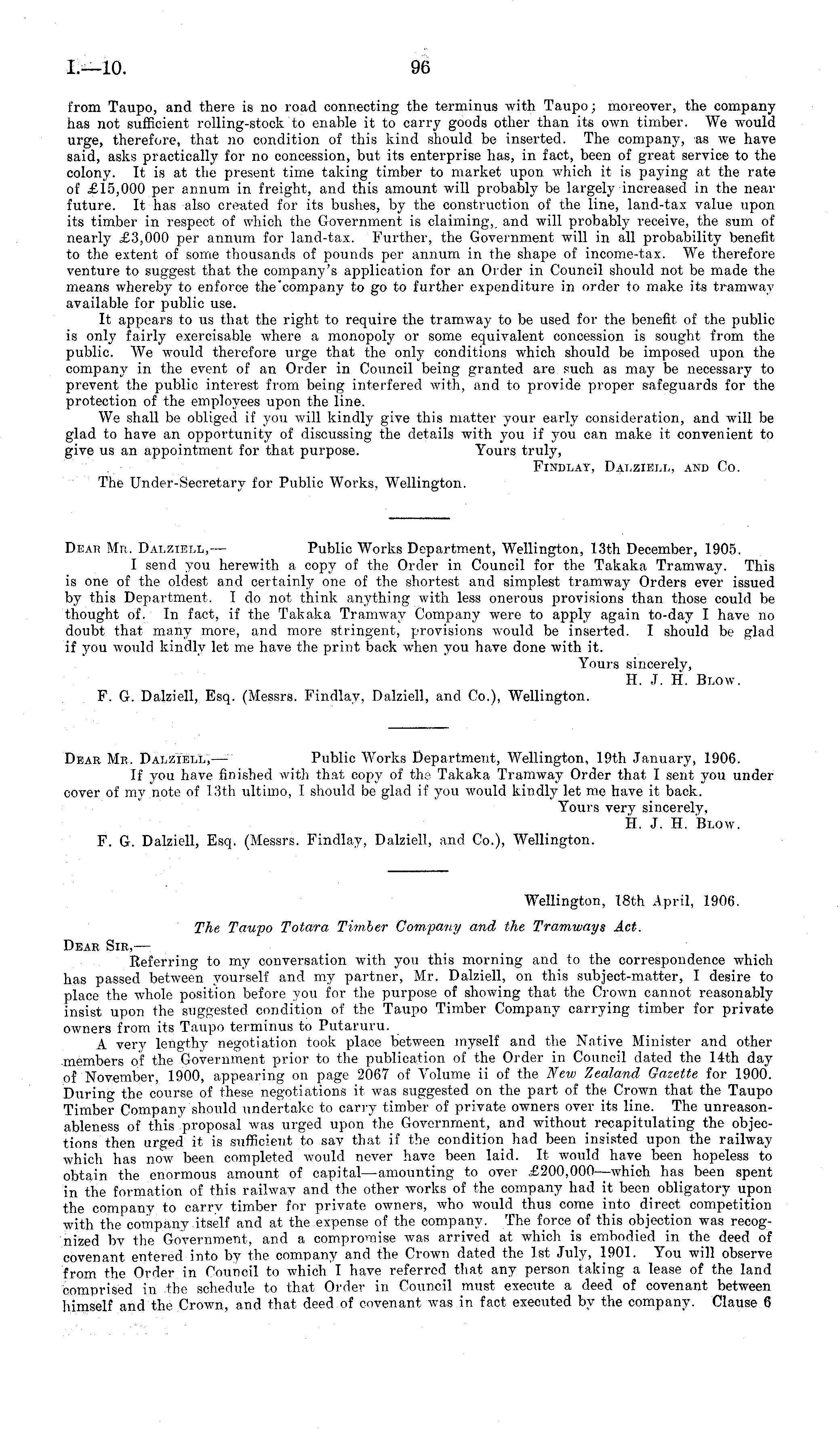 Dear Mr. Dalziell, — Public Works Department, Wellington, 13th December, 1905. I send you herexvith a copy of the Order in Council for the Takaka Tramway. This is one of the oldest and certainly one of the shortest and simplest tramway Orders ever issued by this Department. I do not think anything xvith less onerous provisions than those could be thought of. In fact, if the Takaka Tramxvay Company were to apply again to-day I have no doubt that many more, and more stringent, provisions xvould be inserted. I should be glad if you xx'ould kindly let me have the print back when you have done with it. Yours sincerely, H. J. H. Blow. F. G. Dalziell, Esq. (Messrs. Findlay, Dalziell, and Co.), Wellington.