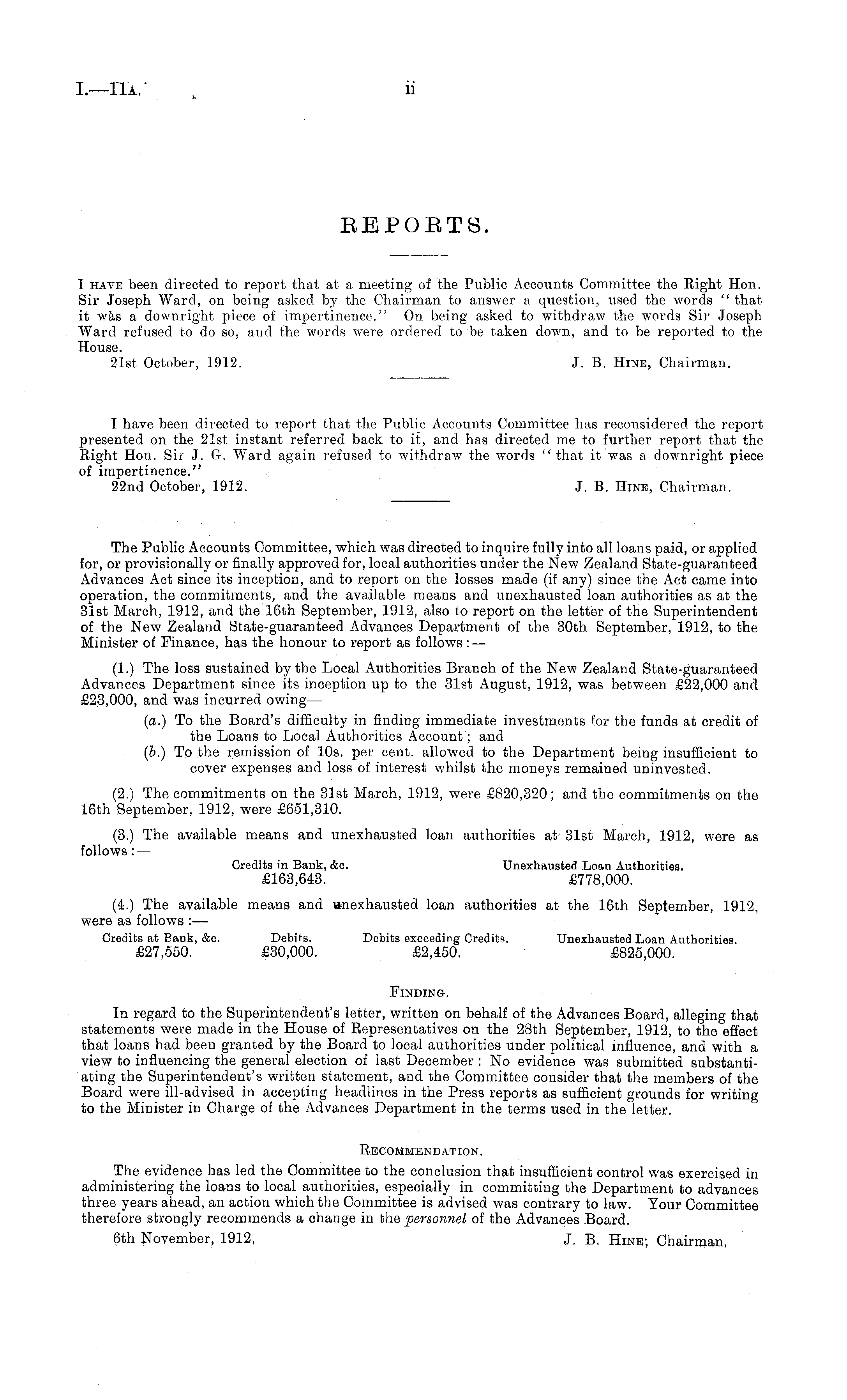 I have been directed to report that at a meeting of the Public Accounts Committee the Right Hon. Sir Joseph Ward, on being asked by the Chairman to answer a question, used the words " that it was a downright piece of impertinence.''' On being asked to withdraw the words Sir Joseph Ward refused to do so, and the words were ordered to be taken down, and to be reported to the House. 21st October, 1912. J. B. Hine, Chairman. I have been directed to report that the Public Accounts Committee has reconsidered the report presented on the 21st instant referred back to it, and has directed me to further report that the Right Hon. Sir J. G. Ward again refused to withdraw the words "that it was a downright piece of impertinence." 22nd October, 1912. J. B. Hine, Chairman. The Public Accounts Committee, which was directed to inquire fully into all loans paid, or applied for, or provisionally or finally approved for, local authorities under the New Zealand State-guaranteed Advances Act since its inception, and to report on the losses made (if any) since the Act came into operation, the commitments, and the available means and unexhausted loan authorities as at the 31st March, 1912, and the 16th September, 1912, also to report on the letter of the Superintendent of the New Zealand State-guaranteed Advances Department of the 30th September, 1912, to the Minister of Finance, has the honour to report as follows :— (1.) The loss sustained by the Local Authorities Branch of the New Zealand State-guaranteed Advances Department since its inception up to the 31st August, 1912, was between £22,000 and £23,000, and was incurred owing— (a.) To the Board's difficulty in finding immediate investments for the funds at credit of the Loans to Local Authorities Account; and (6.) To the remission of 10s. per cent, allowed to the Department being insufficient to cover expenses and loss of interest whilst the moneys remained uninvested. (2.) The commitments on the 31st March, 1912, were £820,320; and the commitments on the 16th September, 1912, were £651,310. (3.) The available means and unexhausted loan authorities at- 31st March, 1912, were as follows : — Credits in Bank, &o. Unexhausted Loan Authorities. £163,643. £778,000. (4.) The available means and wiexhausted loan authorities at the 16th September, 1912, were as follows :— Credits at Bank, &o. Debits. Debits exceeding Credits. Unexhausted Loan Authorities. £27,550. £30,000. £2,450. £825,000. Finding. In regard to the Superintendent's letter, written on behalf of the Advances Board, alleging that statements were made in the House of Representatives on the 28th September, 1912, to the effect that loans had been granted by the Board to local authorities under political influence, and with a view to influencing the general election of last December : No evidence was submitted substantiating the Superintendent's written statement, and the Committee consider that the members of the Board were ill-advised in accepting headlines in the Press reports as sufficient grounds for writing to the Minister in Charge of the Advances Department in the terms used in the letter. Recommendation. The evidence has led the Committee to the conclusion that insufficient control was exercised in administering the loans to local authorities, especially in committing the Department to advances three years ahead, an action which the Committee is advised was contrary to law. Tour Committee therefore strongly recommends a change in the personnel of the Advances Board. 6th November, 1912, J. B. Hine; Chairman,