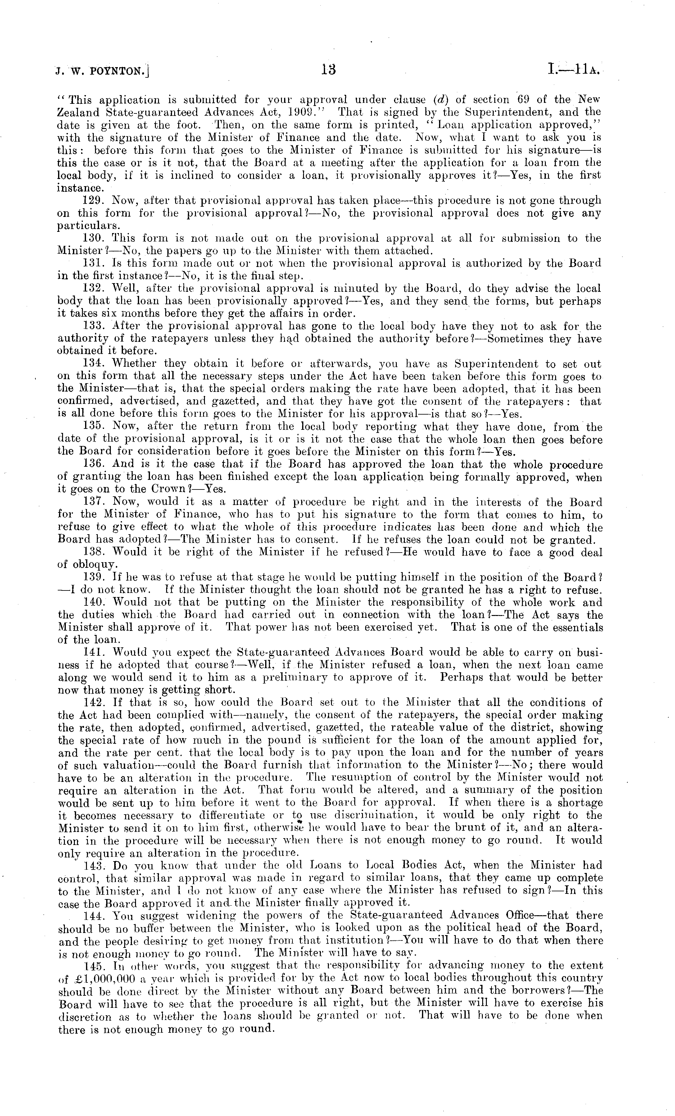" This application is submitted for your approval under clause (d) of section 69 of the NewZealand State-guaranteed Advances Act, 1909." That is signed by the Superintendent, and the date is given at the foot. Then, on the same form is printed, " Loan application approved," with the signature of the Minister of Finance and the date. Now, what I want to ask you is this : before this form that goes to the Minister of Finance is submitted for his signature—is this the case or is it not, that the Board at a meeting after the application foi- a loan from the local body, if it is inclined to consider a loan, it provisionally approves it?— Yes, in the first instance. 129. Now, after that provisional approval has taken place—this procedure is not gone through on this form for the provisional approval ?—No, the provisional approval does not give any particulars. 130. This form is not made out on the provisional approval at all for submission to the Minister? —No, the papers go up to the Minister with them attached. 131. Is this form made out or not when the provisional approval is authorized by the Board in the first instance?—No, it is the final step. 132. Well, after the provisional approval is miiiuted by the Board, do they advise the local body that the loan has been provisionally approved ? —Yes, and they send the forms, but perhaps it takes six months before they get the affairs in order. 133. After the provisional approval has gone to the local body have they not to ask for the authority of the ratepayers unless they had obtained the authority before?— Sometimes they have obtained it before. 134. Whether they obtain it before or afterwards, you have as Superintendent to set out on this form that all the necessary steps under the Act have been taken before this form goes to the Minister —that is, that the special orders making the rate have been adopted, that it has been confirmed, advertised, and gazetted, and that they have got the consent of the ratepayers : that is all done before this form goes to the Minister for his approval—is that so?— Yes. 135. Now, after the return from the local body reporting what they have done, from the date of the provisional approval, is it or is it not the case that the whole loan then goes before the Board for consideration before it goes before the Minister on this form? —Yes. 136. And is it the case that if the Board has approved the loan that the whole procedure of granting the loan has been finished except the loan application being formally approved, when it goes on to the Crown ?—Yes. 137. Now, would it as a matter of procedure be right and in the interests of the Board for the Minister of Finance, who has to put his signature to the form that comes to him, to refuse to give effect to what the whole of this procedure indicates has been done and which the Board has adopted?— The Minister has to consent. If he refuses the loan could not be granted. 138. Would it be right of the Minister if he refused? —He would have to face a good deal of obloquy. 139. If he was to refuse at that stage he would be putting himself m the position of the Board? —1 do not know. If the Minister thought the loan should not be granted he has a right to refuse. 140. Would not that be putting on the Minister the responsibility of the whole work and the duties which the Board had carried out in connection with the loan? —The Act says the Minister shall approve of it. That power has not been exercised yet. That is one of the essentials of the loan. 141. Would you expect the State-guaranteed Advances Board would be able to carry on business if he adopted that course?— Well, if the Minister refused a loan, when the next loan came along we would send it to him as a preliminary to approve of it. Perhaps that would be better now that money is getting short. 142. If that is so, how could the Board set out to the Minister that all the conditions of the Act had been complied with—namely, the consent of the ratepayers, the special order making the rate, then adopted, confirmed, advertised, gazetted, the rateable value of the district, showing the special rate of how much in the pound is sufficient for the loan of the amount applied for, and the rate per cent, that the local body is to pay upon the loan and for the number of years of such valuation —could the Board furnish that information to the Minister? —No; there would have to be an alteration in the procedure. The resumption of control by the Minister would not require an alteration in the Act. That form would be altered, and a summary of the position would be sent up to him before it went to the Board for approval. If when there is a shortage it becomes necessary to differentiate or to use discrimination, it would be only right to the Minister to send it on to him first, otherwise he would have to bear the brunt of it, and an alteration in the procedure will be necessary when there is not enough money to go round. It would only require an alteration in the procedure. 143. Do you know that under the old Loans to Local Bodies Act, when the Minister had control, that similar approval was made in regard to similar loans, that they came up complete to the Minister, and I do not know of any case where the Minister has refused to sign?—ln this case the Board approved it and the Minister finally approved it. 144. You suggest widening the powers of the State-guaranteed Advances Office—that there should be no buffer between the Minister, who is looked upon as the political head of the Board, and the people desiring to get money from that institution? —You will have to do that when there is not enough money to go round. The Minister will have to say. 145. In other words, you suggest that the responsibility for advancing money to the extent of £1,000,000 a year which is provided foi- by the Act now to local bodies throughout this country should lie done direct by the Minister without any Board be