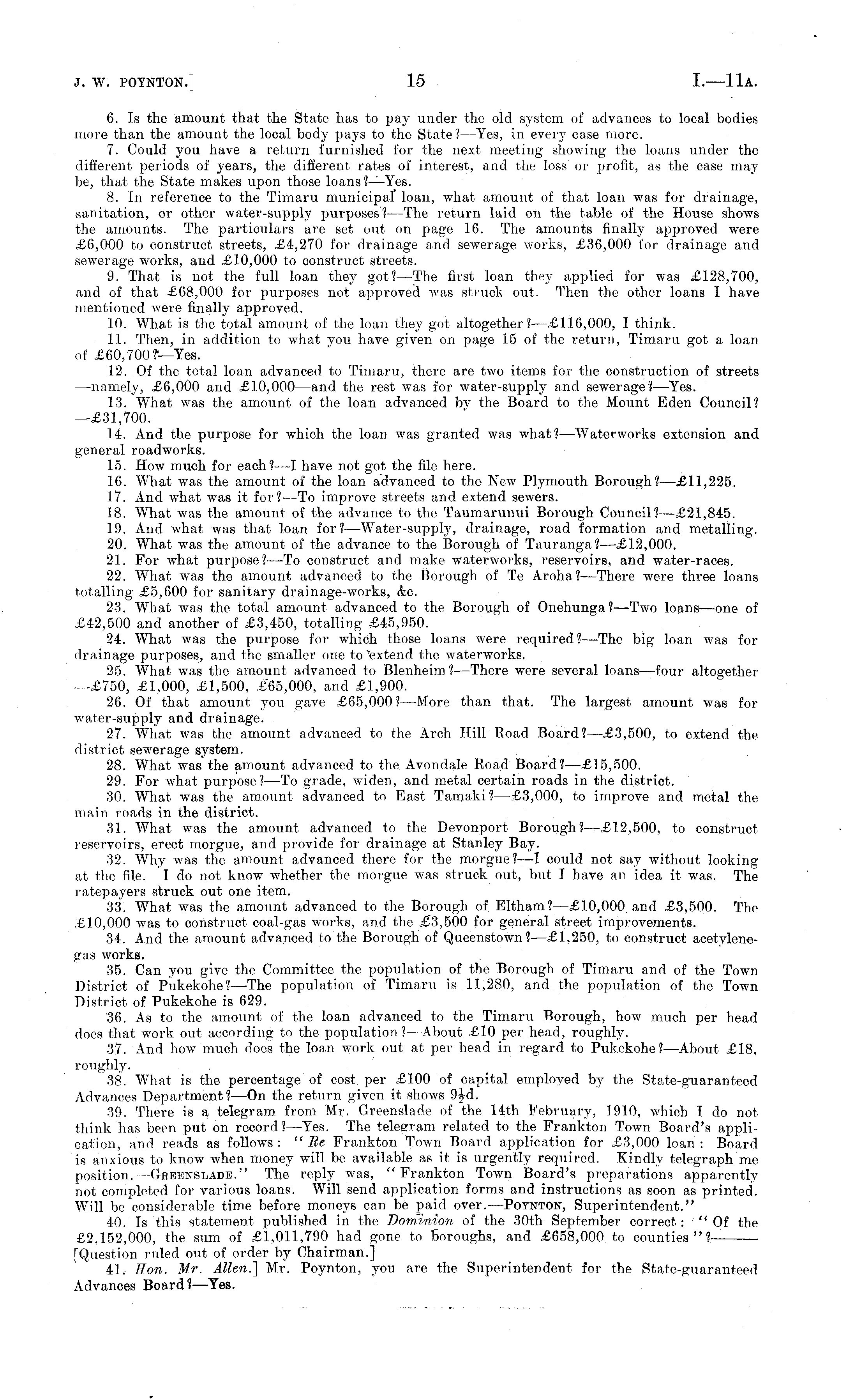 6. Is the amount that the State has to pay under the old system of advances to local bodies more than the amount the local body pays to the State ?—Yes, in every case more. 7. Could you have a return furnished for the next meeting showing the loans under the different periods of years, the different rates of interest, and the loss or profit, as the case may be, that the State makes upon those loans ?—Yes. 8. In reference to the Timaru municipal' loan, what amount of that loan was for drainage, sanitation, or other water-supply purposes? —The return laid on the table of the House shows the amounts. The particulars are set out on page 16. The amounts finally approved were £6,000 to construct streets, £4,270 for drainage and sewerage works, £36,000 for drainage and sewerage works, and £10,000 to construct streets. 9. That is not the full loan they got?— The first loan they applied for was £128,700, and of that £68,000 for purposes not approved was struck out. Then the other loans I have mentioned were finally approved. 10. What is the total amount of the loan they got altogether?—£ll6,ooo, I think. 11. Then, in addition to what you have given on page 15 of the return, Timaru got a loan of £60,700?-—Yes. 12. Of the total loan advanced to Timaru, there are two items for the construction of streets —namely, £6,000 and £10,000 —and the rest was for water-supply and sewerage?— Yes. 13. What was the amount of the loan advanced by the Board to the Mount Eden Council? —£31,700. 14. And the purpose for which the loan was granted was what? —Waterworks extension and general roadworks. 15. How much for each?—l have not got the file here. 16. What was the amount of the loan advanced to the New Plymouth Borough?—£ll,22s. 17. And what was it for? —To improve streets and extend sewers. 18. What was the amount of the advance to the Taumarunui Borough Council?—£2l,B4s. 19. And what was that loan for? —Water-supply, drainage, road formation and metalling. 20. What was the amount of the advance to the Borough of Tauranga?—£l2,ooo. 21. For what purpose? —To construct and make waterworks, reservoirs, and water-races. 22. What was the amount advanced to the Borough of Te Aroha?—There were three loans totalling £5,600 for sanitary drainage-works, &c. 23. What was the total amount advanced to the Borough of Onehunga?—Two loans—one of £42,500 and another of £3,450, totalling £45,950. 24. What was the purpose for which those loans were required ?—The big loan was for drainage purposes, and the smaller one to "extend the waterworks. 25. What was the amount advanced to Blenheim? —There were several loans —four altogether —£750, £1,000, £1,500, £65,000, and £1,900. 26. Of that amount you gave £65,000? —More than that. The largest amount was for water-supply and drainage. 27. What was the amount advanced to the Arch Hill Road Board? —£3,500, to extend the district sewerage system. 28. What was the amount advanced to the Avondale Road Board? —£15,500. 29. For what purpose? —To grade, widen, and metal certain roads in the district. 30. What was the amount advanced to East Tamaki? —£3,000, to improve and metal the main roads in the district. 31. What was the amount advanced to the Devonport Borough?—£l2,soo, to construct reservoirs, erect morgue, and provide for drainage at Stanley Bay. 32. Why was the amount advanced there for the morgue? —I could not say without looking at the file. Ido not know whether the morgue was struck out, but I have an idea it was. The ratepayers struck out one item. 33. What was the amount advanced to the Borough of Eltham?—£lo,ooo and £3,500. The £10,000 was to construct coal-gas works, and the £3,500 for general street improvements. 34. And the amount advanced to the Borough of Queenstown? —£1,250, to construct acetvlenegas works. 35. Can you give the Committee the population of the Borough of Timaru and of the Town District of Pukekohe? —The population of Timaru is 11,280, and the population of the Town District of Pukekohe is 629. 36. As to the amount of the loan advanced to the Timaru Borough, how much per head does that w r ork out according to the population?— About £10 per head, roughly. 37. And how much does the loan work out at per head in regard to Pukekohe?—About £18, roughly. 38. What is the percentage of cost per £100 of capital employed by the State-guaranteed Advances Department?—On the return given it shows 9^-d. 39. There is a telegram from Mr. Greenslade of the 14th February, 1910, which I do not think has been put on record? —Yes. The telegram related to the Frankton Town Board's application, and reads as follows : " Be Frankton Town Board application for £3,000 loan : Board is anxious to know when money will be available as it is urgently required. Kindly telegraph me position. —Greenslade." The reply was, " Frankton Town Board's preparations apparently not completed for various loans. Will send application forms and instructions as soon as printed. Will be considerable time before moneys can be paid over. —Poynton, Superintendent." 40. Is this statement published in the Dominion of the 30th September correct: "Of the £2,152,000, the sum of £1,011,790 had gone to boroughs, and £658,000 to counties"? [Question ruled out of order by Chairman.] 41. Hon. Mr. Allen.] Mr. Poynton, you are the Superintendent for the State-guaranteed Advances Board? —Yes.