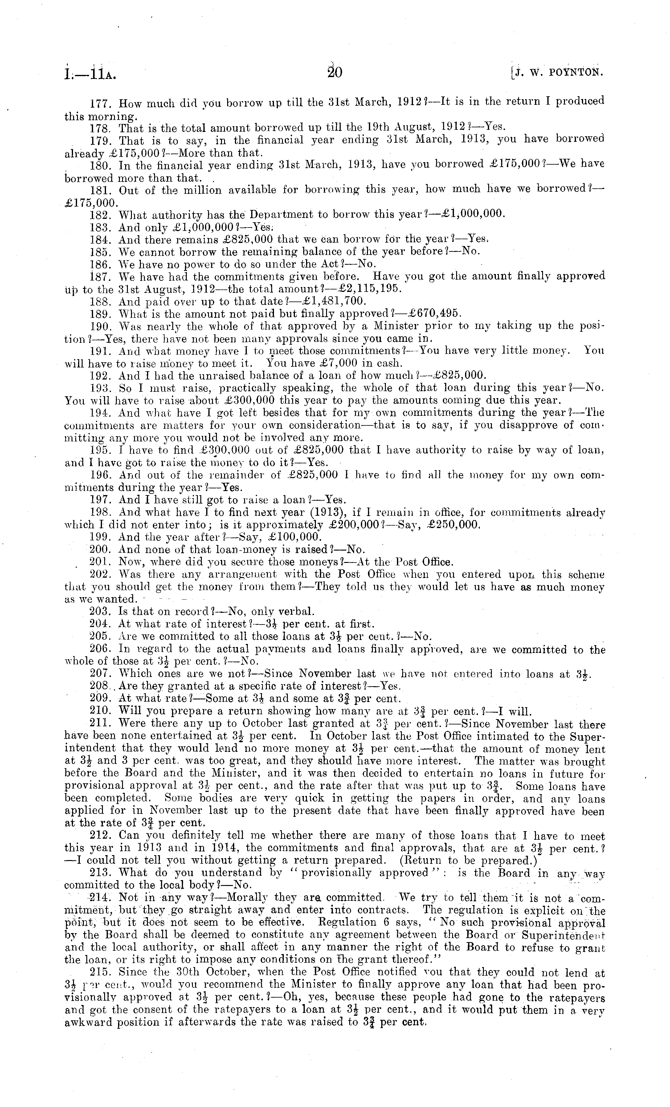 177. How much did you borrow up till the 31st March, 1912? —It is in the return I produced this morning. 178. That is the total amount borrowed up till the 19th August, 1912?— Yes. 179. That is to say, in the financial year ending 31st March, 1913, you have borrowed already £175,000?— More than that. 180. In the financial year ending 31st March, 1913, have you borrowed £175,000? —We have borrowed more than that. . 181. Out of the million available for borrowing this year, how much have we borrowed? — £175,000. 182. What authority has the Department to borrow this year? —£1,000,000. 183. And only £1,000,000?— Yes; 184. And there remains £825,000 that we can borrow for the year? —Yes. 185. We cannot borrow the remaining balance of the year before? —No. 186. We have no power to do so under the Act?— No. 187. We have had the commitments given before. Have you got the amount finally approved up to the 31st August, 1912—the total amount?—£2,lls,l9s.' 188. And paid over up to that date?—£l,4Bl,7oo. 189. What is the amount not paid but finally approved? —£670,495. 190. Was nearly the whole of that approved by a Minister prior to my taking up the position? —Yes, there have not been many approvals since you came in. 191. And what money have Ito meet those commitments ?—- You have very little money. You will have to raise money to meet it. You have £7,000 in cash. 192. And I had the unraised balance of a loan of how much? —£825,000. 193. So I must raise, practically speaking, the whole of that loan during this year? —No. You will have to raise about £300,000 this year to pay the amounts coining due this year. 194. And what have I got left besides that for my own commitments during the year?— The commitments are matters for your own consideration —that is to say, if you disapprove of committing any more you would not be involved any more. 195. I have to find £300,000 out of £825,000 that I have authority to raise by way of loan, and I have got to raise the money to do it?— Yes. 196. And out of the remainder of £825,000 1 have to find all the money for my own commitments during the year?— Yes. 197. And I have still got to raise a loan?— Yes. 198. And what have I to find next year (1913), if I remain in office, for commitments already which I did not enter into; is it approximately £200,000?—Sav, £250,000. 199. And the year after?— Say, £100,000. 200. And none of that loan-money is raised? —No. 201. Now, where did you secure those moneys?—At the Post Office. 202. Was there any arrangement with the Post Office when you entered upon this scheme thai you should get the money from them?— They told us they would let us have as much money as we wanted. 203. Is that on record? —No, only verbal. 204. At what rate of interest? — per cent, at first. 205. Are we committed to all those loans at 3- 1 - per cent. ?—No. 206. In regard to the actual payments and loans finally approved, are we committed to the whole of those at 3 \ per cent. ?—No. 207. Which ones are we not?— Since November last we have not entered into loans at ?>\. 208.. Are they granted at a specific rate of interest? —Yes. 209. At what rate? —Some at 3J- and some at 3f per cent. 210. Will you prepare a return showing how many are at 3| per cent.?—l will, 211. Were there any up to October last granted at 3| per cent.?— Since November last there have been none entertained at 3| per cent. In October last the Post Office intimated to the Superintendent that they would lend no more money at 3| per cent. —that the amount of money lent at 3 \ and 3 per cent, was too great, and they should have more interest. The matter was brought before the Board and the Minister, and it was then decided to entertain no loans in future for provisional approval at 3| per cent., and the rate after that was put up to 3|. Some loans have been completed. Some bodies are very quick in getting the papers in order, and any loans applied for in November last up to the present date that have been finally approved have been at the rate of 3| per cent. 212. Can you definitely tell me whether there are many of those loans that I have to meet this year in 1913 and in 1914, the commitments and final approvals, that are at 3| per cent.? —I could not tell you without getting a return prepared. (Return to be prepared.) 213. What do you understand by "provisionally approved": is the Board in any- way committed to the local body? —No. 214. Not in any way?— Morally they are committed. We try to tell them it is not a'commitment, but they go straight away and enter info contracts. The regulation is explicit on the point, but it does not seem to be effective. Regulation 6 says, "No such provisional approval by the Board shall be deemed.to constitute any agreement between the Board or Superintendent and the local authority, or shall affect in any manner the right of the Board to refuse to grani the loan, or its right to impose any conditions on The grant thereof." 215. Since the 30th October, when the Post Office notified you that they could not lend at 3| per cent., would you recommend the Minister to finally approve any loan that had been provisionally approved at 3J per cent.? —Oh, yes, because these people had gone to the ratepayers and got the consent of the ratepayers to a loan at 3J per cent., and it would put them in a very awkward position if afterwards the rate was raised to 3f per cent.