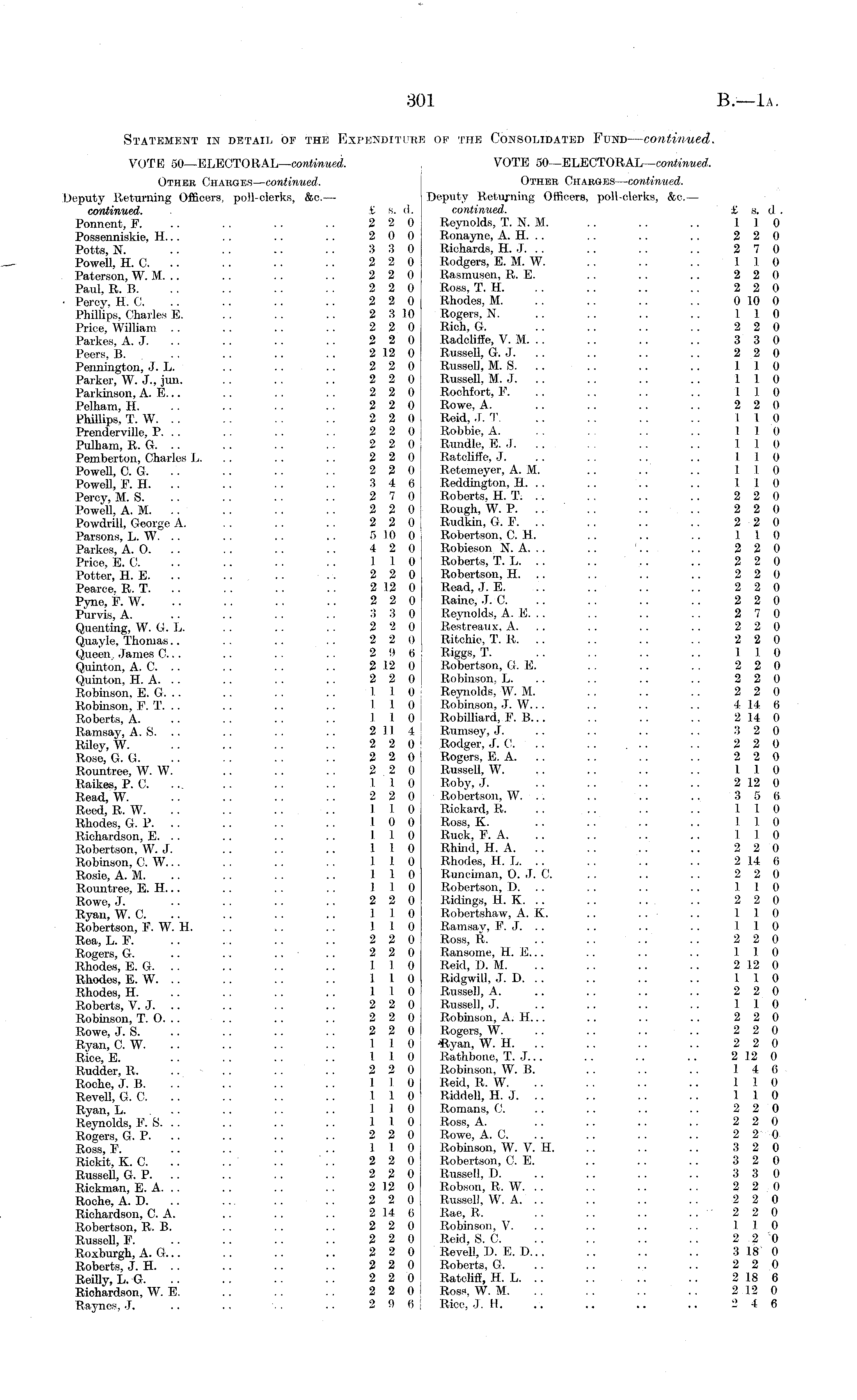 Statement in detail of the Expenditure of the Consolidated Fund— continued. VOTE 50— ELECTORAL— continued. , VOTE 50—ELECTORAL— continued. Othjsr Chakges— continued. Other Charges— continued. Deputy Returning Officers, poll-clerks, &c. — | Deputy Returning Officers, poll-clerks, &c.— continued. £ s. d. continued. £ s. d . Ponncnt, F. . . .. .. .. 2 2 0 Reynolds, T. N. M. .. .. .. 110 Possenniskie, H... . . .. .. 2 0 0 Ronayne, A. H. .. .. .. . . 2 2 0 Potts, N. .. .. .. .. 3 3 0 Richards, H. J. .. .. .. .. 2 7 0 Powell, H. C. .. .. .. 2 2 0 Rodgers, E. M. W. .. .. .. 110 Paterson, W. M. .. .. .. .. 2 2 0 Rasmusen, R. E. .. .. .. 2 2 0 Paul, R. B. .. .. .. . . 2 2 0 Ross, T. H. .. .. .. .. 2 2 0 ■ Percy, H. C. .. .. .. .. 2 2 0 Rhodes, M. .. .. .. .. 010 0 Phillips, Charles E. .. .. .. 2 310 Rogers, N. .. .. .. .. 110 Price, William .. .. .. .. 2 2 0 Rich, G. .. .. .. .. 2 2 0 I'arkes, A. J. .. .. . . 2 2 0 Radcliffe, V. M. .. .. .. .. 3 3 0 Peers, B. .. .. .. .. 212 0 Russell, G. J. . . .. .. .. 2 2 0 Pennington, J. L. . . . . .. 2 2 0 Russell, M. S. .. .. .. .. 110 Parker, W. J., jun. .. .. .. 2 2 0 Russell, M. J. .. .. .. .. 110 Parkinson, A. E... .. . . .. 2 2 0 Roohfort, F. .. .. .. .. 110 Pelham, H. .. . . .. .. 2 2 0 Rowe, A. .. .. .. .. 2 2 0 Phillips, T. W. .. .. .. .. 2 2 0 Reid, .I. T. .. .. .. .. 110 Prenderville, P. . . .. . . .. 2 2 0 i Robbie, A. . . . . .. .. 110 Pulbam, R. G. .. .. .. .. 2 2 0 Rundle, E. J. . . . . .. .. 110 Pemberton, Charles L. .. .. .. 2 2 0 Ratoliffe, J. .. . . .. .. 110 Powell, C. G. .. .. .. . . 2 2 0 Retemeyer, A. M. .. .. .. 110 Powell, F. H. . . . . . . 3 4 6 Reddington, H. .. .. .. .. 110 Percy, M. S. .. .. .. . . 2 7 0 Roberts, H. T. .. . . .. .. 2 2 0 Powell, A.M. .. .. .. .. 220 Rough, W. P. .. .. .. .. 2 2 0 Powdrill, George A. .. .. . . 2 2 0 Rudkin, G. F. .. .. .. .. 2 2 0 Parsons, L. W. .. .. .. .. 5 10 0 Robertson. C. H. .. .. .. 110 Parkes, A. 0. .. . . .. .. 4 2 0 Robieson. N. A. .. .. .. .. 2 2 0 Price, E. C. .. .. .. . . 1 1 0 Roberts, T. L. .. .. .. .. 2 2 0 Potter, H. E. .. .. .. .. 2 2 0 Robertson, H. .. . . .. .. 2 2 0 Pearce. R. T. .. . . . . .. 2 12 0 Read, J. E. .. .. .. .. 2 2 0 Pyne, F. W. .. .. .. .. 2 2 0 Raine, ,T. C. .. . . .. .. 2 2 0 Purvis, A. .. .. .. .. 3 3 0 Reynolds, A. E. .. .. .. .. 2 7 0 Quenting, W. G. L. .. .. .. 2 2 0 Restreaux, A. .. .. .. .. 2 2 0 Quayle, Thomas.. .. .. .. 2 2 0 Ritchie, T. R. .. .. .. .. 2 2 0 Queen, James C... .. .. .. 2 9 6 Riggs, T. .. .. .. .. 110 Quinton, A. C. .. . . .. .. 212 0 Robertson, G. E. . . .. .. 2 2 0 Quinton, H. A. .. .. . . .. 2 2 0 Robinson, L. .. .. .. .. 2 2 0 Robinson, E. G. .. .. . . .. 110 Reynolds, W. M. . . .. .. 2 2 0 Robinson, F. T. .. . . .. .. 1 1 0 Robinson, J. W... . . .. .. i 14 6 Roberts, A. .. .. .. .. 110 Robilliard, F. 8... .. .. .. 214 0 Ramsay, A. S. .. .. .. .. 2I 1 4 Rumsey, J. .. .. .. .. 3 2 0 Riley, W. .. .. .. .. 2 2 0! Rodger, J. C. .. .. ... .. 220 Rose, G. G. .. .. .. .. 2 2 0 I Rogers, E. A. .. .. .. .. 2 2 0 Rountree, W. W. .. .. .. 2 2 0 Russell, W. .. .. .. .. 110 Raikes, P. C. .. . . .. 110 Roby, J. .. .. .. .. 212 0 Read, W. .. . . .. .. 2 2 0 Robertson, W. .. . . .. .. 3 5 6 Reed, R. W. .. .. . . .. 110 Rickard, R. .. .. . . .. 110 Rhodes, G. P. . . .. .. .. 10 0 Ross, K. .. .. .. .. 110 Richardson, E. .. .. .. .. 110 Ruck, F. A. .. .. .. .. 110 Robertson, W. J. .. .. .. 110 Rhind, H. A. . . . . .. .. 2 2 0 Robinson, C. W... .. . . .. 110 Rhodes, H. L. .. .. . . .. 214 6 Rosie, A. M. .. .. .. .. 110 Runciman, O. J. C. . . .. . . 2 2 0 Rountree, E. H... .. .. .. 110 Robertson, D. .. . . .. .. 110 Rowe, J. .. . . .. .. 2 2 0 Ridings, H. K. .. .. 2 2 0 Ryan, W. C. .. .. . . .. 110 Robertshaw, A. K. .. .. .. 110 Robertson, F. W. H. . . ~ .. 110 Ramsay, F. J. . . . . .. .. 110 Rea, L. E. .. . . .. .. 2 2 0 Ross, R. .. .. .. .. 2 2 0 Rogers, G. .. . . .. .. 2 2 0 Ransome, U. E... .. .. .. 110 Rhodes, E. G. .. .. .. .. 110 Reid, D. M. .. .. .. . . 2 12 0 Rhodes, E. W. .. .. .. .. 110 Ridgwill, ,T. D. .. .. .. .. 110 Rhodes, H. .. .. .. .. 110 Russell, A. .. .. .. .. 2 2 0 Roberts, V. J. .. .. . . .. 2 2 0 Russell, J. .. .. .. .. 110 Robinson, T. O. .. .. . . .. 2 2 0 Robinson, A. H... . . .. .. 2 2 0 Rowe, J. S. .. .. . . .. 2 2 0 Rogers, W. .. .. .. .. 2 2 0 Ryan, C. W. .. . . .. .. 110 *tyan, W. H. .. . . .. 2 2 0 Rice, E. .. . . .. .. 110 Rathbone, T. J. .. . . .. .. 2 12 0 Rudder, R. .. .. .. .. 2 2 0 Robinson, W. B. .. .. . . 14 0 Roche, J. B. .. .. .. .. 110 Reid, R. W. .. .. .. .. 110 Revell, G. C. .. .. .. .. 110 Riddell, H. J. .. .. .. .. 110 Ryan, L. .. .. . . .. 110 Romans, C. .. .. .. .. 2 2 0 Reynolds, F.S. .. .. .. .. 110 Ross, A. .. .. .. .. 2 2 0 Rogers, G. P. .. .. . . .. 2 2 0 Rowe, A. C. .. .. . . .. 2 2 0 Ross, P. .. .. . . .. 110 Robinson, W. V. H. .. .. .. 3 2 0 Rickit, K. C. .. .. .. ' . . 2 2 0 Robertson, C. E. .. .. . . ,'J 2 0 Russell, G. P. .. . . .. .. 2 2 0 Russell, I). .. .. .. .. 3 3 0 Rickman, E. A. .. .. .. .. 2 12 0 Robson, R. W. .. .. .. .. 2 2 0 Roche, A. D. .. .. 2 2 0 Russell, W. A. .. .. .. .. 2 2 0 Richardson, C. A. .. .. . . 214 6 Rae, R. . . .. .. ..220 Robertson, R. B. .. . . .. 2 2 0 Robinson, V. .. .. .. . . 110 Russell, F. .. .. .. .. 2 2 0 Reid, S. C .. .. 2.2 "0 Roxburgh, A. G... .. .. .. 2 2 0 Revell, D. E. D... .. .. .. 318 0 Roberts, J. H. .. .. .. .. 2 2 0 Roberts, G. .. .. .. .. 2 2 0 Reilly, L. G. .. .. .. .. 2 2 0 Ratcliff, H. L. .. .. 218 6 Richardson, W. E. .. .. .. 2 2 0 Ross, W. M. .. .. .. .. 212 0 Rayncs, J. .. .. .. .. 206 Rice, .1. H. .. .. .. .. 2 4 6