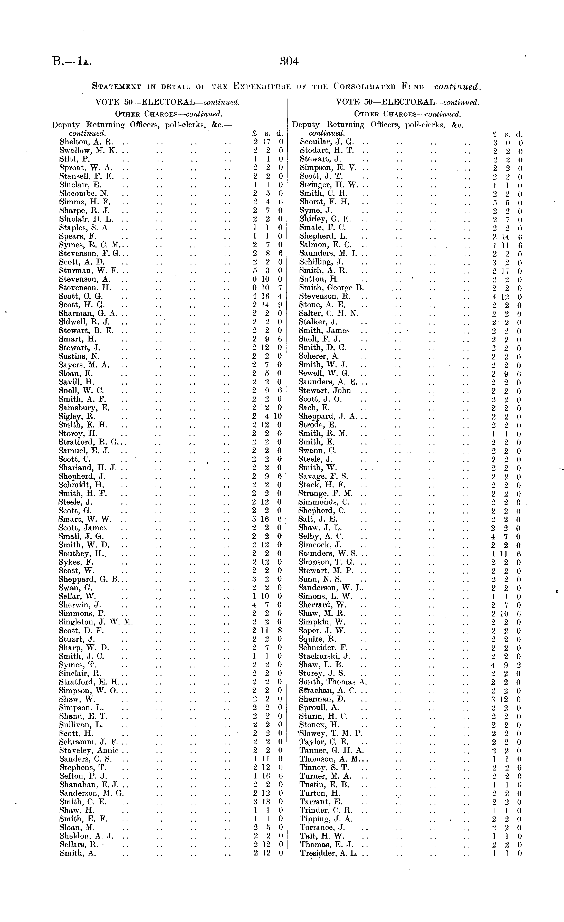 Statement in detail ok the Expknditqrb of the Consolidated Fund— continued. VOTE 50—ELECTORAL— continued. VOTE 60—ELECTORAL— continued. Other Ohargiss— continued. Other Charges— continued. Deputy Returning Officers, poll-clerks, &c. — Deputy Returning Officers, poll-clerks, <fee.— . continued. £ s. d. continued. £ s. d. Shelton, A. R. .. .. .. .. 2170 Scoullar, J. G. .. .. .. .. 3 0 0 Swallow, M. K. .. .. . . .. 2 2 0 Stodart, H. T. . . .. . . .. 2 2 0 Stitt, P. .. .. .. .. 110 Stewart, J. . . .. . . .. 2 2 0 Sproat, W. A. .. .. .. .. 2 2 0 Simpson, E. V. . . .. . . . . 2 2 0 Stansell, F. E. .. .. . . .. 2 2 0 Scott, J. T. .. .. . . .. 2 2 0 Sinclair, E. .. .. .. .. 110 Stringer, H. W. .. .. . . .. Ill) Sloconibe, N. .. .. .. .. 2 5 0 Smith, 0. H. . . . . .. .. 2 2 0 •Simms, H. F. .. . . .. .. 2 4 0 Shortt, F. H. .. .. .. r> f> 0 Sharpe, R. J. .. . . .. .. 2 7 0 Syme, J. .. .. . . .. 2 2 0 Sinclair. 1). L. .. .. .. .. 2 2 0 Shirley, G. E. .. .. .. .. 2 7 0 Staples, S. A. .. .. .. .. 110 Smale, P. C. .. . . . . . . 2 2 0 Spears, F. .. .. . . . . 110 Shepherd, L. .. .. .. . . 214 6 Symes, R. C. M... .. .. .. 2 7 0 Salmon, E. C. .. .. . . . . I I I 6 Stevenson, F. G... .. .. .. 2 8 fi Saunders, M. I. .. .. .. .. 2 2 0 Scott, A. D. .. .. . . .. 2 2 0 Schilling, J. .. .. . . . . 3 2 0 Sturman, W. P. .. . . .. . . 5 3 0 Smith, A. R. .. .. .. .. 2 17 0 Stevenson, A. .. .. . . .. 0 10 0 Sutton, H. .. .. ■ .. .. 2 2 0 Stevenson, H. .. . . .. . . 010 7 Smith, George B. .. .. .. 2 2 0 Scott, C. G. .. .. .. .. 416 4 Stevenson, R. .. .. . .. 4 12 0 Scott, H. G. .. .. .. .. 2 14 9 Stone, A. E. .. .. .. .. 2 2 0 Sharman, G. A. .. • .. .. .. 2 2 0 Salter, C. H. N. . . . . . . 2 2 0 Sidwell, R. .T. .. .. . . .. 2 2 0 Stalker, ,T. .. .. .. .. 2 2 0 Stewart, B. E. .. .. .. .. 2 2 0 Smith, James .. . . ■ .. .. 2 2 0 Smart, H. .. .. . . .. 2 9 6 Snell, P. ,T. .. .. .. .. 2 2 0 Stewart, J. .. .. .. .. 212 0 Smith, D. G. .. . . . . 2 2 0 Sustins, N. .. .. .. .. 2 2 0 Scherer, A. .. .. .. .. 2 2 0 Sayers, M. A. .. . . .. .. 2 7 0 Smith, W. J. .. . . .. 2 2 0 Sloan, E. .. .. .. .. 2 5 0 Sewell, W. G. .. .. .. .. 2 9 6 Savill, H. .. .. .. .. 2 2 0 Saunders, A. E. .. .. .. . . 2 2 0 Snell, W. C. .. .. .. .. 2 9 6 Stewart, John .. . . .. . . 2 2 0 Smith, A. F. .. .. .. .. 2 2 0 Scott, J. 0. .. .. :'. .. 2 2 0 Sainsbury, E. . . .. . . .. 2 2 0 Sach, E. .. .. . . .. 2 2 0 Sigley, R. .. .. . . .. 2 410 Sheppard, J. A. .. .. . . . . 2 2 0 Smith, E. H. .. . . .. . . 212 0 Strode, E. .. . . .. .. 2 2 0 Storey, H. .. .. .. .. 2 2 0 Smith, R. M. .. .. .. .. 110 Stratford, R. G... .. ~ .. 2 2 0 Smith, E. .. .. .. . . 2 2 0 Samuel, E. J. .. .. .. . . 2 2 0 Swarm, C. .. .. . . .. 2 2 0 Scott, C. .. . . . . .. 2 2 0 Steele, J. .. .. 2 2 0 Sharland, H. J. .. .. .. . . 2 2 0 Smith, W. . . . . 2 2 0 Shepherd, J. .. .. .. .. 2 9 6 1 Savage, P. S. .. .. . . 2 2 0 Schmidt, H. .. .. .. .. 2 2 0! Stack, H. F. .. .. .. 220 Smith, H. F. .. ... . .. 22 0 J Strange, F. M. .. .. .. . . 22 0 Steele, J. .. .. .. .. 212 0 Simmohds, C. .. . . .. .. 2 2 0 Scott, G. .. .. .. . . 2 2 0 Shepherd, C. .. .. .. .. 2 2 0 Smart, W. W. .. .. .. .. 5 16 6 Salt, J. E. .. .. .. .. 2 2 0 Scott, James .. .. .. .. 2 2 0 Shaw, J. L. .. .. .. .. 2 2 0 Small, J. G. .. .. .. . . 2 2 0 Selby, A. C. .. .. .. .. 4 7 0 Smith, W. T). .. .. .. .. 212 0 Simcock, J. .. .. .. . . 2 2 0 Southey, H.. .. .. .. .. 220 i Saunders. W. S. .. .. .. .. 111 6 Sykes, F. .. .. .. .. 212 0 I Simpson, T. G. .. .. .. .. 2 2 0 Scott, W. .. . . .. . . 2 2 0; Stewart, M. P. .. .. .. .. 220 Sheppard, G. 8... .. .. .. .3 2 0 Sunn, N. S. .. .. .. . . 2 2 0 Swan, G. .. . . .. .. 2 2 0; Sanderson, W. L. .. .. . . 220 Sellar, W. .. .. .. . . 1 10 0 Simons, L. W. .. .. . . .. 110 Sherwin, J. .. .. .. .. 4 7 0 Sherrard, W. .. . . .. .. 2 7 0 Simmons, P. .. .. .. 2 2 0 Shaw, M. R. .. .. . . . . 219 6 Singleton, J. W. M. .. .. .. 2 2 0 ! Simpkin, W. .. . . .. 2 2 0 Scott, D. P. .. .. .. . . 2 118 Soper, J. W. .. .. .. .. 2 2 0 Stuart, J. .. .. .. .. 2 2 0: Squire, R. .. .. .. . . 220 Sharp, W. D. .. .. .. .. 2 7 0: Schneider, P. . . . . .. 220 Smith, J. C. .. . . .. . . 110! Staekurski, J. .. . . .. .. 220 Symes, T. .. .. .. .. 2 2 0! Shaw, L. B. .. .. .. .. 492 Sinclair, R. .. .. . . .. 2 2 0 Storey, J. S. .. . . .. .. 2 2 0 Stratford, E. H... .. .. .. 2 2 0: Smith, Thomas. A. .. .. .. 2 2 0 Simpson, W. O. .. .. .. . . 2 2 0 Strachan, A. C. .. .. .. .. 2 2 0 Shaw, W. .. .. .. .. 2 2 0 Sherman, .D. .. .. .. .. 312 0 Simpson, L. .. .. .. .. 2 2 0 Sproull, A. .. .. . . .. 22 0 Shand, E. T. .. . . .. .. 2 2 0 i Sturm, H. 0. .. .. . . . . 2 2 0 Sullivan, L. .. .. .. . . 2 2 0! Stonex, H. .. .. . . . . 220 Scott, H. .. . . .. .. 2 2 0 "Slowey, T. M. P. . . .. .. 2 2 0 Schramm. J. P. .. .. .. .. 2 2 0 ' Taylor, C. E. .. .. .. . . 2 2 0 Staveley, Annie .. .. .. .. 220: Tanner, G. H. A. . . . . . . 2 2 0 Sanders, C. S. .. .. .. . . 1110 Thomson, A. M... .. . . . . 110 Stephens,! 1 . .. .. .. .. 212 0 Tinney, S. T. .. .. .. .. 2 2 0 Sefton, P. J. .. .. .. .. 1 Iβ 6 Turner, M. A. .. .. .. .. 2 2 0 Shanahan, E. J. .. . . . . . . 2 2 0 Tustin, E. B. .. .. . . . . Ill) Sanderson. M. G. .. .. .. 2 .12 0 Turton, H. .. .. .. .. 2 2 0 Smith, 0. E. .. .. .. .. 313 0 Tarrant, E. .. .'. .. .. 2 2 0 Shaw, H. .. . . .. . . 110 Trinder, C. R. .. . . .. .. Ill) Smith, E. F. .. .. .. .. 110! Tipping, J. A. .. .. ..... 220 Sloan, M. . . . . . . .. 2 5 0; Torrance, J. .. .. . . .. 220 Sheldon, A. J. . . .. . . . . 2 2 0 Tait, H. W. .. . . . . .. 110 Sellars, R. .. .. . . .. 2 12 0 | Thomas, E. J. .. .. .. . . 2 2 0 Smith, A. .. .. .. .. 2 12 0 Tresidder, A. L. .. .. .. .. 110