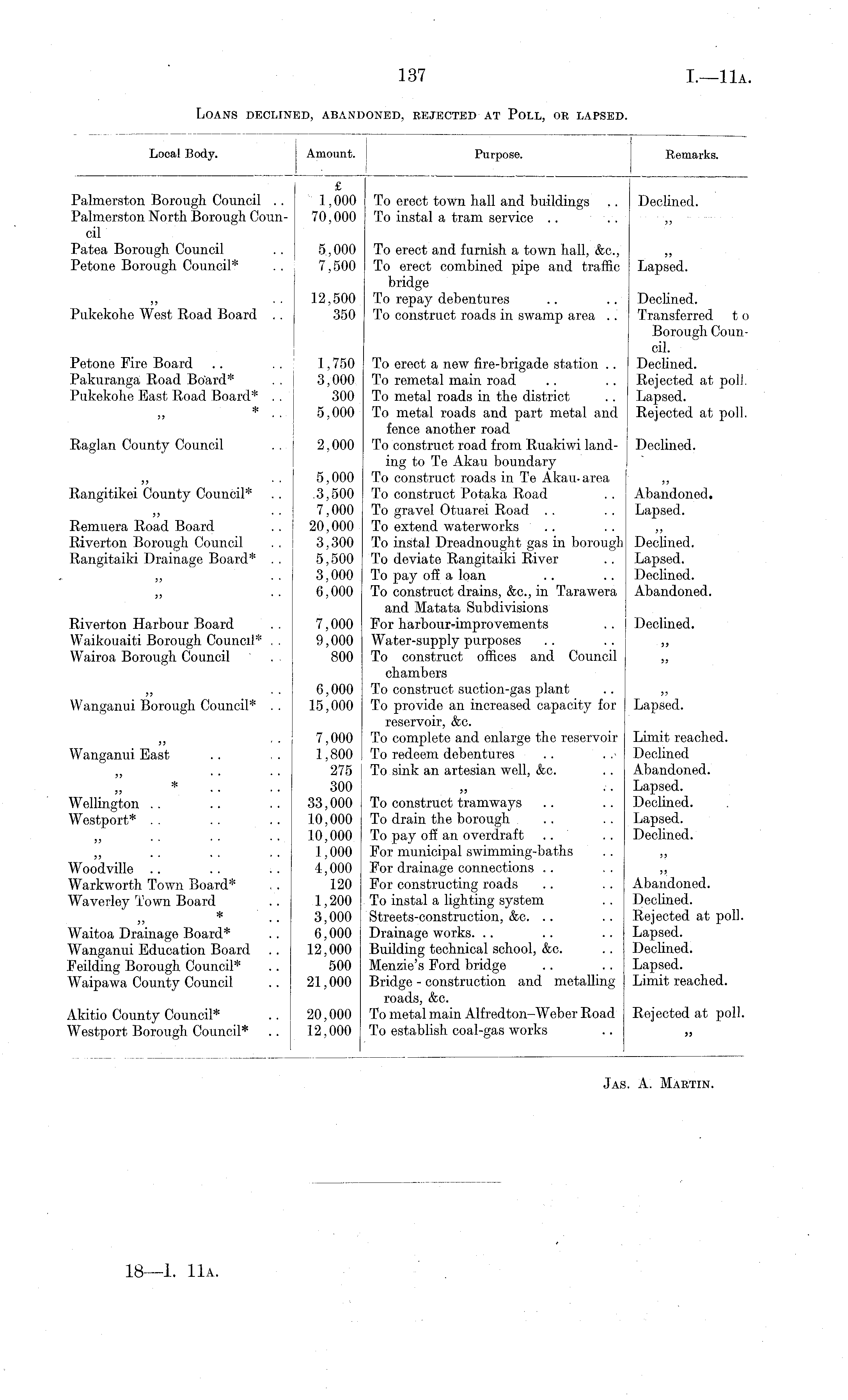 Local Body. Amount. Purpose. Remarks. Palmerston Borough Council . . Palmerston North Borough Council Patea Borough Council Petone Borough Council* £ 1,000 70,000 To erect town hall and buildings To instal a tram service Declined. 33 5,000 7,500 To erect and furnish a town hall, &c, To erect combined pipe and traffic bridge To repay debentures To construct roads in swamp area .. 33 Lapsed. 33 Pukekohe West Road Board .. Petone Fire Board Pakuranga Road Board* Pukekohe East Road Board* . . 12,500 350 1,750 3,000 300 5,000 To erect a new fire-brigade station .. To remetal main road To metal roads in the district To metal roads and part metal and fence another road To construct road from Ruakiwi landing to Te Akau boundary To construct roads in Te Akau- area To construct Potaka Road To gravel Otuarei Road To extend waterworks To instal Dreadnought gas in borough To deviate Rangitaiki River To pay off a loan To construct drains, &c, in Tarawera and Matata Subdivisions For harbour-improvements Water-supply purposes To construct offices and Council chambers To construct suction-gas plant To provide an increased capacity for reservoir, &c. To complete and enlarge the reservoir To redeem debentures To sink an artesian well, &c. Declined. Transferred t o Borough Council. Declined. Rejected at poll. Lapsed. Rejected at poll. * 33 Raglan County Council 2,000 Declined. 33 Rangitikei County Council* 33 Remuera Road Board Riverton Borough Council Rangitaiki Drainage Board* . . 5,000 .3,500 7,000 20,000 3,300 5,500 3,000 6,000 Abandoned. Lapsed. Declined. Lapsed. Declined. Abandoned. 33 • ' 33 ' - Riverton Harbour Board Waikouaiti Borough Council* . . Wairoa Borough Council . . 7,000 9,000 800 Declined. 3? 33 ' ' Wanganui Borough Council* . . 6,000 15,000 33 Lapsed. 33 Wanganui East 33 * 7,000 1,800 275 300 33,000 10,000 10,000 1,000 4,000 120 1,200 3,000 6,000 12,000 500 21,000 33 - * To construct tramways To drain the borough To pay off an overdraft For municipal swimming-baths For drainage connections For constructing roads To instal a lighting system Streets-construction, &c. Drainage works. Building technical school, &c. Menzie's Ford bridge Bridge - construction and metalling roads, &c. To metal main Alfred ton-Weber Road To establish coal-gas works Limit reached. Declined Abandoned. Lapsed. Declined. Lapsed. Declined. 33 Wellington Westport* 33 - - • • • • 33 Woodville Warkworth Town Board* Waverley Town Board * 33 33 Waitoa Drainage Board* Wanganui Education Board Feilding Borough Council* Waipawa County Council 33 Abandoned. Declined. Rejected at poll. Lapsed. Declined. Lapsed. Limit reached. Akitio County Council* Westport Borough Council* 20,000 12,000 Rejected at poll. >3 JA! ,. A. Martin.
