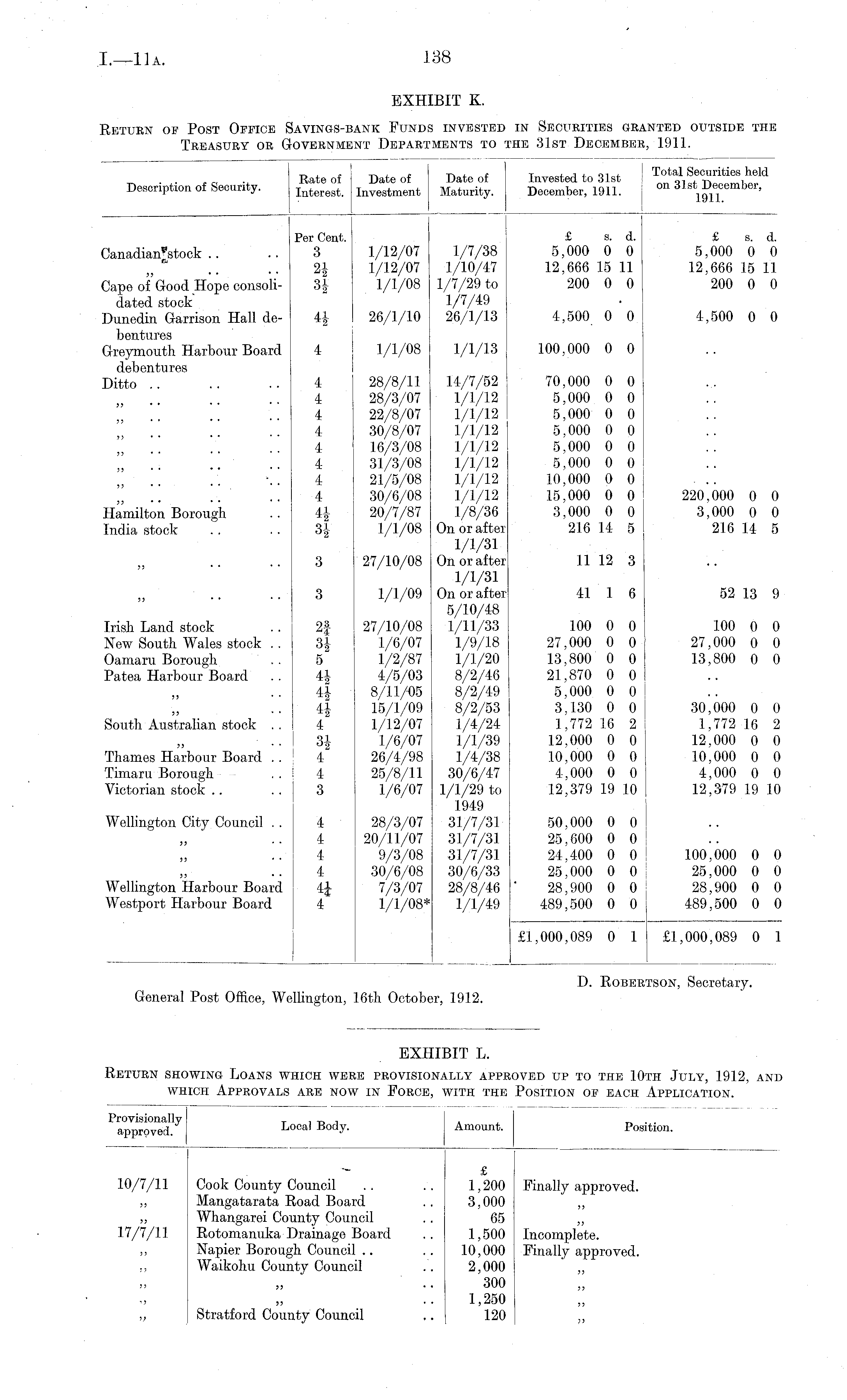 EXHIBIT K. Return of Post Office Savings-bank Funds invested in Securities granted outside the Treasury or Government Departments to the 31st December, 1911.