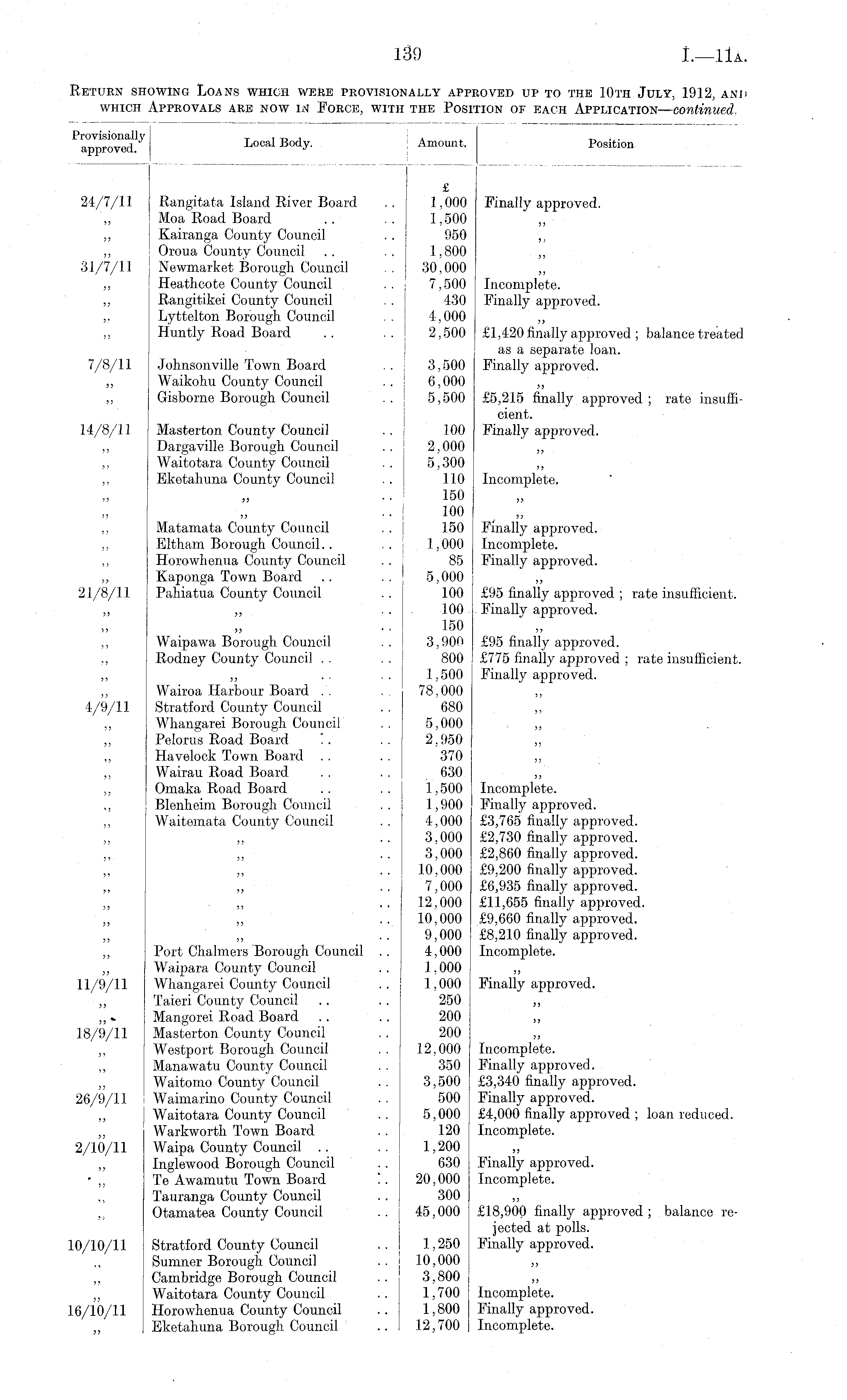 Provisionally approved. Local Body. Amount. Position 24/7/11 31/7/11 Rangitata Island River Board Moa Road Board Kairanga County Council Oroua County Council Newmarket Borough Council Heathcote County Council Rangitikei County Council Lyttelton Borough Council Huntly Road Board £ 1,000 1,500 950 1,800 30,000 7,500 430 4,000 2,500 Finally approved. 33 3 , ss 33 Incomplete. Finally approved. S' 33 £1,420 finally approved ; balance treated as a separate loan. Finally approved. 7/8/11 ss Johnsonville Town Board Waikohu. County Council Gisborne Borough Council 3,500 6,000 5,500 33 £5,215 finally approved ; rate insufficient. Finally approved. 14/8/11 Masterton County Council Dargaville Borough Council Waitotara County Council Eketahuna County Council 100 2,000 5,300 110 150 100 150 1,000 85 5,000 100 100 150 3,900 800 1,500 78,000 680 5,000 2,950 370 630 1,500 1,900 4,000 3,000 3,000 10,000 7,000 12,000 10,000 9,000 4,000 1.000 1,000 250 200 200 12,000 350 3,500 500 5,000 120 1,200 630 20,000 300 45,000 3 J 33 Incomplete. 7S 33 33 33 fllatamata County Council Eltham Borough Council.. Horowhenua County Council Kaponga Town Board Pahiatua County Council 33 Finally approved. Incomplete. Finally approved. 21/8/11 33 £95 finally approved ; rate insufficient. Finally approved. )5 •5 33 Waipawa Borough Council Rodney County Council . . 33 £95 finally approved. £775 finally approved ; rate insufficient. Finally approved. 4/9/11 ;; 33 Wairoa Harbour Board .'. Stratford County Council Whangarei Borough Council Pelorus Road Board '. . Havelock Town Board Wairau Road Board Omaka Road Board Blenheim Borough Council Waitemata County Council 33 33 33 ■>s 5) ss 33 33 Incomplete. Finally approved. £3,765 finally approved. £2,730 finally approved. £2,860 finally approved. £9,200 finally approved. £6,935 finally approved. £11,655 finally approved. £9,660 finally approved. £8,210 finally approved. Incomplete. )J ss 33 ss 33 IS 11/9/11 ss 18/9/11 26/9/11 Port Chalmers Borough Council Waipara County Council Whangarei County Council Taieri County Council Mangorei Road Board Masterton County Council Westport Borough Council Manawatu County Council Waitomo County Council Waimarino County Council Waitotara County Council Warkworth Town Board Waipa County Council .. Inglewood Borough Council Te Awamutu Town Board Tauranga County Council Otamatea County Council Finally approved. 33 33 33 Incomplete. Finally approved. £3,340 finally approved. Finally approved. £4,000 filially approved ; loan reduced. Incomplete. )) 2/10/11 33 Finally approved. Incomplete. ss 33 £18,900 finally approved ; balance rejected at polls. Finally approved. 0/10/11 Stratford County Council Sumner Borough Council Cambridge Borough Council Waitotara County Council Horowhenua County Council Eketahuna Borough Council 1,250 10,000 3,800 1,700 1,800 12,700 33 ss 33 Incomplete. Finally approved. Incomplete. 6/ib/ii