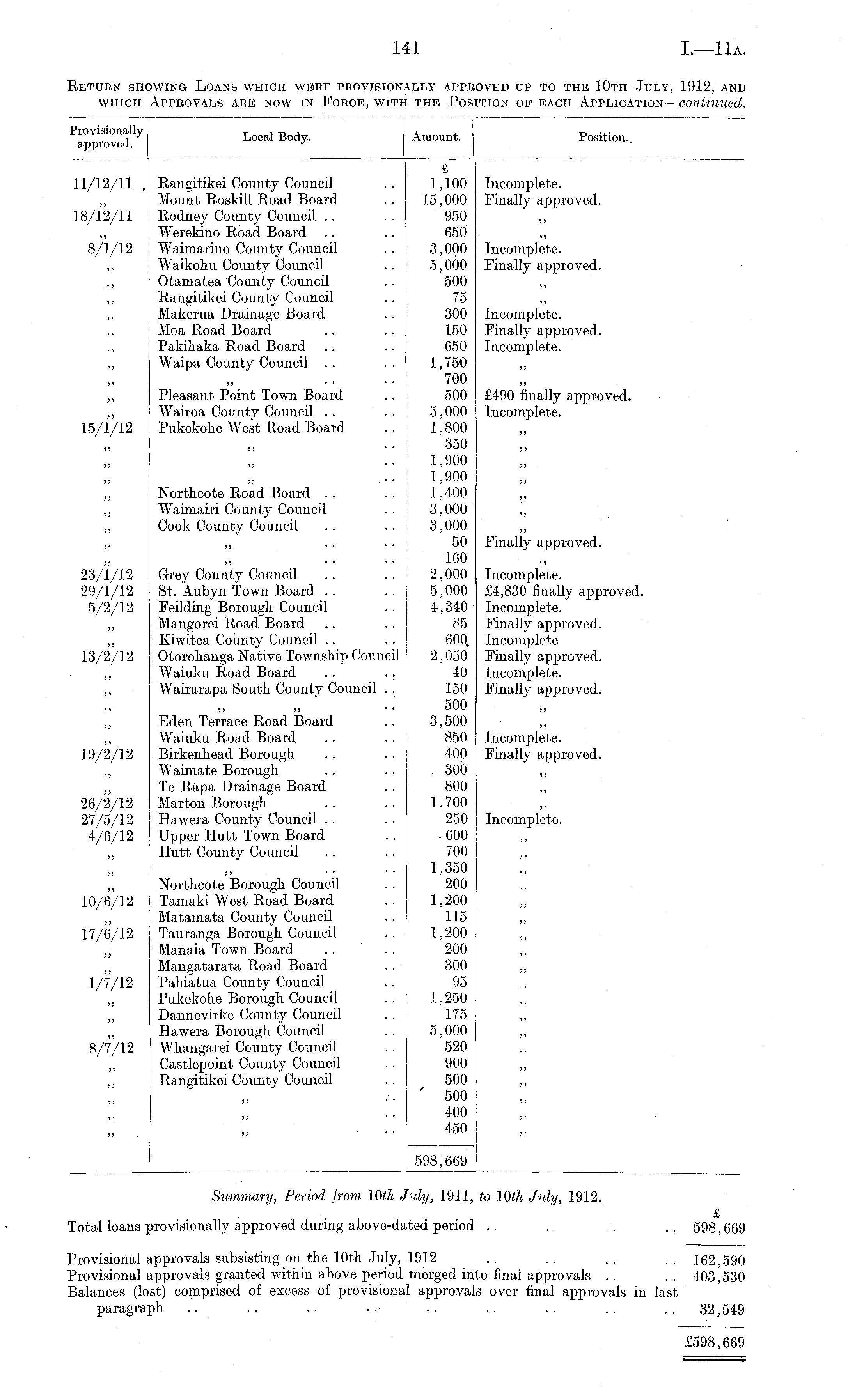 Summary, Period from 10th July, 1911, to 10th July, 1912. £ Total loans provisionally approved during above-dated period . . . . . . .. 598,669 Provisional approvals subsisting on the 10th July, 1912 .. . . . . . . 162,590 Provisional approvals granted within above period merged into final approvals .. .. 403,530 Balances (lost) comprised of excess of provisional approvals over final approvals in last paragraph .. .. .. .. .. .. .. .. .. 32,549 £598,669