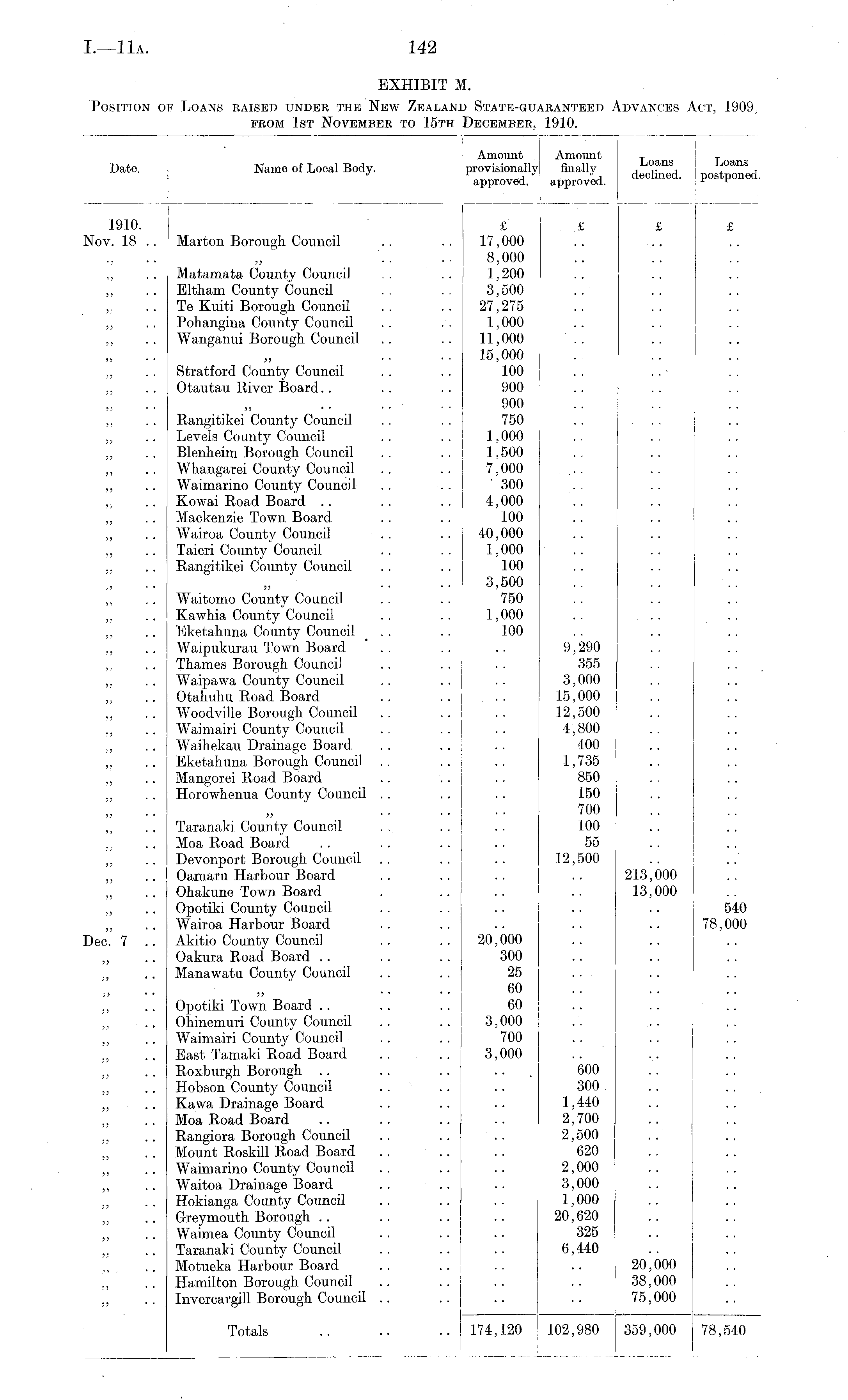 EXHIBIT M. Position of Loans raised under the New Zealand State-guaranteed Advances Act, 1909, from 1st November to 15th December, 1910.