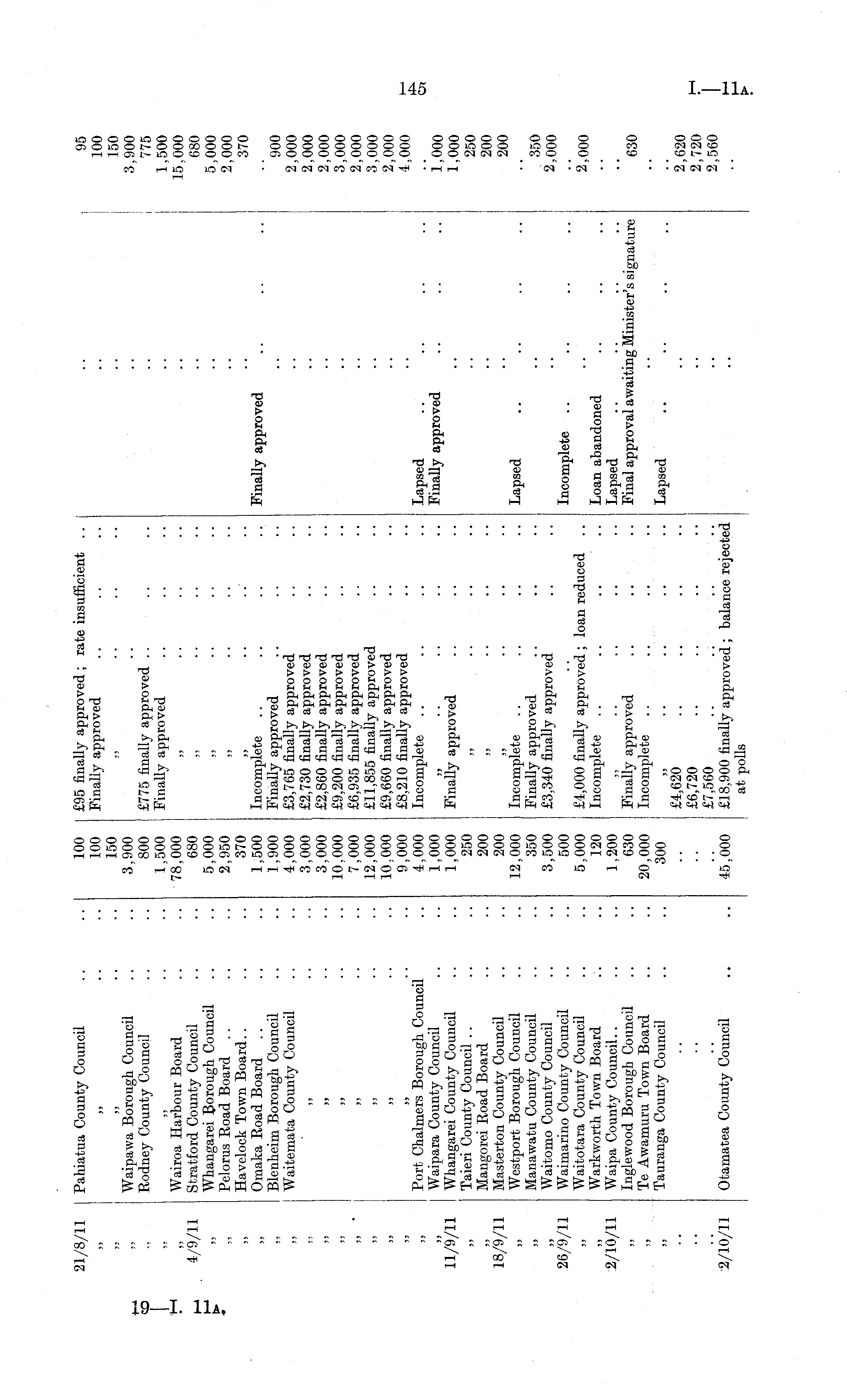 21/8/11 Pahiatua County Council 100 100 150 3,900 800 1,500 78,000 680 5,000 2,950 370 1,500 1,900 4,000 3,000 3.000 10.000 7,000 12,000 10,000 9,000 4,000 1,000 1,000 250 200 200 12,000 350 3,500 500 5,000 120 1,200 630 20,000 300 £95 finally approved ; rate insufficient .. Finally approved 95 100 150 3,900 775 1,500 15,000 680 5,000 2,000 370 33 3) 33 33 • • Waipawa Borough Council Rodney County Council ,, . . . . . . £775 finally approved Finally approved 4/9/11 35 33 Wairoa Harbour Board Stratford County Council Whangarei Borough Council Pelorus Road Board Havelock Town Board Omaka Road Board Blenheim Borough Council Waitemata County Council 33 • • * • • • 33 33 35 33 • ' 33 ■ • 33 » • • • • • Incomplete Finally approved £3,765 finally approved £2,730 finally approved £2,860 finally approved £9,200 finally approved £6,935 finally approved £11,855 finally approved £9,660 finally approved £8,210 finally approved Incomplete Finally approved 900 2,000 2,000 2,000 3,000 2,000 3,000 2,000 4,000 53 33 • • 33 33 33 33 33 * • 33 S3 11/9/11 33 18/9/11 33 H 33 • • Port Chalmers Borough Council Waipara County Council Whangarei County Council Taieri County Council Mangorei Road Board Masterton County Council Westport Borough Council Manawatu County Council Waitomo County Council Waimarino County Council Waitotara County Council Warkworth Town Board Waipa County Council Inglewood Borough Council Te Awamuru Town Board Tauranga County Council ,, . . . . . . . . Finally approved ,, . . . . . . 33 • • ■ • • • Incomplete Finally approved £3,340 finally approved Lapsed Finally approved Lapsed 1,000 1,000 250 200 200 350 2,000 26/9/11 Incomplete 33 £4,000 finally approved ; loan reduced .. Incomplete 2,000 3/10/11 33 •' . . . . • • Finally approved Incomplete Loan abandoned Lapsed Final approval awaiting Minister's signature 33 630 5J 53 £4,620 £6,720 £7,560 £18,900 finally approved ; balance rejected at polls Lapsed 2,620 2,720 2,560 2/10/11 Otamatea County Council 45,000