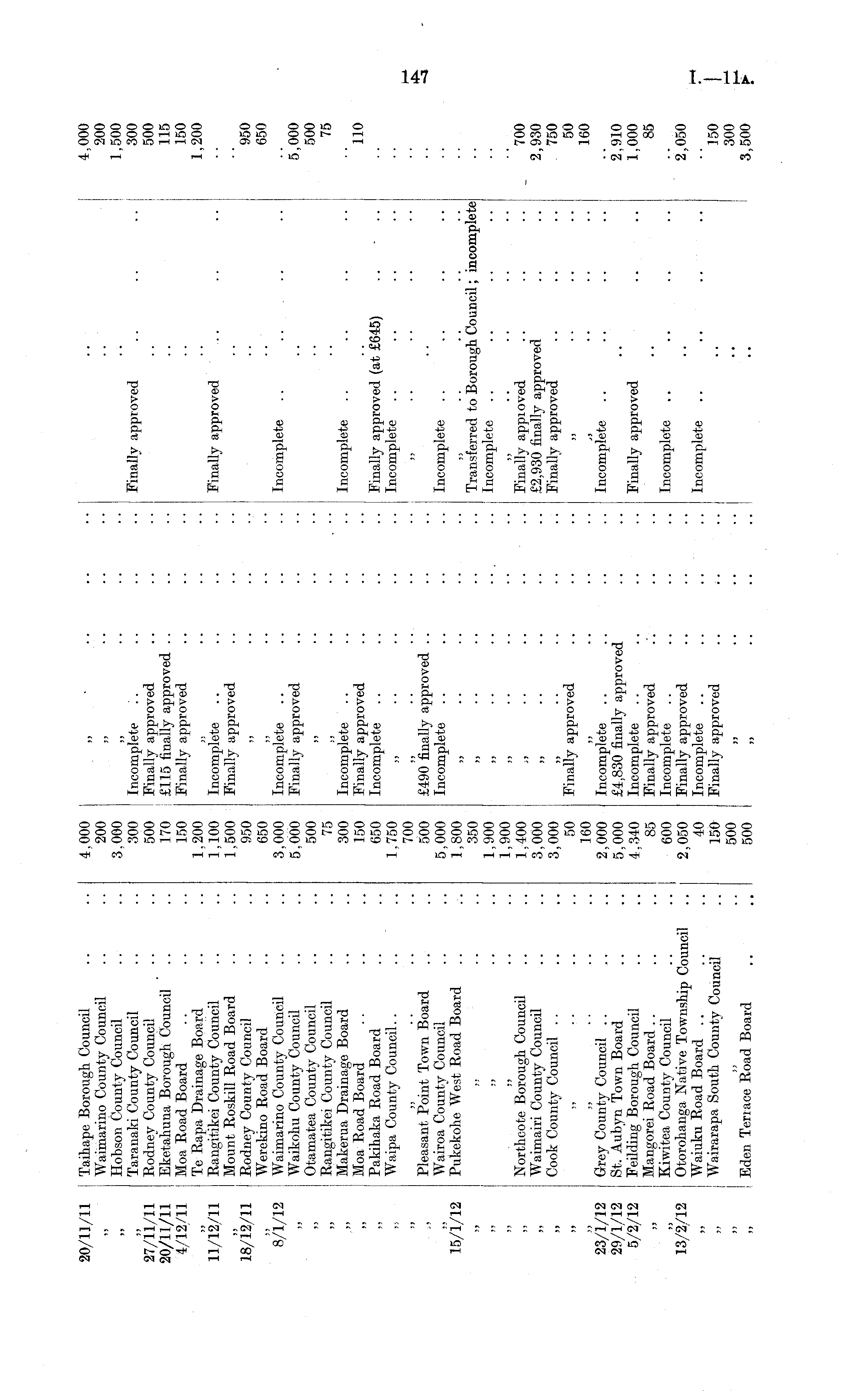 20/11/11 3) 27/11/11 20/11/11 4/12/11 11/12/11 18/12/11 8/1/12 3J 3) 35 . 3 3 33 33 33 !> Taihape Borough Council Waimarino County Council Hobson County Council Taranaki County Council Rodney County Council _ .. Eketahuna Borough Council Moa Road Board Te Rapa Drainage Board Rangitikei County Council Mount Roskill Road Board Rodney County Council Werekino Road Board Waimarino County Council Waikohu County Council Otamatea County Council Rangitikei County Council Makerua Drainage Board Moa Road Board Pakihaka Road Board Waipa County Council 33 • • • • Pleasant Point Town Board Wairoa County Council Pukekohe West Road Board 4,000 200 3,000 300 500 170 150 1,200 1,100 1,500 950 650 3,000 5,000 500 75 300 150 650 1,750 700 500 5,000 1,800 350 1,900 1,900 1,400 3,000 3,000 50 160 2,000 5,000 4.,340 85 600 2,050 40 150 500 500 3 3 " * * 33 * ' 33 * * Incomplete '.. Finally approved £115 finally approved .. Finally approved Incomplete Finally approved 33 ' * 33 • • Incomplete Finally approved 33 * * Incomplete Finally approved Incomplete 33 33 £490 finally approved .. Incomplete Finally approved Finally approved • • Incomplete .. .. ... Incomplete Finally approved (at £645) Incomplete 20( 1,50( 30( 50( 111 15( 1,201 951 651 5,001 501 7! 111 •• 15/1/12 Incomplete 33 ■ ' • • Transferred to Borough Council; incomplete Incomplete 33 33 33 33 35 Northcote Borough Council Waimairi County Council Cook County Council 33 • • • • ,, . . . . 33 • • • • 33 * • Finally appioved £2,930 finally approved Finally approved j, . . . . . . Incomplete Finally approved 70( 2,93( 75( 5( 16* 2,91( 1,00( 8! 3) 33 Finally approved a 23/1/12 29/1/12 5/2/12 33 Grey County Council St. Aubyn Town Board Feilding Borough Council Mangorei Road Board Kiwitea County Council Otorohanga Native Township Council Waiuku Road Board Wairarapa South County Council 33 ■ • Incomplete £4,830 finally approved Incomplete Finally approved Incomplete Finally approved Incomplete Finally approved 13/2/12 Incomplete 2,05( 33 3) Incomplete ■" i 15( 30( 3,50( SS Eden Terrace Road Board j) • • SS I 33 • •