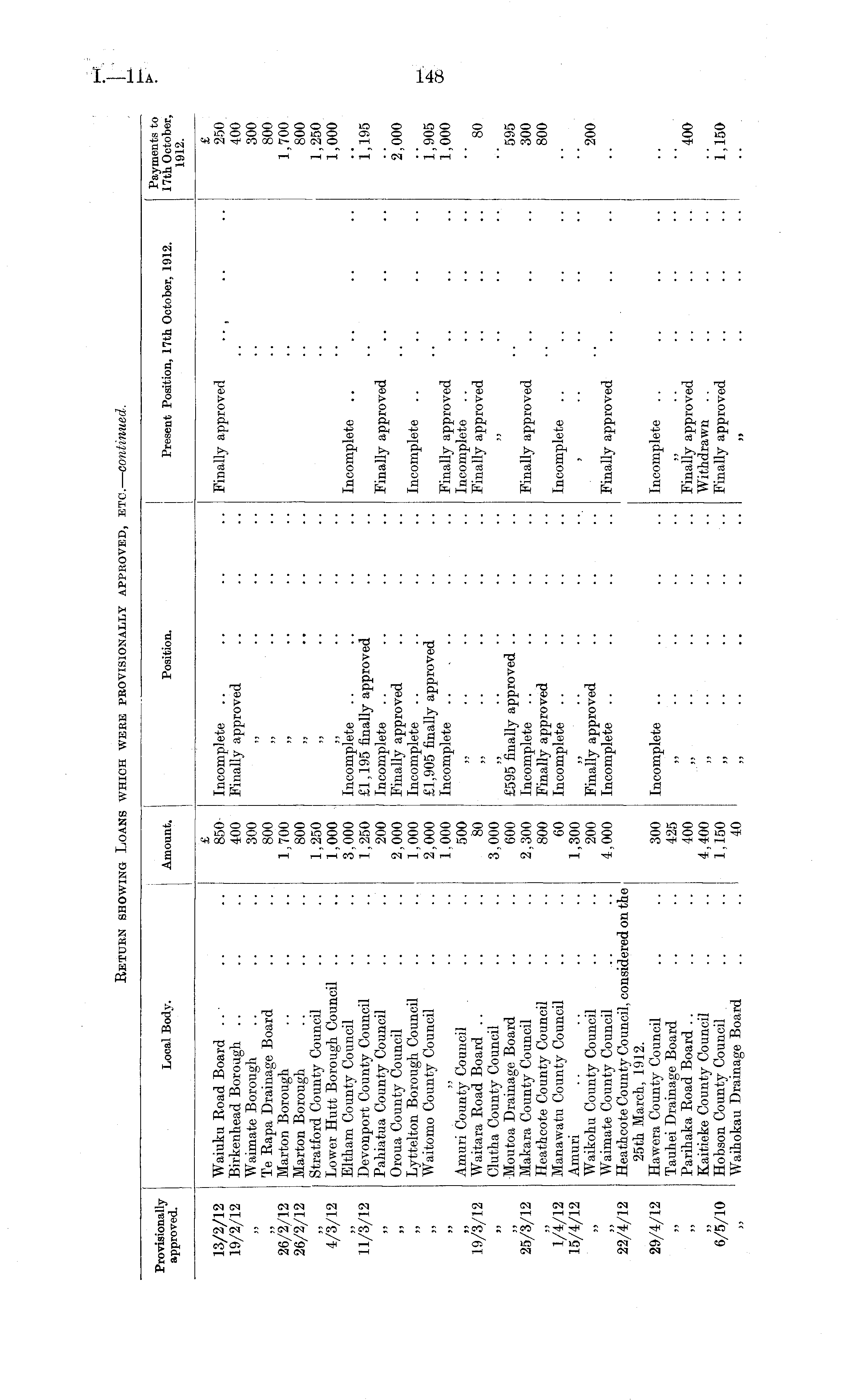 Provisionally approved. Local Body. Amount. Position. Present Position, 17th October, 1912. Payments to 17th October, 1912. 13/2/12 19/2/12 3) 26/2/12 26/2/12 Waiuku Road Board Birkenhead Borough Waimate Borough Te Rapa Drainage Board Marton Borough Marton Borough Stratford County Council Lower Hutt Borough Council Eltham County Council Devonport County Council Pahiatua County Council Oroua County Council Lyttelton Borough Council Waitomo County Council £ 850 400 300 800 1,700 800 1,250 1,000 3,000 1,250 200 2,000 1,000 2,000 1.000 500 80 3,000 600 2.300 800 60 1,300 200 4.000 Incomplete Finally approved 33 • ' 33 • • Finally approved * * I £ 250 400 300 800 1.700 800 1,250 1,000 33 • • 3) • • 4/3/12 33 • • 11/3/12 33 Incomplete £1,195 finally approved Incomplete Finally approved Incomplete £1,905 finally approved Incomplete Incomplete Finally approved i", 195 2*000 33 Incomplete L905 1,000 35 33 19/3/12 Amuri County Council Waitara Road Board Clutha County Council Moutoa Drainage Board Makara County Council Heathcote County Council Manawatu County Council Amuri Waikohu County Council Waimate County Council Heathcote County Council, considered on the 25th March, 1912. Hawera County Council Tauhei Drainage Board Parihaka Road Board Kaitieke County Council Hobson County Council Waihokau Drainage Board 3 3 • • Finally approved Incomplete Finally approved 33 • • * • 80 is 25/3/12 33 * * * ' £595 finally approved .. Incomplete Finally approved Incomplete 33 Finally approved 595 300 800 1/4/12 15/4/12 Incomplete 33 33 Finally approved Incomplete 3 • • Finally approved 200 22/4/12 29/4/12 300 425 400 4,400 1,150 40 Incomplete Incomplete 33 33 * * * ' S3 • - Finally approved Withdrawn Finally approved 33 33 • * 400 6/5/10 1,150 33 ' • • ' 33 »>