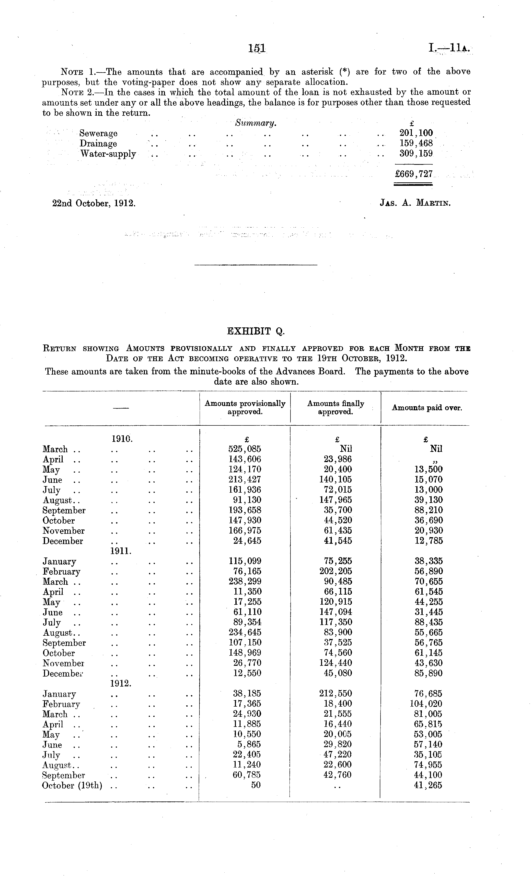 EXHIBIT Q. Return showing Amounts provisionally and finally approved for each Month from the Date of the Act becoming operative to the 19th October, 1912.