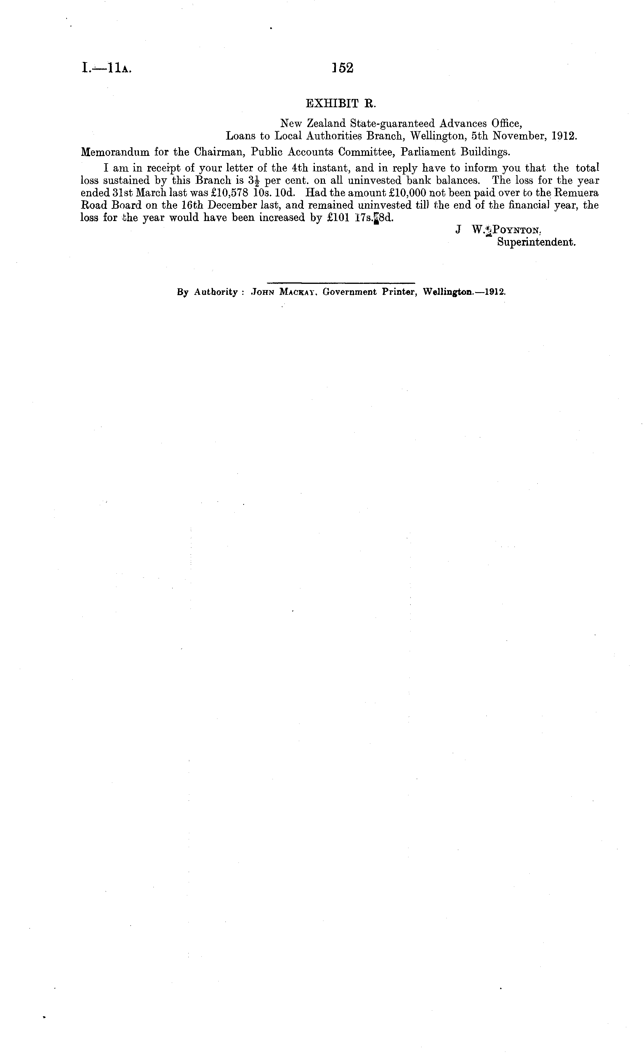 EXHIBIT R. New Zealand State-guaranteed Advances Office, Loans to Local Authorities Branch, Wellington, sth November, 1912. Memorandum for the Chairman, Public Accounts Committee, Parliament Buildings. I am in receipt of your letter of the 4th instant, and in reply have to inform you that the total loss sustained by this Branch is 3J per cent, on all uninvested bank balances. The loss for the year ended 31st March last was £10,578 10s. lOd. Had the amount £10,000 not been paid over to the Remuera Road Board on the 16th December last, and remained uninvested till the end of the financial year, the loss for the year would have been increased by £101 I7s.^Bd. J W.J Poynton. Superintendent.