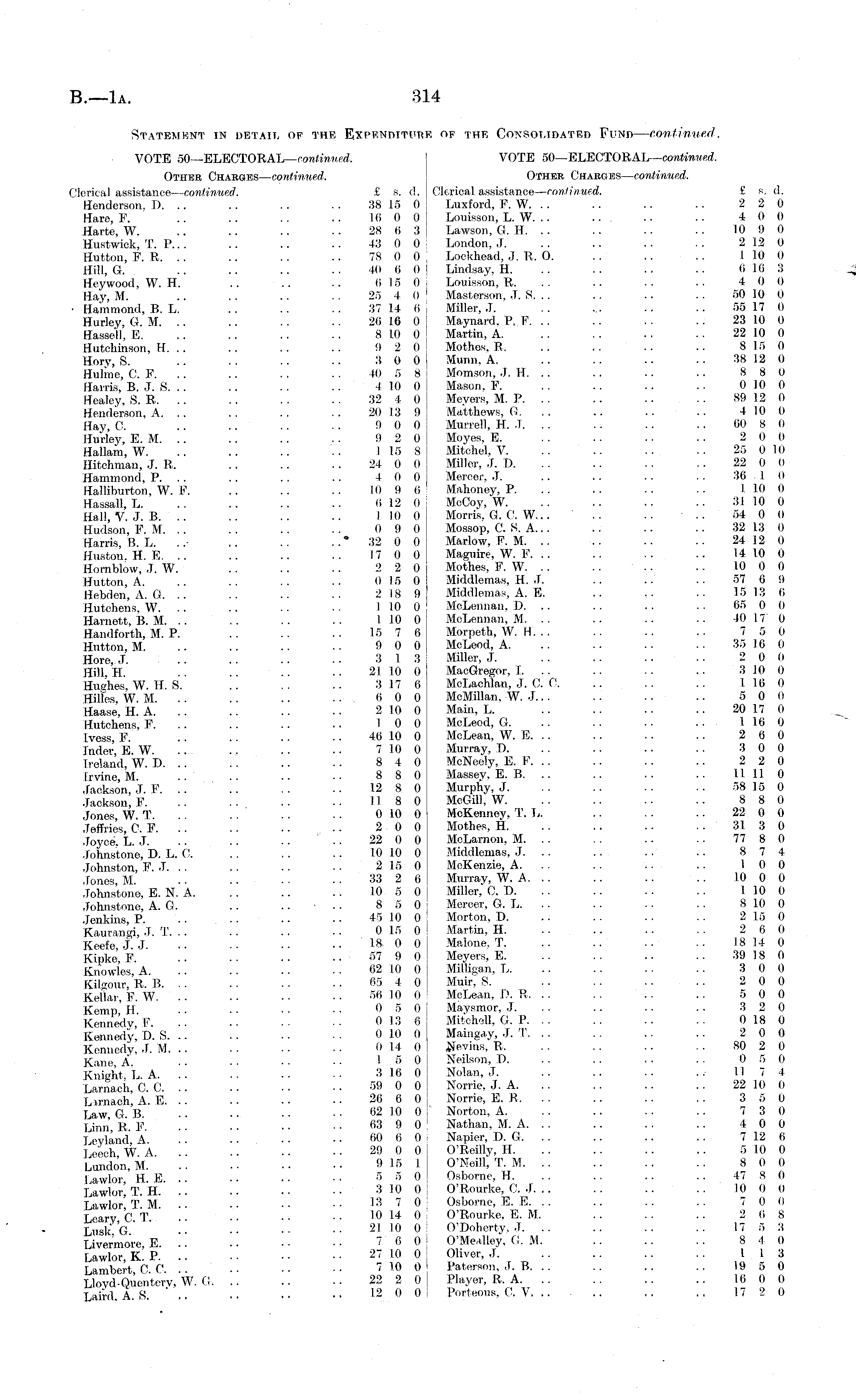 Statement in detail of the Expenditure °f the Consolidated Fund — continued. VOTE 50—ELECTORAL— continued. VOTE 50—ELECTORAL— continued. Other Chabguss— continued. Other Chargbs— continued. Clerical assistance— continued. £ s. c!. Clerical assistance — continued. £ s. d. Henderson. T). .. .. . . . . 38 IS 0 : Luxford, F. W. . . .. .. .. 2 2 0 Hare, F. .. .. . . .. 16 0 0 Louisson, L. W. .. .. . . .. 4 0 0 Harte, W. .. .. .. .. 28 6 3 Lawson, G. H. .. .. .. .. 10 9 0 Hustwiok, T. P... .. .. .. 43 0 0 London, J. .. .. .. .. 212 0 Hutton, F. R. .. .. .. .. 78 0 0 Lookhead, J. R. O. .. .. .. 110 0 Hill, G. .. .. .. . . 40 (i 0 Lindsay, H. .. .. .. .. 616 3 Hey wood, W. H. .. .. .. 615 0 Lonisson, R. .. .. .. .. 4 0 0 Hay M. .. .. .. . . 25 40 ' Masterson, .T. S. .. .. .. . . 50 10 0 • Hammond, B. L. .. .. .. :{7 14 (i Miller,.). .. ... .. .. 55 17 0 Hurley, G. M. .. .. .. .. 26 16 0 Maynard. P, F. . . .. .. . . 23 1.0 0 Hassel), E. .. . . . . .. 810 0 Martin, A. .. .. .. .. 22 10 0 Hutchinson, H. .. .. .. .. 9 2 0 Mothes, R. .. .. .. .. 8 15 0 Hory, S. .. .. .. .. 30 0 Munn, A. .. .. .. .. 38 12 0 Hulme, C. F. . . .. .. .. 40 5 8 : Momson, J. H. .. .. .. .. 8 8 0 Harris B. J. S. .. .. .. .. 1 10 0 Mason, F. .. .. .. .. 0 10 0 Healey, S. R, .. . . .. .. 32 4 0 I Meyers, M. P. .. .. .. .. 89 12 0 Henderson, A. . . .. .. . . 20 13 9 Matthews, G. . . .. . . .. 4 10 0 Hay, C. . . .. . . . . 90 0 Murrell, H. ,T. .. . . .. . . 00 S 0 Hurley, E. M. .. .. .. . . 9 2 0 Moyes, E. . . . . .. .. 2 0 0 Hallam, W. .. .. .. .. I 15 8 I Mitchel, V. .. .. .. .. 25 0 10 Hitchman, J. R. .. .. . . 24 00 J Miller, J. D. .. .. .. . . 22 0(I Hammond, P. .. .. . . .. 4 0 0 Mercer, J. .. .. .. . . 36 1 0 Halliburton, W. F. .. .. .. 10 9 6 Mahoney, P. .. .. .. .. LlO 0 Hassall, L. .. .. .. .. 612 0 McCoy, W. .. .. .. .. 31 10 0 Hall, V. J. B. .. .. .. .. I 10 0 ! Morris. G. ('. W... .. .. .. 54 0 0 Hudson, FM. . . . . .. .. 0 9 0 Mossop, C. S. A... . . .. .. 32 13 0 Harris, B. L. ..- .. .. .. * 32 0 0 Mftriow, F. M. .. .. .. .. 24 12 0 Huston. H. E. .. .. .. .. 1700! Maguire, W. F. .. .. .. .. 14 10 0 Homblow, J. W. . . .. .. 2 2 0 : Mothes, F. W. .. .. .. .. 10 0 0 Hutton, A. .. .. .. .. OIS 0 Middlemas, H. J. .. .. .. 57 6 !) Hebden, A. G. .. .. .. .. 218 9 Middlemas, A. E. .. .. .. 15 13 6 Hutchens, W. .. .. .. .. 1 10 0 McLennan, D. .. .. .. 65 0 0 Harriett, B. M. .. .. .. .. I 10 0 McLennan, M. .. .. .. .. 40 17 0 Handforth, M. P. .. .. .. 15 7 6 Morpeth, W. H. .. .. .. .. 7 5 0 Button, M. .. .. ■■ •• 9 0 0 McLeod, A. .. .. .. .. 35 16 0 Hore, J. .. . . .. • • 3 13 Miller, J. .. .. .. .. 2 0 0 Hill, H. .. .. •• •• 21 10 0 : MacGregor, 1. .. .. .. .. 310 0 Hughes, W. H. S. .. .. .. 317 6 McLachlan, J. O. ('. .. .. .. 116 0 Hilles W. M. . . .. .. . ■ (i 0 0 McMillan, W. J. .. .. .. .. 5 0 0 Haase, H. A. .. .. . • ..2100 Main, L. .. .. . . .. 20 17 0 Hutchens, F. .. .. . . .. 10 0 McLeod, G. .. . . .. .. 116 0 Ivess, F. .. .. . . • • 46 10 0 McLean, W. E. .. .. .. .. 2 6 0 Inder, E. W. .... .. .. •• 710 0 Murray, D. .. .. .. .. 3 0 0 Ireland, W. D. .. .. .. .'. 8 4 0 McNeely, E. V. .. .. .. .. 2 2 0 Irvine, M. .. .. .. •■ 8801 Massey, E. B. .. .. .. .. 11 11 0 Jackson j. F. .. .. .. .. 12 8 0 Murphy, J. .. .. .. .. 58 15 0 Jackson, F .. •• 11 8 0 McGill, W 8 8 0 Jones, W. T .. .. 010 0 McKenney, T. L. 22 0 0 Jeffries, C. F. .. .. .. .. 2 0 0 Mothes, H. .. .. .. .. 31 3 0 Joyce L. J. .. .. • • • ■ 22 0 0 McLarnon, M. .. . . .. .. 77 8 0 Johnstone, D. L. C. .. .. .. 10 10 0 Middlemas, J. .. .. .. .. 8 7 4 Johnston, F. J. . . .. .. ■ ■ 215 0 McKenzie, A. .. .. .. 10 0 Jones M .. .. . ■ •• 33 2 6 Murray, W. A. .. .. .. .. 10 0 0 Johnstone, E. N. A. .. .. .. 10 50 j Miller, C. D. .. .. .. .. 110 0 Johnstone, A. G. .. .. • . . 8 5 0 Mercer, G. L . . 810 0 fenkins P • • 45 10 0 Morton, 1"). .. . . . . .. 215 0 Kaurangi, J. T. . . .. .. .. 015 0 Martin, H. . . .. .. . . 2 6 0 Keefe J J •• ■■ •• ■■ l « 0 0 Malone, T. .. .. .. .. 18 14 0 Kipke F . • • ■ • .. 57 9 0 Meyers, E. .. .. .. .. 39180 Knowles,'A 62 10 0 Mffligan, L 3 0 0 Kilgour, R. P.. . . . ■ • • ■ • 65 4 0 I Muir, S. .. .. .. . . 2 0 0 Kellar, F. W. .. • ■ ■ • 56 10 0 McLean, l>. P.... . . .. . . 500 Kemp' H • ■ ..050 Maysmor, J. .. .. .. 320 Kennedy,' F. .. ••••• • 0 13 6 Mitchell, G. P. . . .. .. .. 018 0 Kennedy! D. S. .. .. • • • ■ 010 0 ; Maingay, J. T. .. .. .. .. 20 0 Kennedy, J. M 0 14 0 I Bfevins, R 80 2 0 Kane, A. ■ ■ 15 0 Neilson, 0 .. 0 5 0 Knight, L. A. .. .. •■ ■■ 316 0 Nolan, J. .. .. .. .. 11 7 4 Larnaeh, C. C .. .. 59 0 0 Nome, J. A 22 10 0 Lunach, A. E 26 6 0 Norrie, E. R 3 5 0 Law G B . ■ • • • ■ ■ 62 10 0 ' Norton, A. . . .. .. .. 7 3 0 Linn R. F .. • • ■ ■ • • *'•* 9 0 : Nathan, M. A. . . .. . . .. 4 0 0 LevlandA .. .. •■ •• t>o 6 0 Napier, D. G. .. .. .. .. 712 6 Leeoh, W. A 29 0 0 O'Reilly, H 510 0 Lundon, M 915 1 O'Neill, T. M 8 0 0 lawlor HE. .. •■ •■ 5 5 0 1 Osborne, H. .. .. .. .. 47 8 0 Lawlor' T H .. .. •■ ■■ 310 0 O'Rourke, C. J. .. .. .. .. 10 0 0 Lawlor, T. M 13 7 0 Osborne, E. E .. 7 0 0 learv C T ■• ■• 10 14 0 O'Rourke, E. M. .. .. .. 2 (i 8 TuskG ' •• -' l 0 ° O'Dolierty, J. .. .. .. .. 17 5 3 Livermore. E. '.'. 7 0 0 O'Mealley, G. M. 8 4 0 Lawlor, K. P 27 10 0 Oliver, J 113 Lambert, C. C 710 0 Paterson, J. B 19 5 0 TJoyd-Quenterv, W. G 22 2 0 : Player, R. A 16 0 0 Lai ;, d A. S. " .. •■ •• 12 0 0 Porteous, C. V. .. .. .. .. 17 2 0